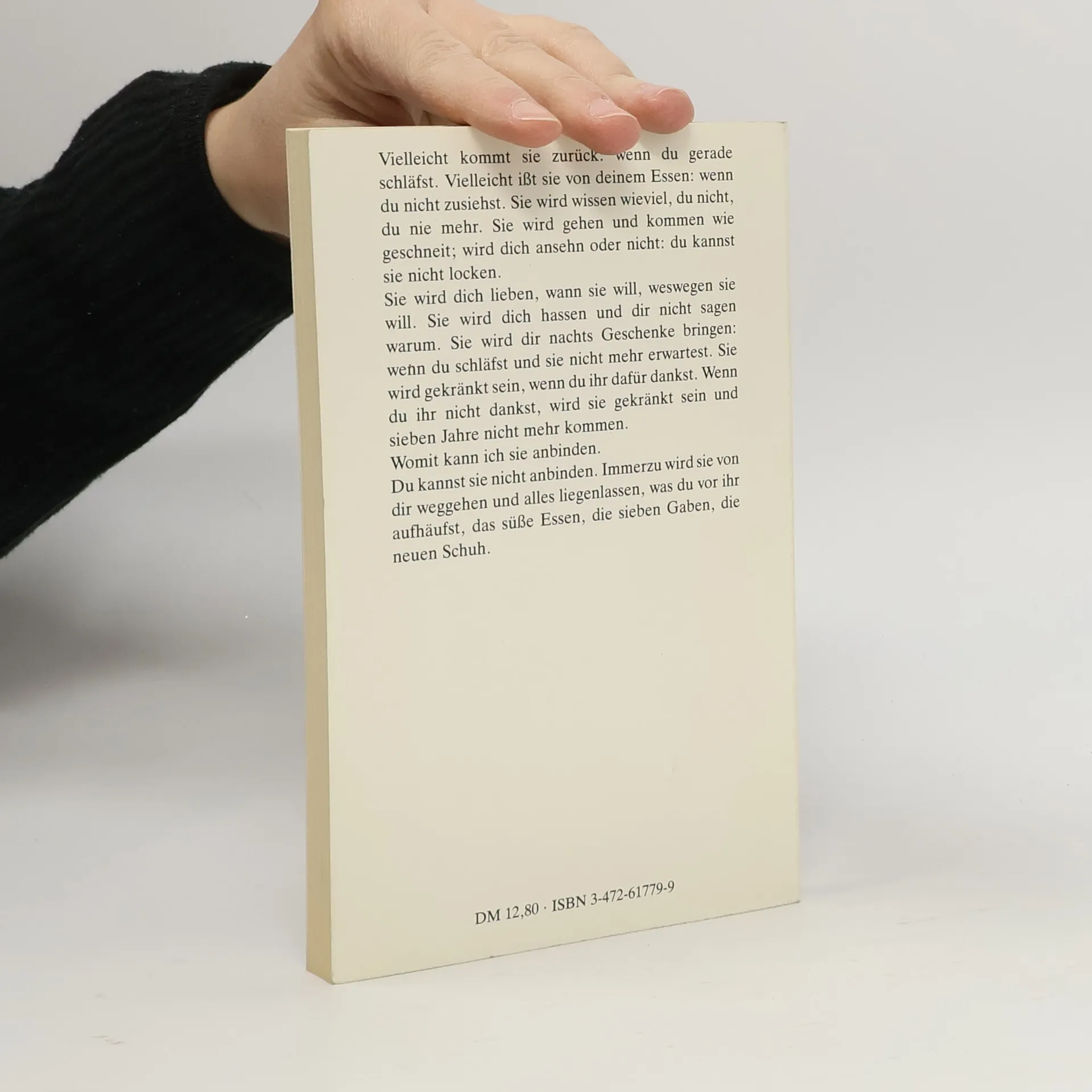 Vielleicht kommt sie zurück: wenn du gerade schläfst. Vielleicht isst sie von deinem Essen: wenn du nicht zusiehst. Sie wird wissen wieviel, du nicht, du nie mehr. Sie wird gehen und kommen wie geschneit; wird dich ansehen oder nicht: du kannst sie nicht locken. Sie wird dich lieben, wann sie will, weswegen sie will. Sie wird dich hassen und dir nicht sagen warum. Sie wird dir nachts Geschenke bringen: wenn du schläfst und sie nicht mehr erwartest. Sie wird gekränkt sein, wenn du ihr dafür dankst. Wenn du ihr nicht dankst, wird sie gekränkt sein und sieben Jahre nicht mehr kommen. Womit kann ich sie anbinden. Du kannst sie nicht anbinden. Immerzu wird sie von dir weggehen und alles liegenlassen, was du vor ihr aufhäufst, das süße Essen, die sieben Gaben, die neuen Schuh.