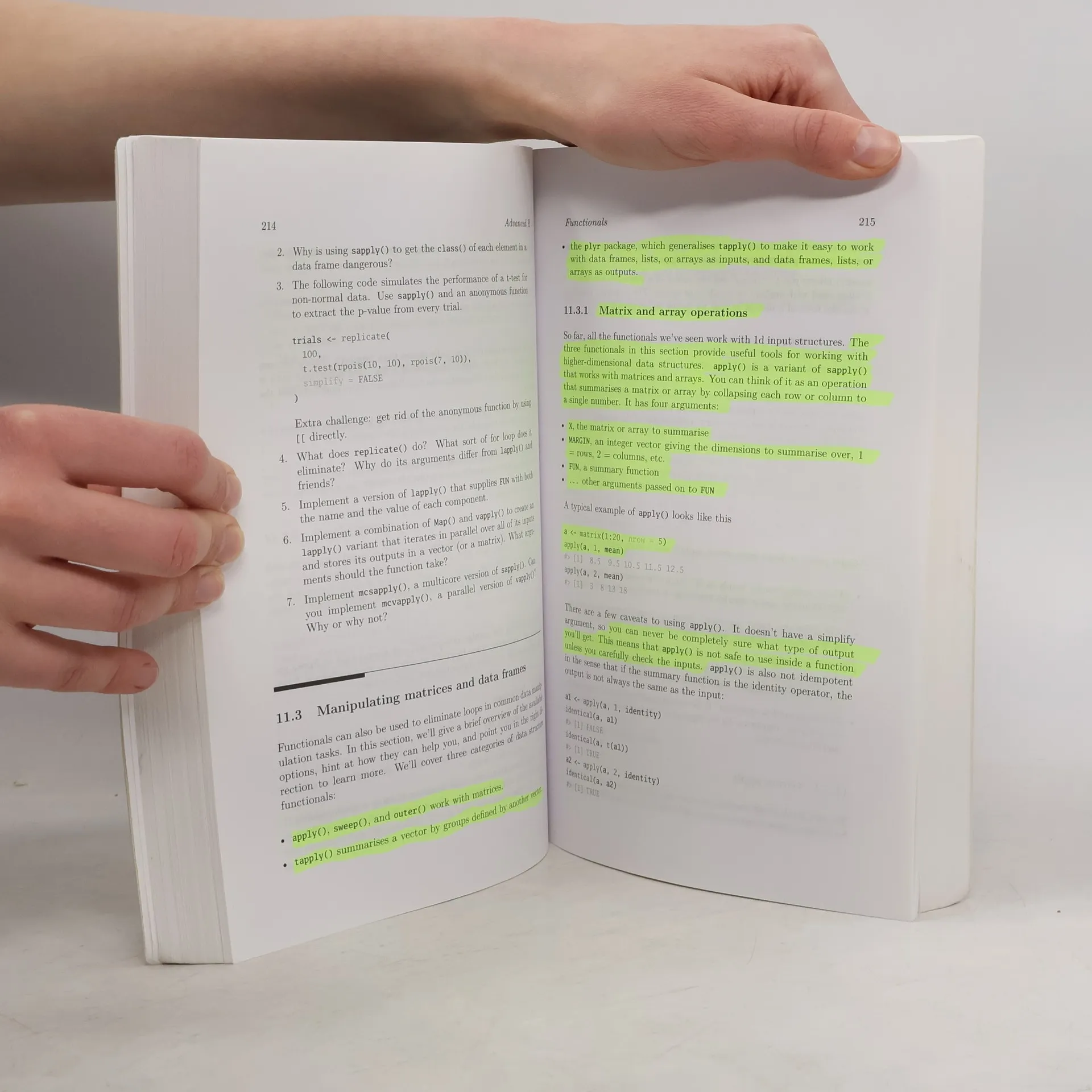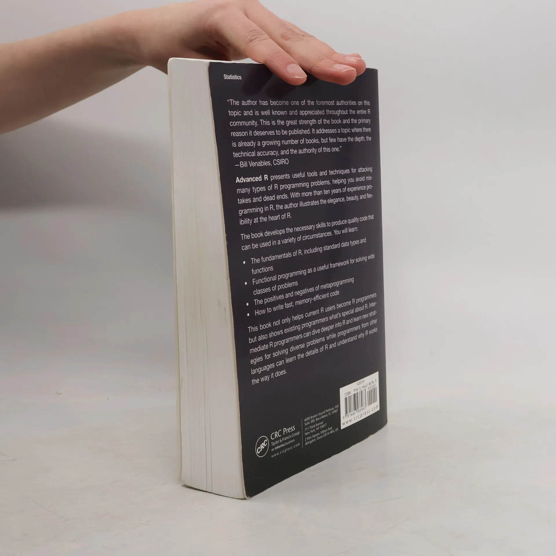 <em>An Essential Reference for Intermediate and Advanced R Programmers</em> <strong>Advanced R</strong> presents useful tools and techniques for attacking many types of R programming problems, helping you avoid mistakes and dead ends. With more than ten years of experience programming in R, the author illustrates the elegance, beauty, and flexibility at the heart of R. The book develops the necessary skills to produce quality code that can be used in a variety of circumstances. You will learn: The fundamentals of R, including standard data types and functions Functional programming as a useful framework for solving wide classes of problems The positives and negatives of metaprogramming How to write fast, memory-efficient code This book not only helps current R users become R programmers but also shows existing programmers what's special about R. Intermediate R programmers can dive deeper into R and learn new strategies for solving diverse problems while programmers from other languages can learn the details of R and understand why R works the way it does.