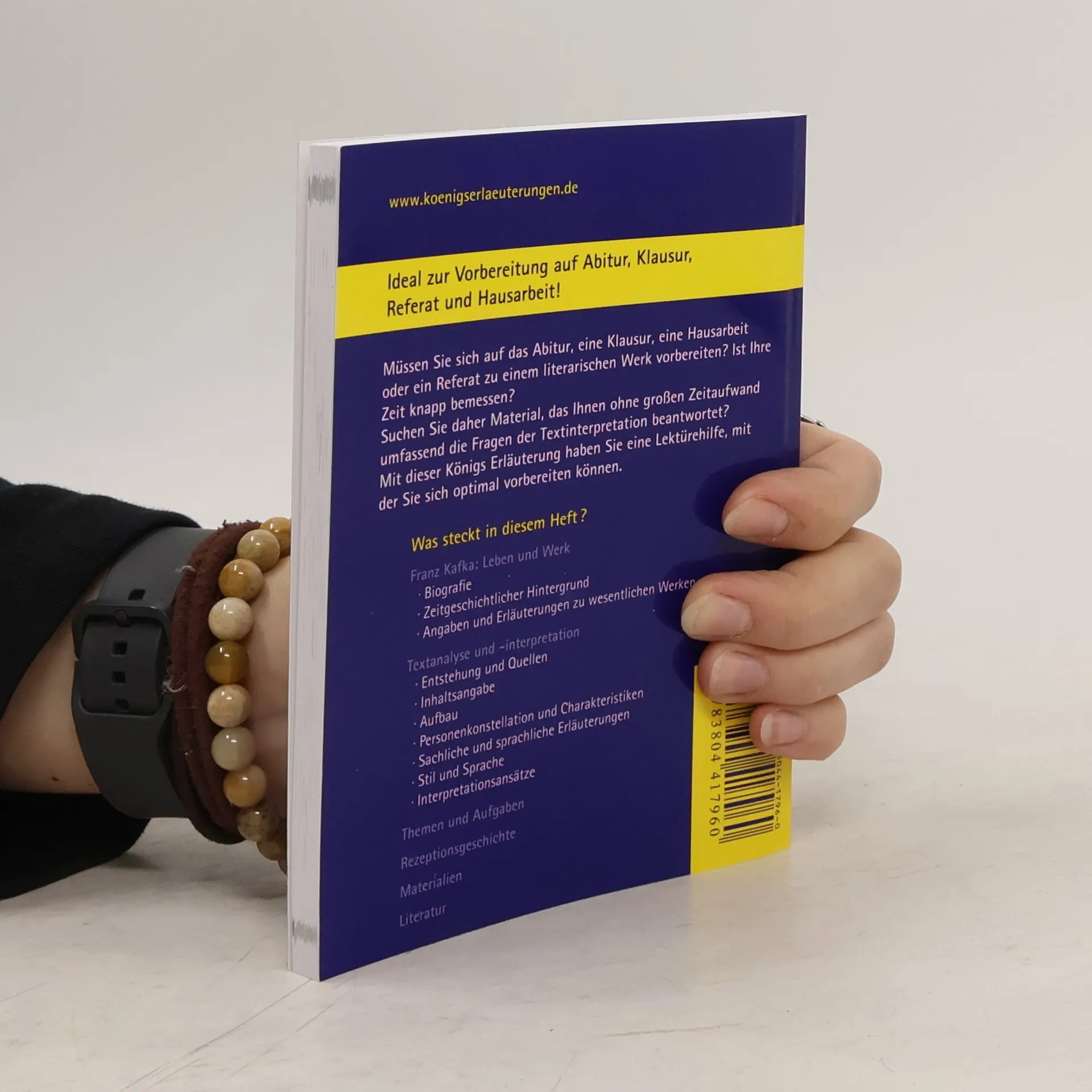 Königs Erläuterung zu Franz Der Proceß (Prozess) - Textanalyse und Interpretation mit ausführlicher Inhaltsangabe und Abituraufgaben.In einem Band bieten dir die neuen Königs Erläuterungen alles, was du zur Vorbereitung auf Referat, Klausur, Abitur oder Matura benötigst.Das spart dir lästiges Recherchieren und kostet weniger Zeit zur Vorbereitung.Alle wichtigen Infos zur Interpretation.- von der ausführlichen Inhaltsangabe über Aufbau, Personenkonstellation, Stil und Sprache bis zu Interpretationsansätzen- plus 4 Abituraufgaben mit Musterlösungen und 2 weitere zum kostenlosen Download. sowohl kurz als auch ausführlich.- Die Schnellübersicht fasst alle wesentlichen Infos zu Werk und Autor und Analyse zusammen.- Die Kapitelzusammenfassungen zeigen dir das Wichtigste eines Kapitels im Überblick - ideal auch zum Wiederholen.. und klar strukturiert.- Ein zweifarbiges Layout hilft dir Wesentliches einfacher und schneller zu erfassen.- Die Randspalte mit Schlüsselbegriffen ermöglichen dir eine bessere Orientierung.- Klar strukturierte Schaubilder verdeutlichen dir wichtige Sachverhalte auf einen Blick.. mit vielen zusätzlichen Infos zum kostenlosen Download.
