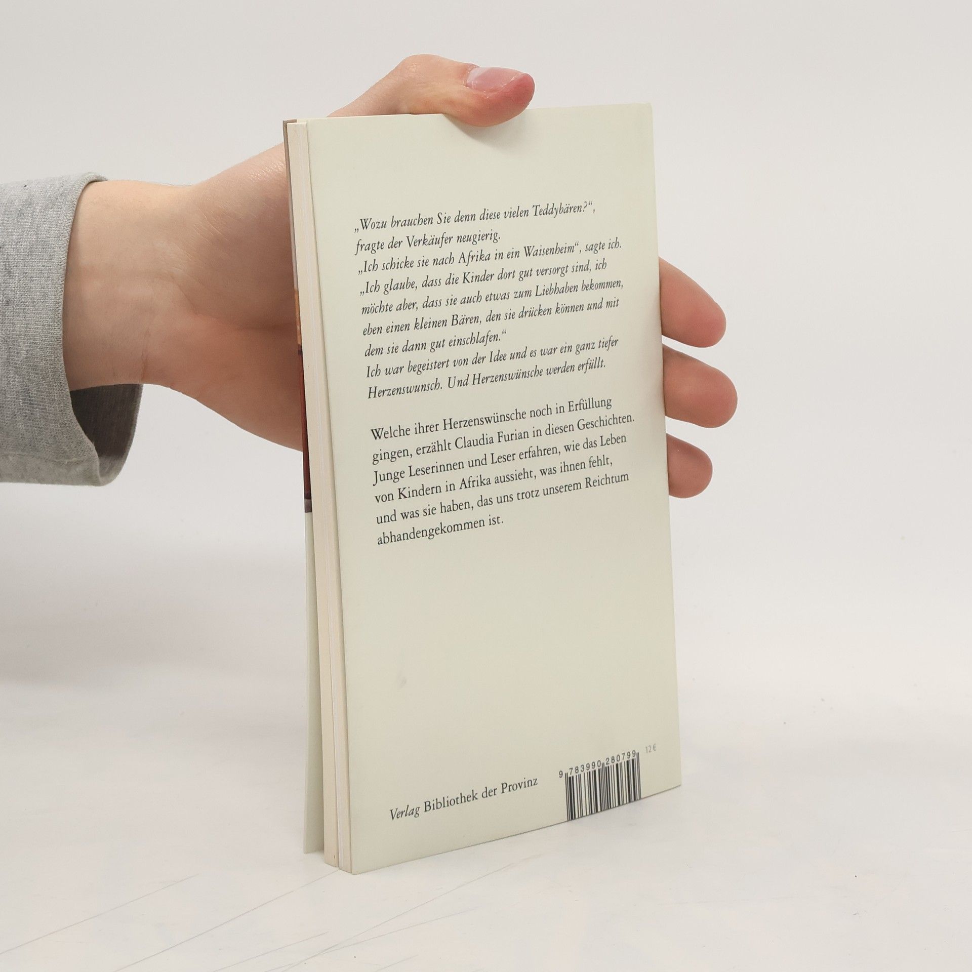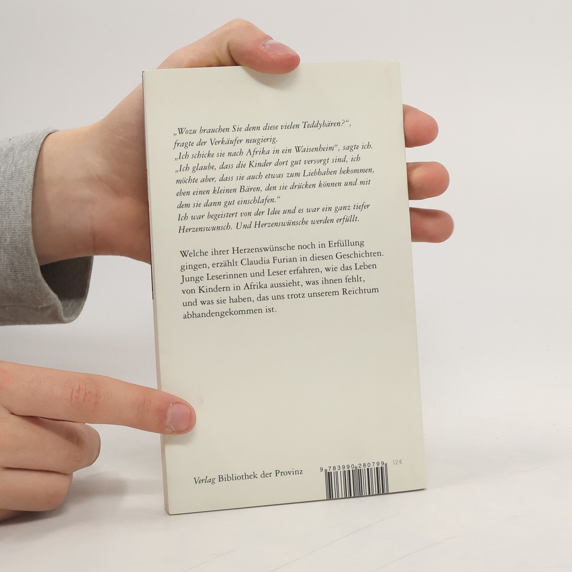 „Wozu brauchen Sie denn diese vielen Teddybären?“, fragte der Verkäufer neugierig. „Ich schicke sie nach Afrika in ein Waisenheim“, sagte ich. „Ich glaube, dass die Kinder dort gut versorgt sind, ich möchte aber, dass sie auch etwas zum Liebhaben bekommen, eben einen kleinen Bären, den sie drücken können und mit dem sie dann gut einschlafen.“ Ich war begeistert von der Idee und es war ein ganz tiefer Herzenswunsch. Und Herzenswünsche werden erfüllt. Welche ihrer Herzenswünsche noch in Erfüllung gehen, erzählt Claudia Furian in diesen Geschichten. Junge Leserinnen und Leser erfahren, wie das Leben von Kindern in Afrika aussieht, was ihnen fehlt, und was sie haben, das uns trotz unserem Reichtum abhandengekommen ist.