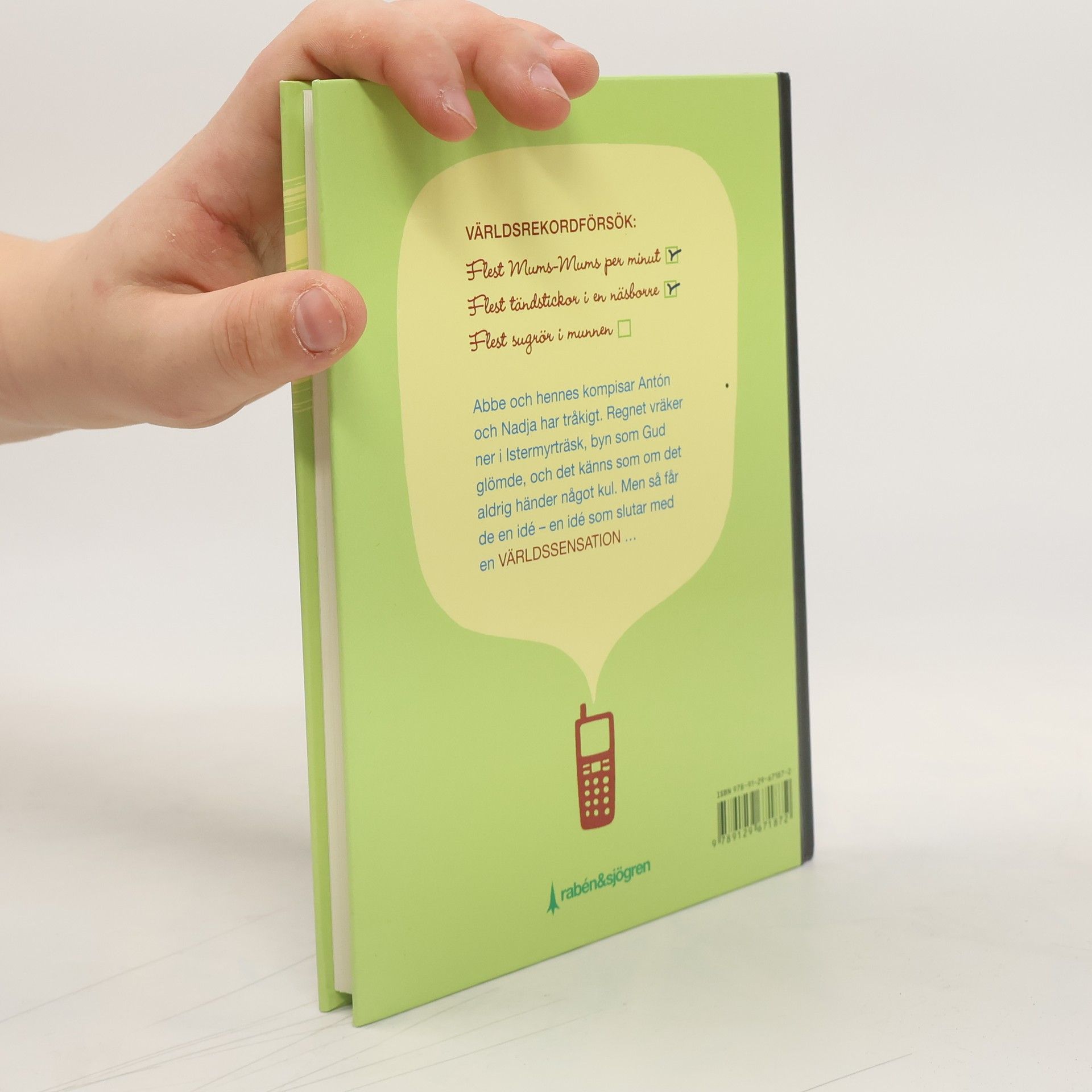 Abbe och hennes kompisar Antón och Nadja ger sig tusan på att få till en riktigt redig världssensation i det lilla samhället Istermyrträsk där de tillbringar sommaren.Bered er på storartade världsrekordförsök i mums-mumsätning, tändstickor instoppade i näsan, kast med litet grässtrå och mycket mer. Samt halsbrytande humor och mycket fniss förstås!Istermyrträskborna får huka sig - snart är ingenting sig likt ..."Hela eftermiddagen satt vi på bibblan och bläddrade igenom Guinness rekordbok. Vi letade rekord som vi skulle kunna slå.Till slut pekade Antón på en bild av en kille som hade massor av sugrör instoppade i munnen.- Jag får in fler, sa han tvärsäkert.- Aldrig, sa jag. Han har ju mycket större mun än du. Han är vuxen för det första och för det andra har han säkert gjort muntöjningsövningar i flera år!- Jag får in fler, sa Antón.Jag vet faktiskt inte varför jag och Nadja lät honom försöka ..."