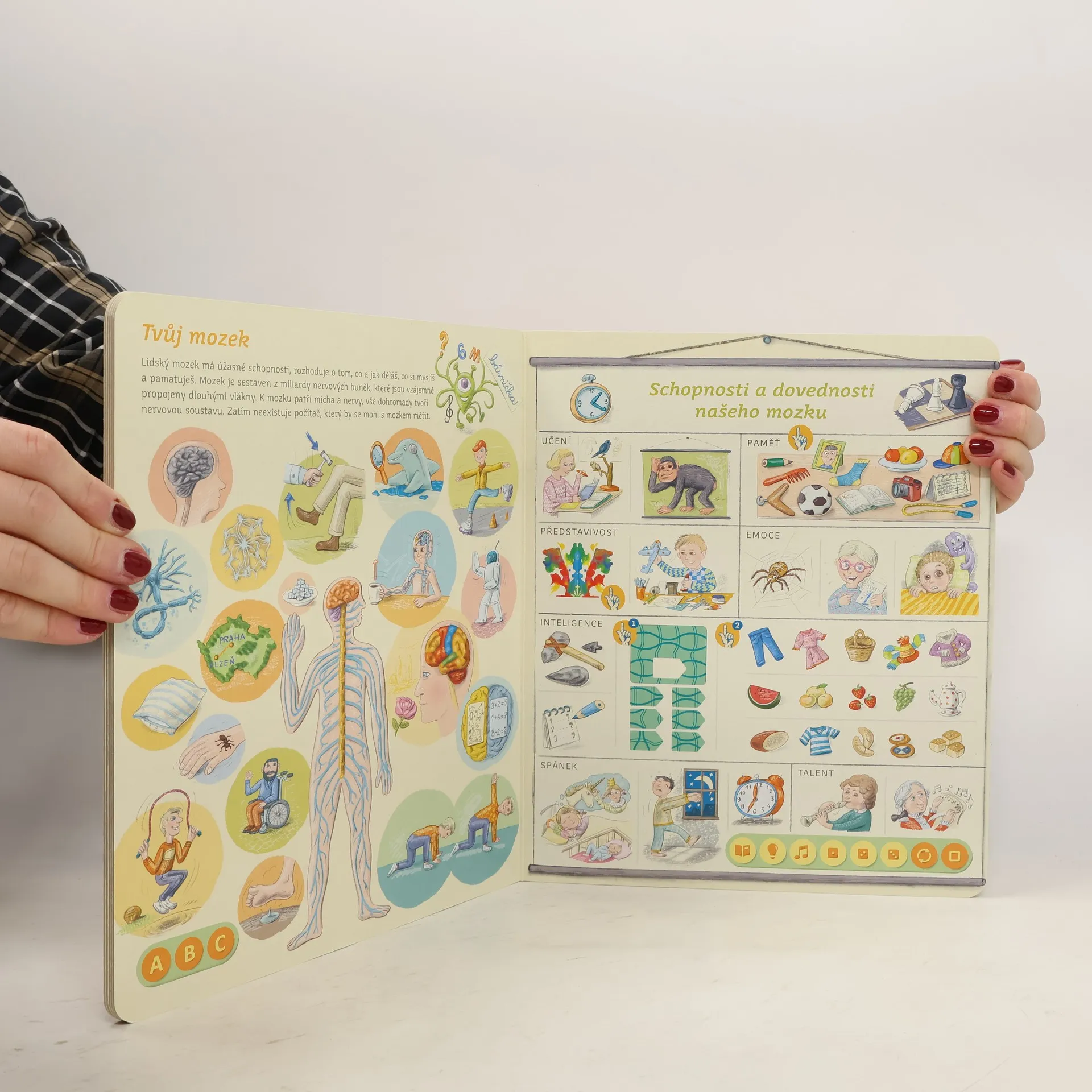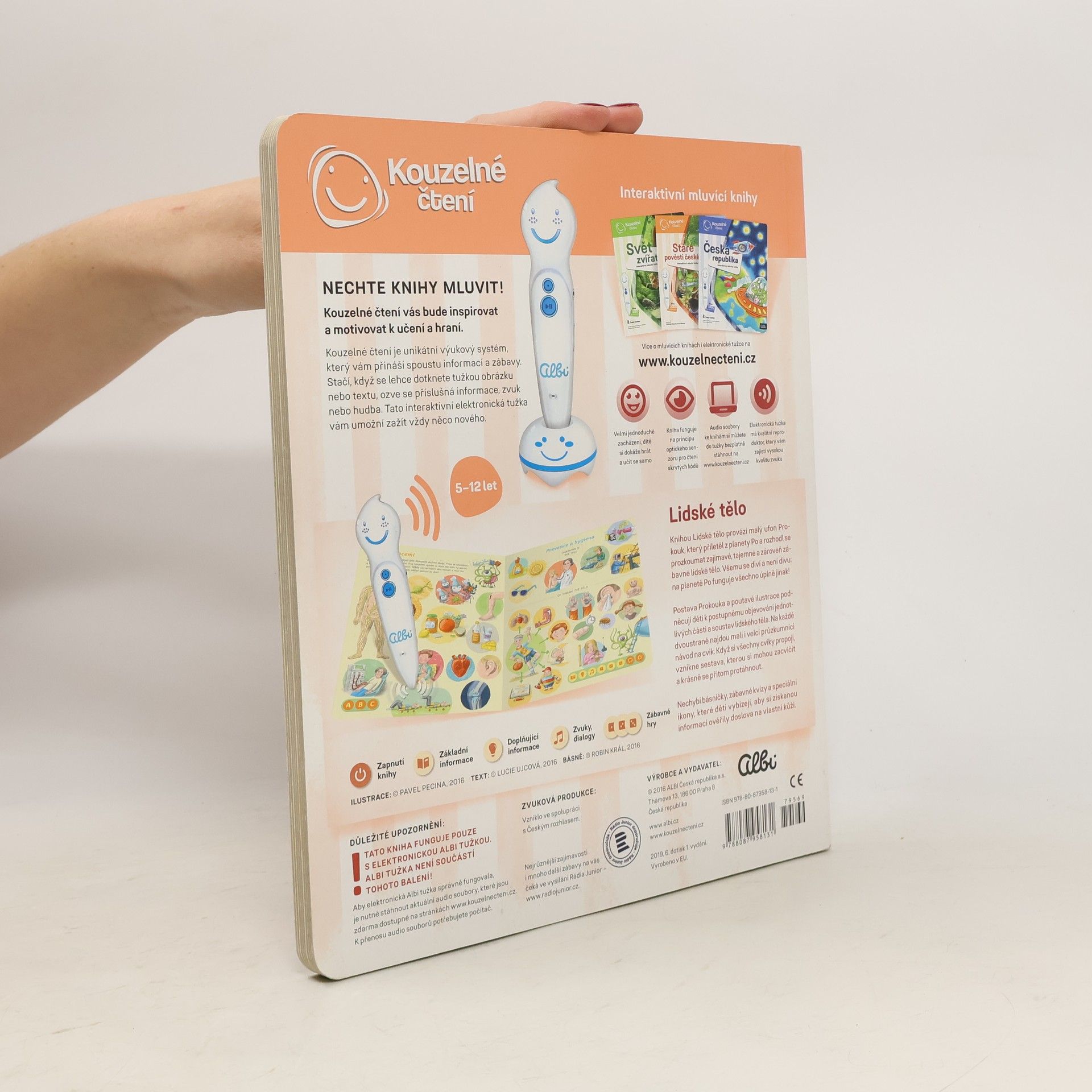 Interaktivní mluvící kniha z edice Kouzelné čtení, se kterou se děti již od 3 let dozvědí spoustu zajímavých a užitečných informací o našem těle. Knihou Lidské tělo provází malý ufon Prokouk, který přiletěl z planety Po, aby prozkoumal taje lidského těla. Všemu se diví a není divu: na planetě Po funguje všechno úplně jinak! Postava Prokouka a poutavé ilustrace podněcují děti k postupnému objevování jednotlivých částí a soustav lidského těla. Kniha je členěna do 8 kapitol a témata jsou např. Kosti a svaly, Mozek a nervy, Rozmnožování, Trávicí soustava, Srdce a plíce atd. Na každé dvoustraně najdou malí i velcí průzkumníci návod na cvik. Když si všechny cviky propojí, vznikne sestava, kterou si mohou zacvičit a krásně se přitom protáhnout. V knize Lidské tělo najdete také básničky, zábavné kvízy a speciální ikony, které děti vybízí, aby si získanou informaci zkusili doslava na vlastní kůži. Kniha obsahuje téměř 2000 zvuků a textů. Knihu ilustroval Pavel Pecina, básničky napsal Robin Král, texty Lucie Ujcová. Vzniklo ve spolupráci s Českým rozhlasem, knihu namluvili Tereza Bebarová a Jaroslav Plesl.