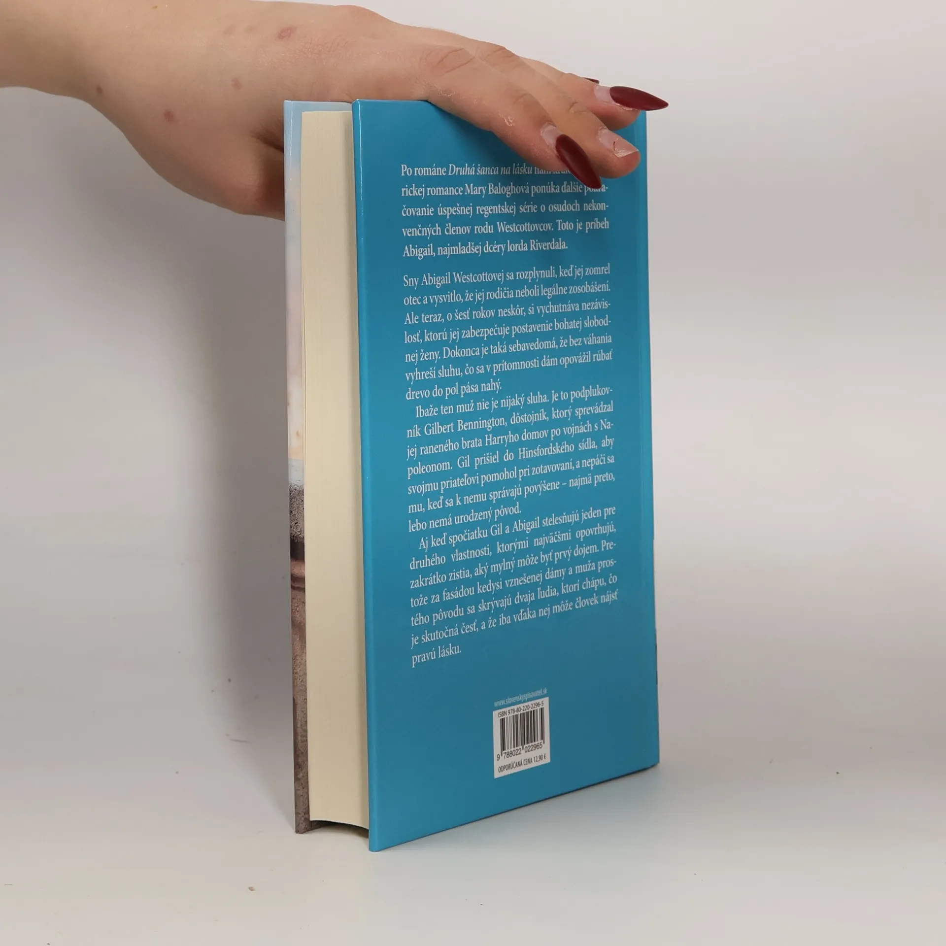 Po románe Druhá šanca na lásku nám kráľovná historickej romance Mary Baloghová ponúka ďalšie pokračovanie úspešnej regentskej série o osudoch nekonvenčných členov rodu Westcottovcov. Toto je príbeh Abigail, najmladšej dcéry lorda Riverdala. Sny Abigail Westcottovej sa rozplynuli, keď jej zomrel otec a vysvitlo, že jej rodičia neboli legálne zosobášení. Ale teraz, o šesť rokov neskôr, si vychutnáva nezávislosť, ktorú jej zabezpečuje postavenie bohatej slobodnej ženy. Dokonca je taká sebavedomá, že bez váhania vyhreší sluhu, čo sa v prítomnosti dám opovážil rúbať drevo do pol pása nahý. Ibaže ten muž nie je nijaký sluha. Je to podplukovník Gilbert Bennington, dôstojník, ktorý sprevádzal jej raneného brata Harryho domov po vojnách s Napoleonom. Gil prišiel do Hinsfordského sídla, aby svojmu priateľovi pomohol pri zotavovaní, a nepáči sa mu, keď sa k nemu správajú povýšene – najmä preto, lebo nemá urodzený pôvod. Aj keď spočiatku Gil a Abigail stelesňujú jeden pre druhého vlastnosti, ktorými najväčšmi opovrhujú, zakrátko zistia, aký mylný môže byť prvý dojem. Pretože za fasádou kedysi vznešenej dámy a muža prostého pôvodu sa skrývajú dvaja ľudia, ktorí chápu, čo je skutočná česť, a že iba vďaka nej môže človek nájsť pravú lásku.