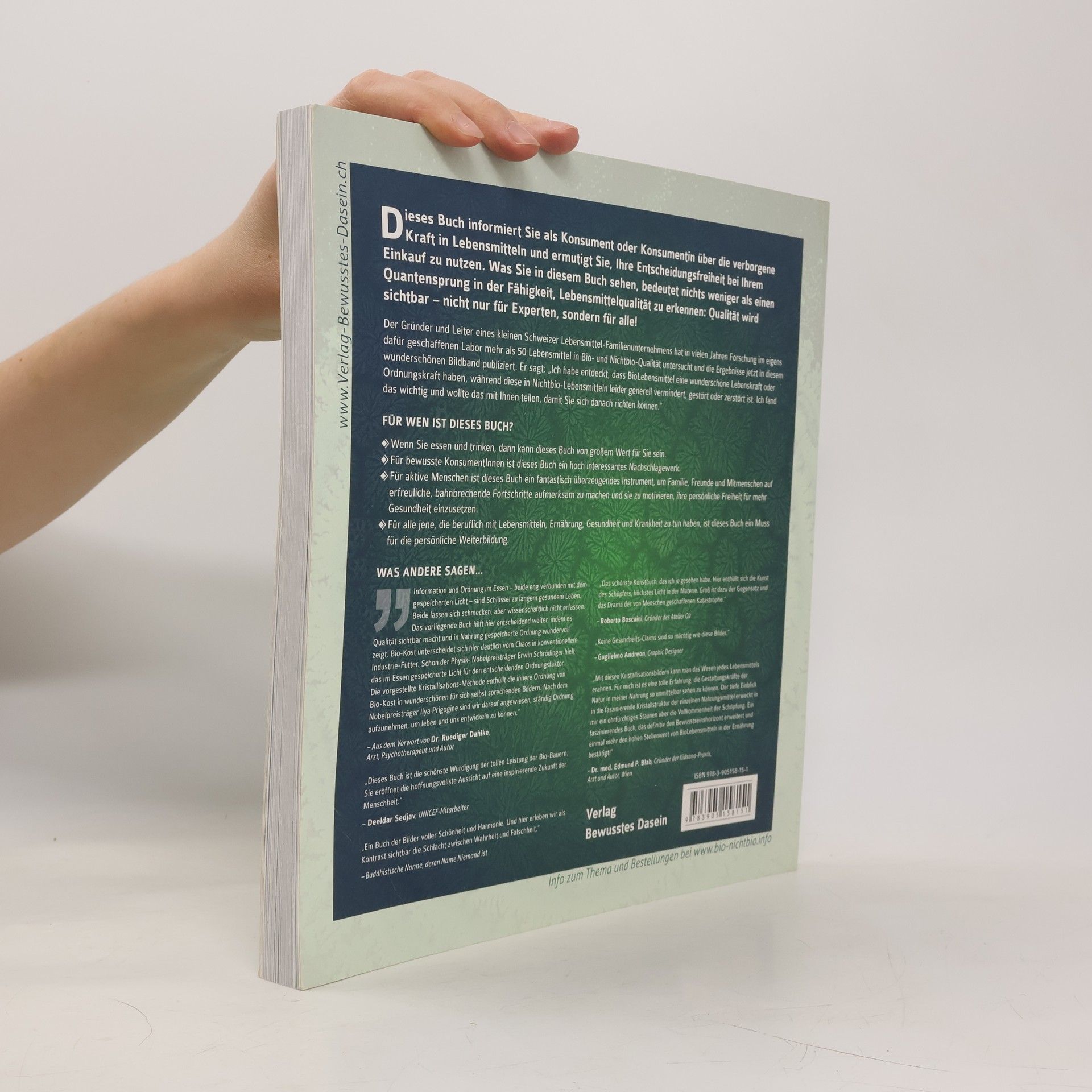 Dieses Buch informiert KonsumentInnen über die verborgene Kraft in Lebensmitteln und ermutigt zur Nutzung der Entscheidungsfreiheit beim Einkauf. Es bietet einen Quantensprung in der Fähigkeit, Lebensmittelqualität zu erkennen: Qualität wird sichtbar – für alle! Der Gründer eines Schweizer Lebensmittelunternehmens hat jahrelang in einem speziellen Labor Lebensmittel in Bio- und Nichtbio-Qualität untersucht und die Ergebnisse in diesem Bildband veröffentlicht. Er stellt fest, dass Bio-Lebensmittel eine bemerkenswerte Lebenskraft besitzen, während diese in Nichtbio-Lebensmitteln oft vermindert oder zerstört ist. Mit 753 Abbildungen bietet das Buch einen neuen Einblick in Lebensmittel-Qualität. Es ist von großem Wert für alle, die essen und trinken, und dient bewussten KonsumentInnen als interessantes Nachschlagewerk. Aktive Menschen können es nutzen, um Familie und Freunde auf bahnbrechende Fortschritte aufmerksam zu machen. Für alle, die beruflich mit Lebensmitteln, Ernährung, Gesundheit und Krankheit zu tun haben, ist es ein unverzichtbares Werk.