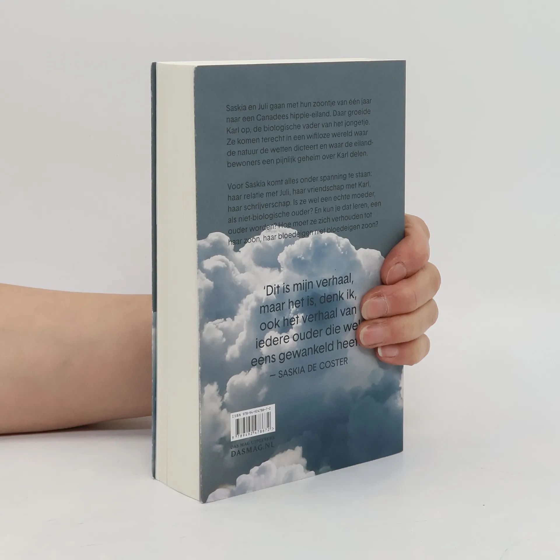 ‘Dit is mijn verhaal, maar het is, denk ik, ook het verhaal van iedere ouder die wel eens gewankeld heeft.’ – Saskia De Coster Saskia en Juli gaan met hun zoontje van één jaar naar een Canadees hippie-eiland. Daar groeide Karl op, de biologische vader van het jongetje. Ze komen terecht in een wifiloze wereld waar de natuur de wetten dicteert en waar de eilandbewoners een pijnlijk geheim over Karl delen. Voor Saskia komt alles onder spanning te staan: haar relatie met Juli, haar vriendschap met Karl, haar schrijverschap. Is ze wel een echte moeder, als niet-biologische ouder? En kun je dat leren, een ouder worden? Hoe moet ze zich verhouden tot haar zoon, haar bloedeigen niet bloedeigen zoon? Saskia de Coster (1976) is auteur van een eigenzinnig oeuvre. Haar werk werd in meer dan tien talen vertaald.