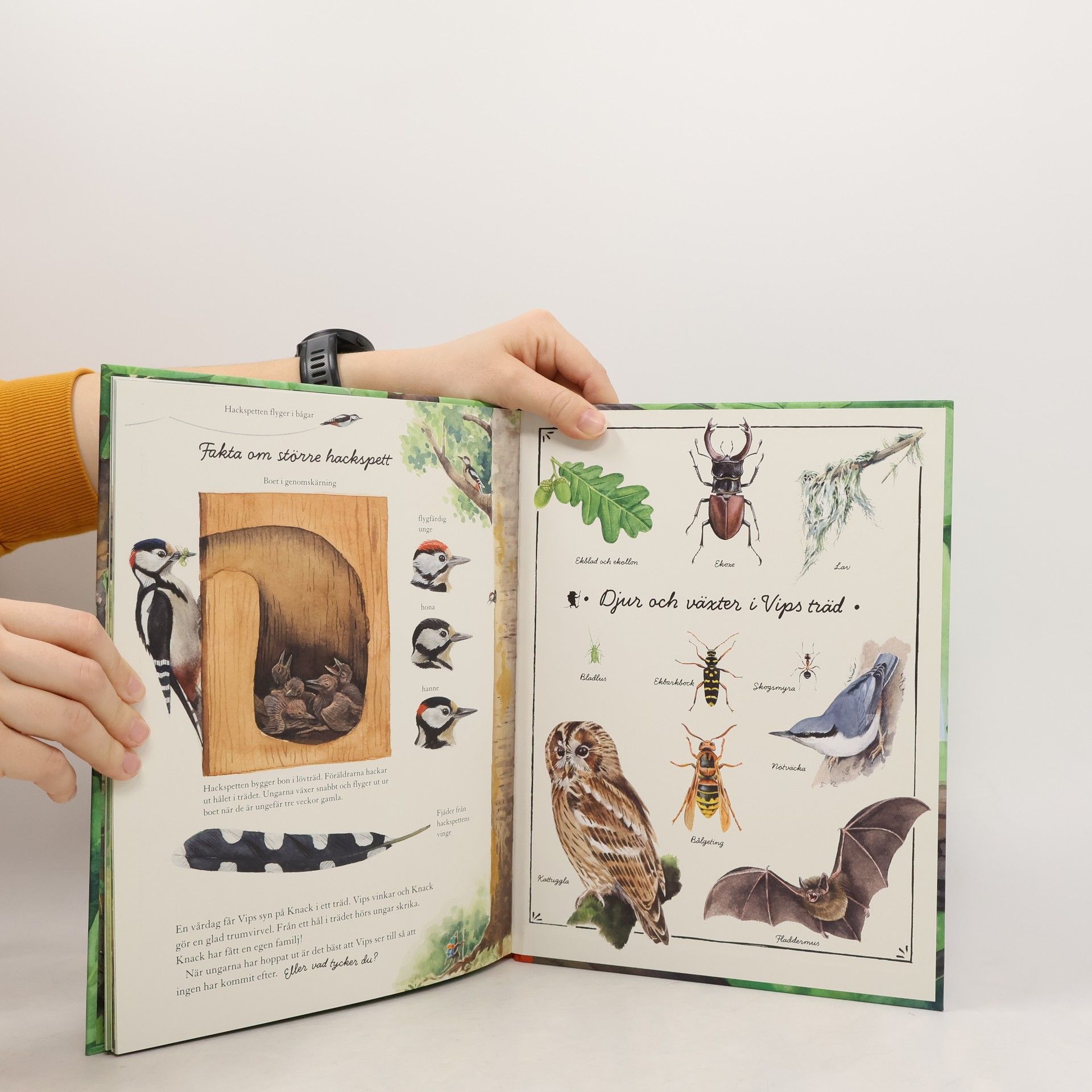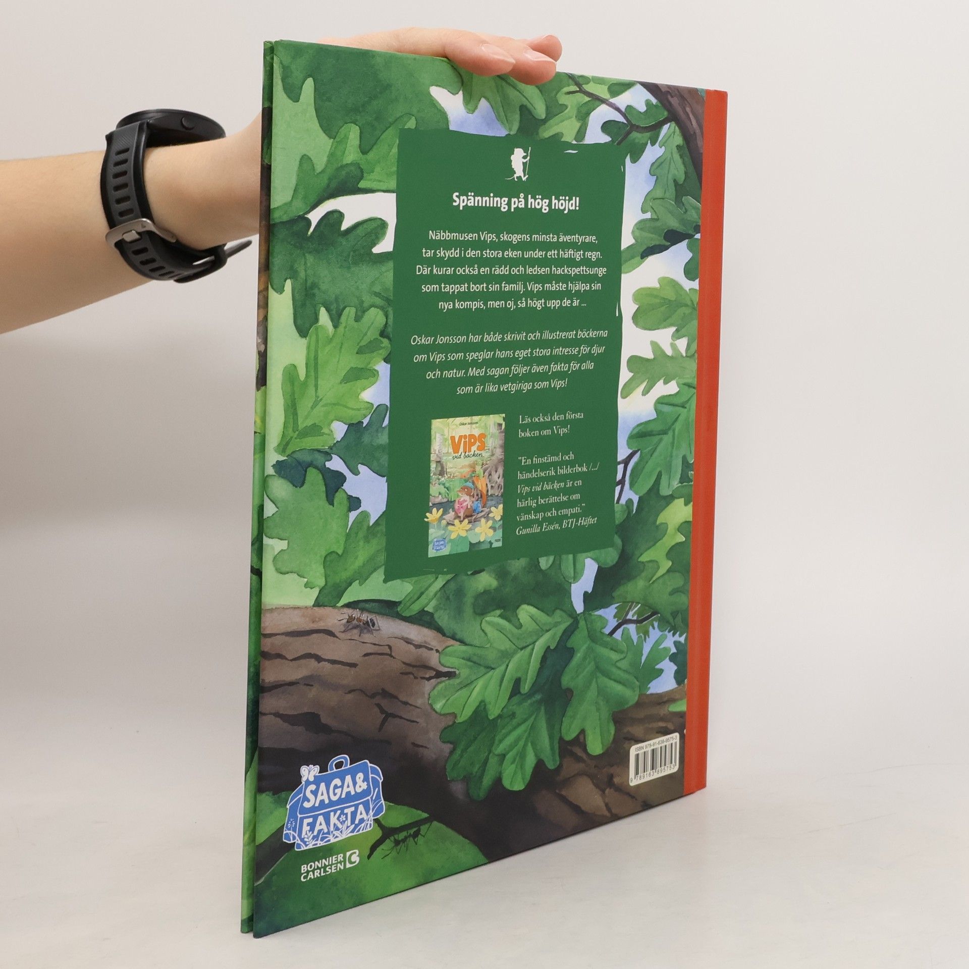 Vips, skogens minsta och hjälpsammaste äventyrare, tar skydd i den stora eken under ett häftigt regn. Där kurar också en rädd och ledsen hackspettsunge som tappat bort sin familj. Vips måste hjälpa sin nya kompis!I bedårande akvarellbilder skapar Oskar Jonsson en härlig värld som man får lust att upptäcka. Och den finns ju därute! I naturen kryper, växer och låter det hela tiden. Näbbmusen Vips är lite som en modern Plupp och påminner oss om hur enkelt och härligt det kan vara att bara sitta ute på en stubbe och se sig omkring.Men Vips blir förstås aldrig stilla så länge …Boken avslutas med enkla fakta om djur och växter i berättelsen.