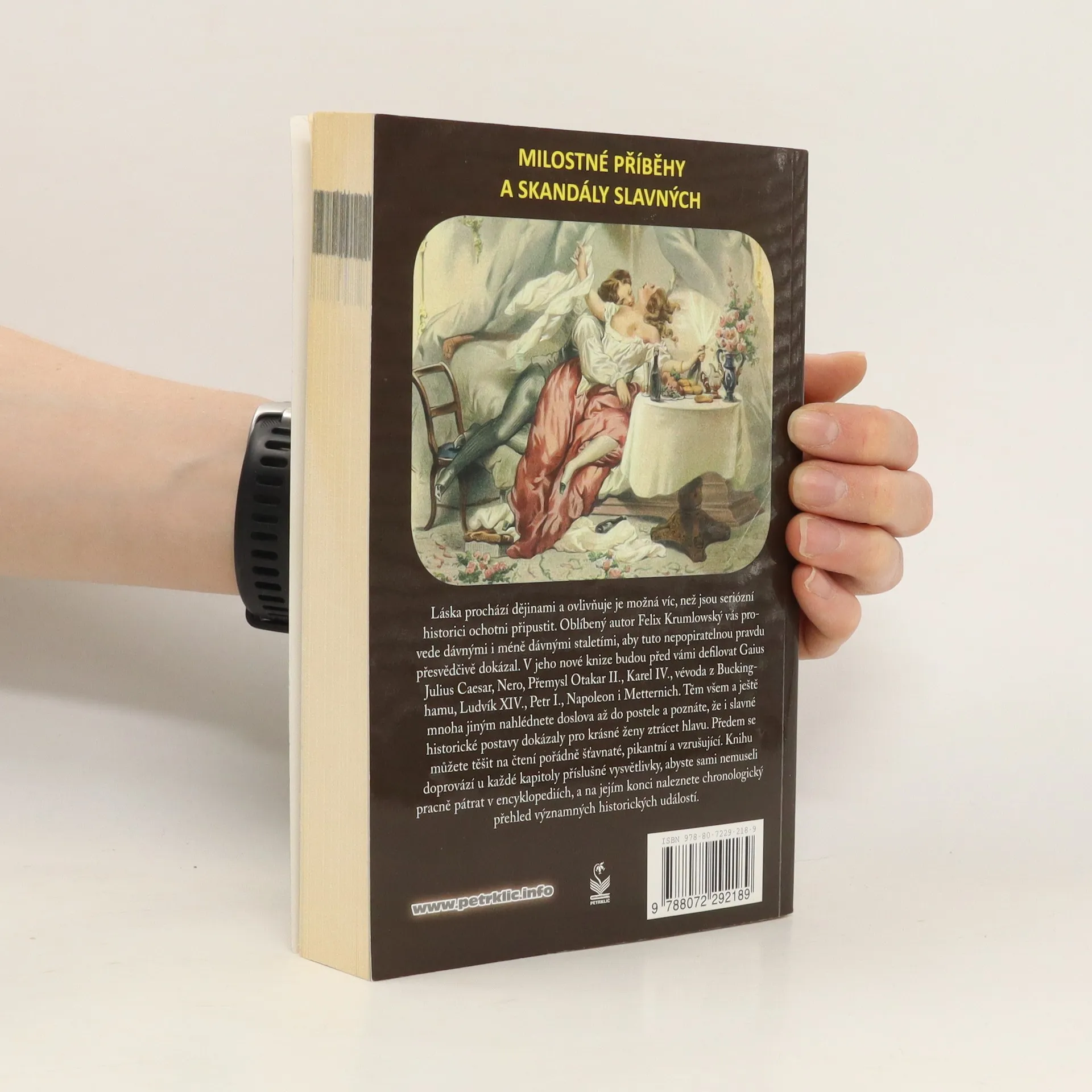 Láska prochází dějinami a ovlivňuje je možná víc, než jsou seriózní historici ochotni připustit. Oblíbený autor Felix Krumlowský vás provede dávnými i méně dávnými staletími, aby tuto nepopiratelnou pravdu přesvědčivě dokázal. V jeho nové knize budou před vámi defilovat Gaius Iulius Caesar, Nero, Přemysl Otakar II., Karel IV., vévoda z Buckinghamu, Ludvík XIV., Petr I., Napoleon i Metternich. Těm všem a ještě mnoha jiným nahlédnete doslova až do postele a poznáte, že i slavné historické postavy dokázaly pro krásné ženy ztrácet hlavu. Předem se můžete těšit na čtení pořádně šťavnaté, pikantní a vzrušující. Knihu doprovází u každé kapitoly příslušné vysvětlivky, abyste sami nemuseli pracně pátrat v encyklopediích, a na jejím konci naleznete chronologický přehled významných historických událostí.