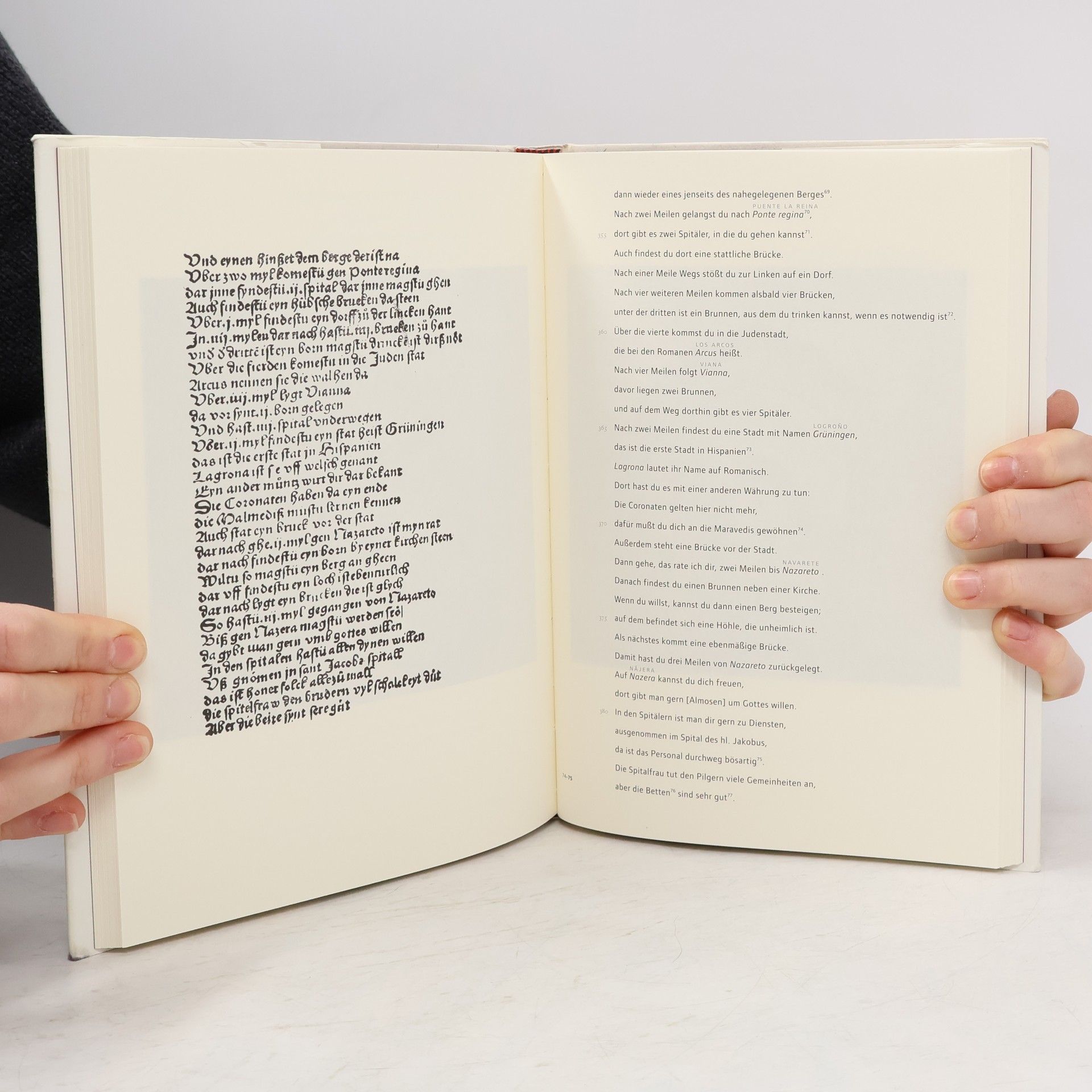 Wer sich heute auf die Pilgerreise nach Santiago de Compostela begibt, wandelt auf den Spuren unzähliger mittelalterlicher Pilgern, die dort ihr Heil suchten. Wohl jeder auf dem „camino“ hat sich schon einmal gefragt, wie seine Vorgänger in früheren Zeiten ihren Weg fanden, für Herberge und Verpflegung sorgten. Dabei stand ihren dieses Buch zur Seite, das 1495 zwei Wege von Deutschland nach Santiago beschreibt, auf Herbergen, Wasserstellen, Geldwechsler, aber auch auf Gefahren hinweist. Der Faksimile-Nachdruck der Originalausgabe führt in die Atmosphäre der Zeit ein, die gegenübergestellte Übersetzung in heutiges Deutsch und die Einleitung stellen die Beziehung zur Gegenwart her. Der historische Bericht wird illustriert durch die stimmunsvollen Schwarz-Weiß-Photographien von Gerhard Weiß, die die Spuren der Vergangenheit einfangen.