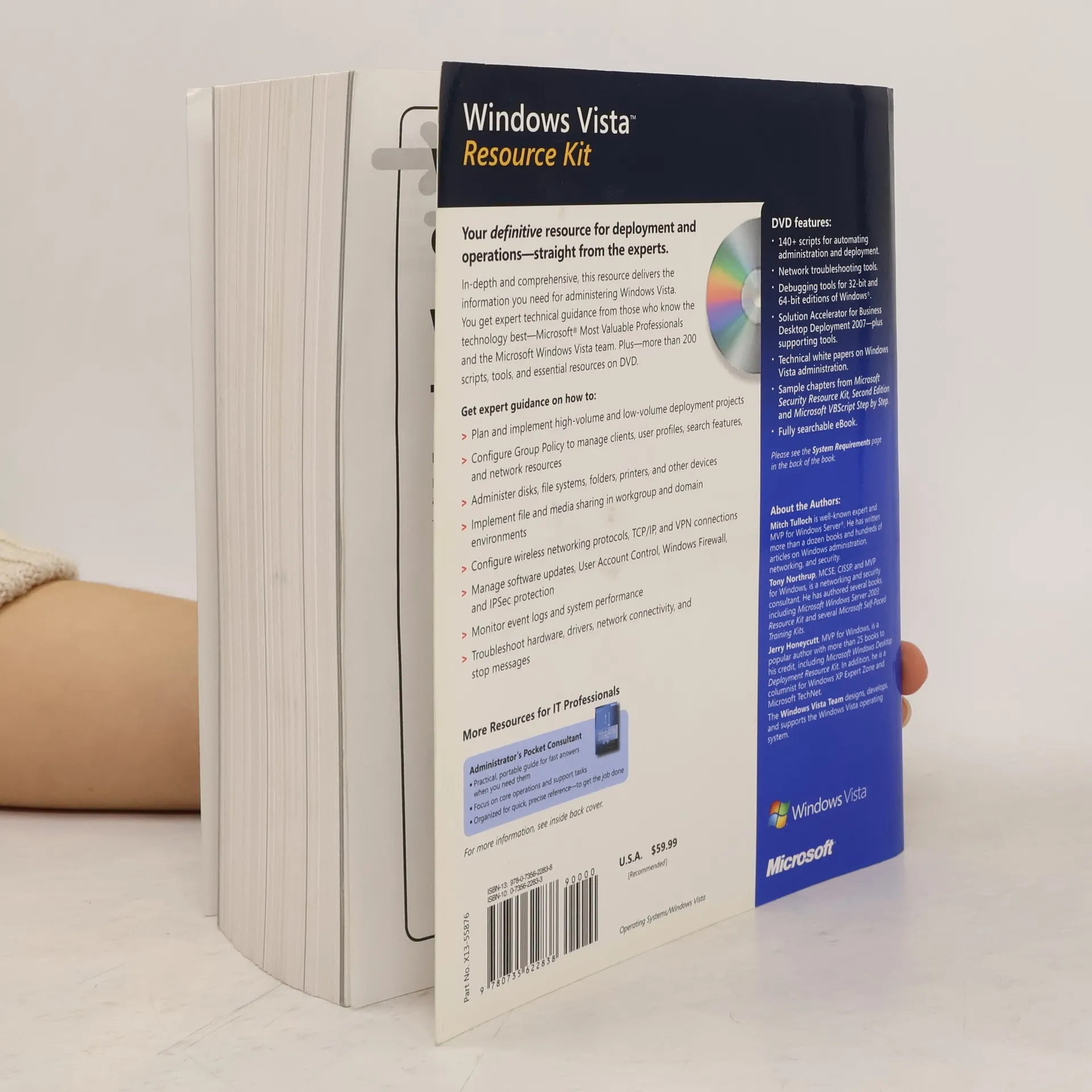 In-depth and comprehensive, this resource delivers the information you need for administering Windows Vista. You get expert technical guidance from those who know the technology best—Microsoft Most Valuable Professionals and the Microsoft Windows Vista team. Plus—more than 200 scripts, tools and essential administration resources on DVD.Get expert guidance on how to:Plan and implement high-volume and low-volume deployment projects Configure Group Policy to manage clients, user profiles, search features, and network resources Administer disks, file systems, folders, printers, and other devices Implement file and media sharing in workgroup and domain environments Configure wireless networking protocols, TCP/IP, and VPN connections Manage software updates, User Account Control, Windows Firewall, and Ipsec protection Monitor event logs and system performance Troubleshoot hardware, drivers, network connectivity, and stop messages DVD features:140+ scripts for automating administration and deployment. Network troubleshooting tools. Debugging tools for 32-bit and 64-bit editions of Windows. Solution Accelerator for Business Desktop Deployment 2007—plus supporting tools. Technical white papers on Windows Vista administration. Sample chapters from Microsoft Security Resource Kit, Second Edition and Microsoft VBScript Step by Step. Fully searchable eBook. A Note Regarding the CD or DVDThe print version of this book ships with a CD or DVD. For those customers purchasing one of the digital formats in which this book is available, we are pleased to offer the CD/DVD content as a free download via O'Reilly Media's Digital Distribution services. To download this content, please visit O'Reilly's web site, search for the title of this book to find its catalog page, and click on the link below the cover image (Examples, Companion Content, or Practice Files). Note that while we provide as much of the media content as we are able via free download, we are sometimes limited by licensing restrictions. Please direct any questions or concerns to booktech@oreilly.com.