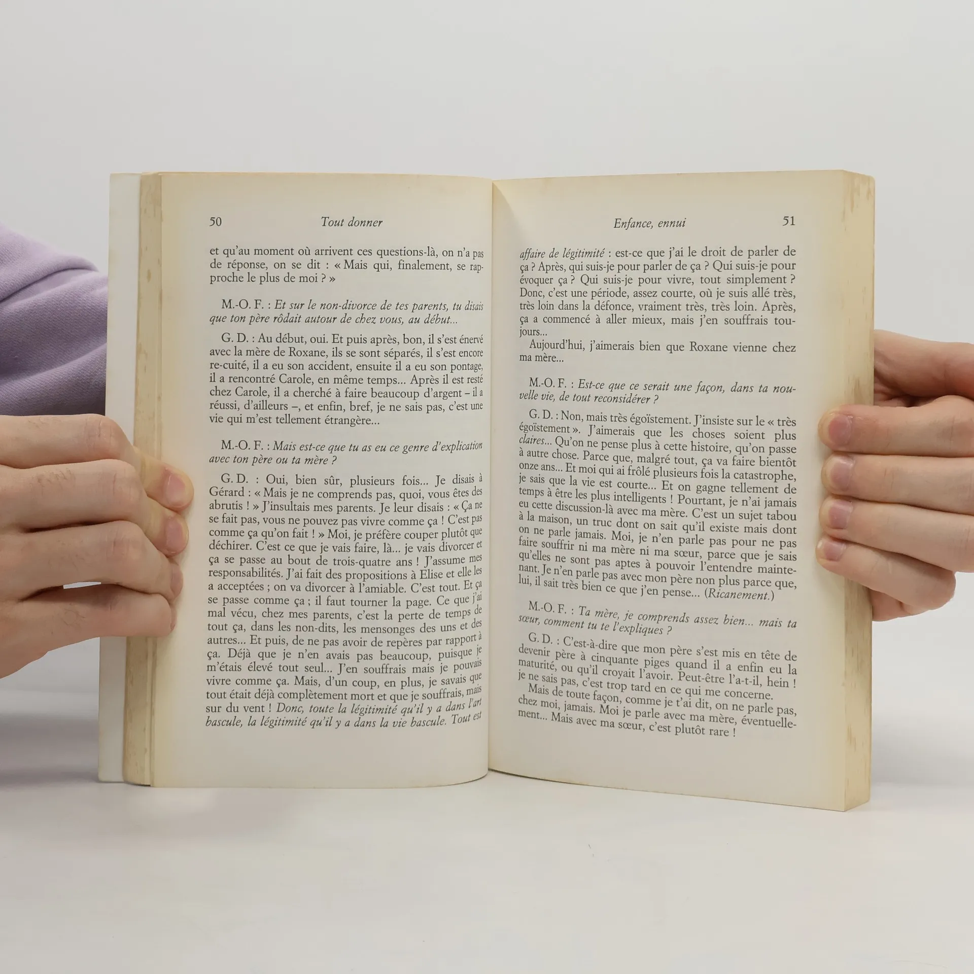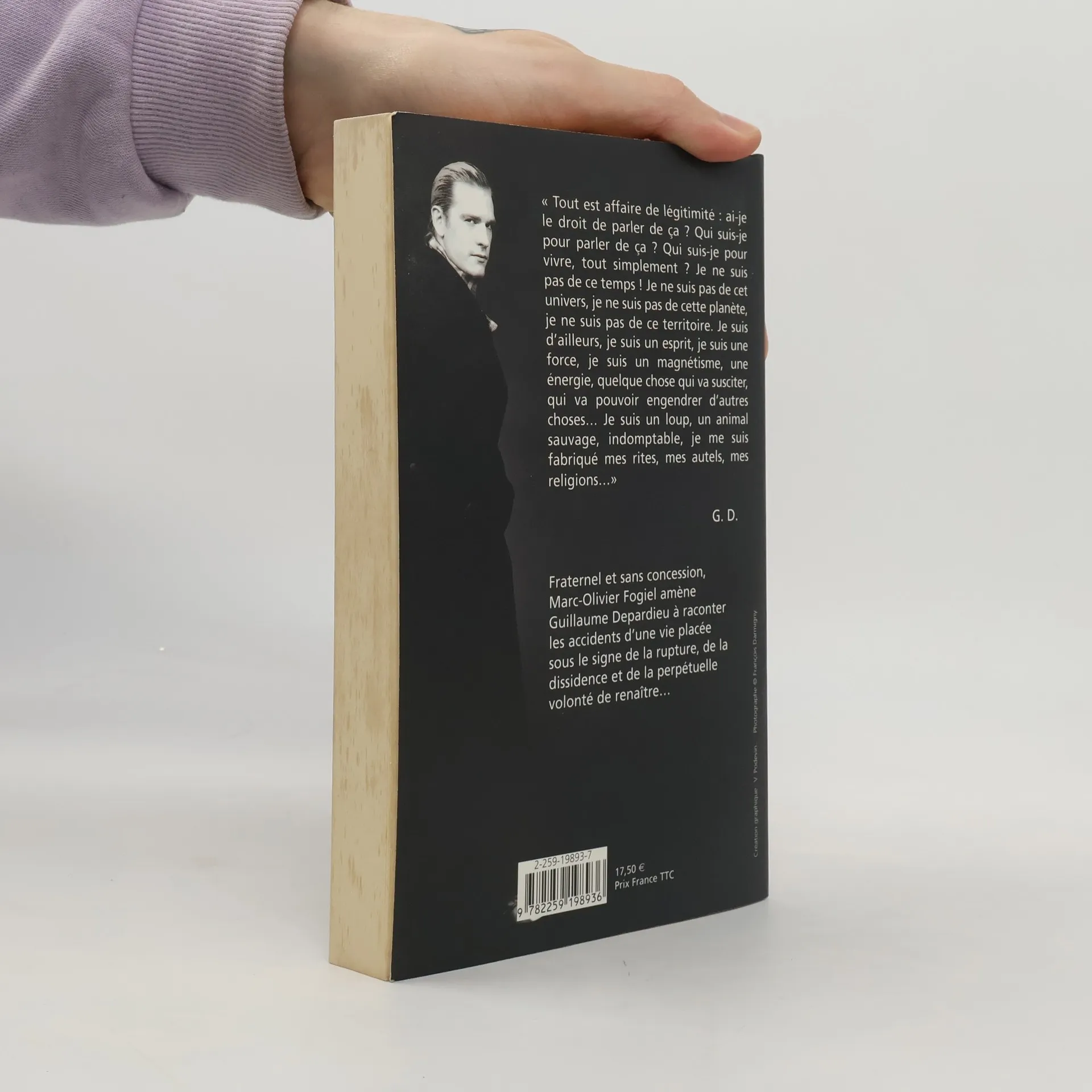 " Tout est affaire de légitimité : ai-je le droit de parler de ça ? Qui suis-je pour parler de ça ? Qui suis-je pour vivre, tout simplement ? Je ne suis pas de ce temps ! Je ne suis pas de cet univers, je ne suis pas de cette planète, je ne suis pas de ce territoire. Je suis d'ailleurs, je suis un esprit, je suis une force, je suis un magnétisme, une énergie, quelque chose qui va susciter, qui va pouvoir engendrer d'autres choses... Je suis un loup, un animal sauvage, indomptable, je me suis fabriqué mes rites, mes autels, mes religions... " G.D. Fraternel et sans concession, Marc-Olivier Fogiel amène Guillaume Depardieu à raconter les accidents d'une vie placée sous le signe de la rupture, de la dissidence et de la perpétuelle volonté de renaître...