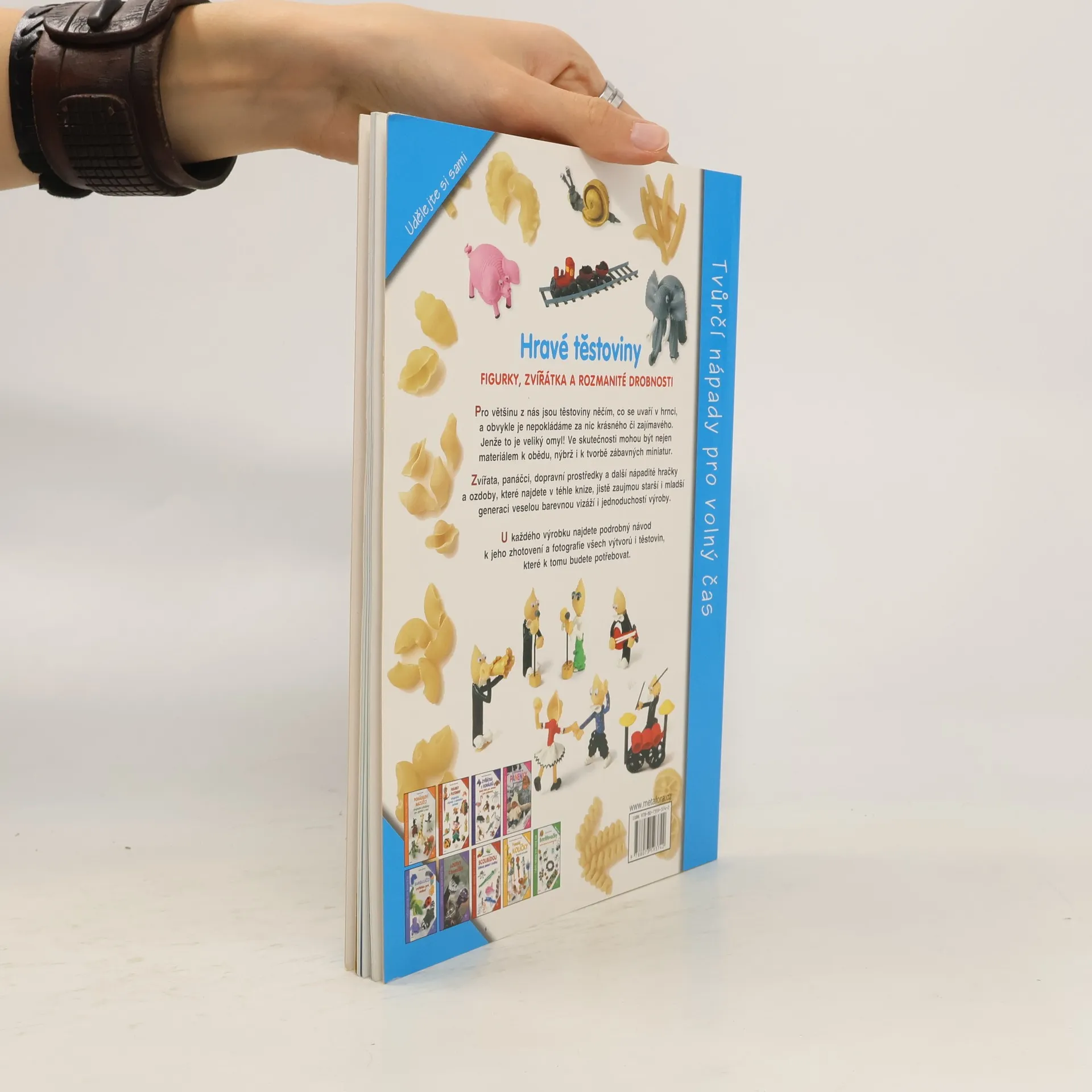 Figurky, zvířátka a rozmanité drobnosti, 50 originálních modelů… Pro většinu z nás jsou těstoviny něčím, co se uvaří v hrnci, a obvykle je nepokládáme za nic krásného či zajímavého. Jenže to je veliký omyl! Ve skutečnosti mohou být nejen materiálem k obědu, nýbrž i k tvorbě zábavných drobností. Zvířata, panáčci, dopravní prostředky a další nápadité hračky a ozdoby, které najdete v téhle knize, jistě zaujmou starší i mladší generaci veselou barevnou vizáží i jednoduchostí výroby. U každého výrobku najdete podrobný návod k jeho zhotovení a fotografie všech výtvorů i těstovin, které k tomu budete potřebovat.