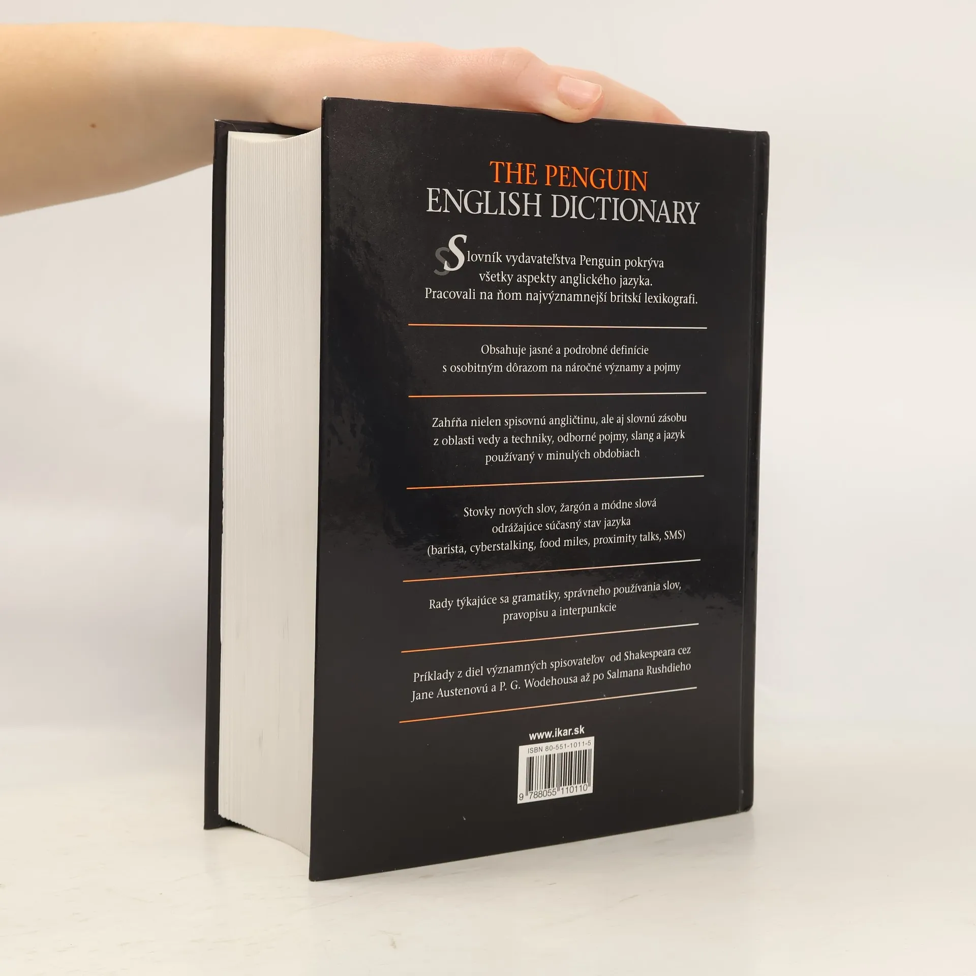 Ze srovnání slovníků Collins, Chambers a Penguin vychází The New Penguin English Dictionary jako ta nejlepší volba" Literární příloha The Times Toto druhé vydání nejrozsáhlejšího anglického výkladového slovníku nakladatelského domu Penguin dokonale a do hloubky pokrává všechny aspekty současného anglického jazyka. Jde o aktualizované vydání, které připravili přední angličtí lexikografové. Srozumitelné a detailní definice, se zvláštním důrazem na složitější významy a použití Najdeme zde nejen slova z tzv. "standard English", ale i technické a vědecké výrazy, slang a tvary z historické angličtiny. Stovky nových slov, žargon a módníslova reflektující nejnovější přírůstky do slovní zásoby, např. barista, cyberstalking, foodmiles, proximity talks, SMS aj. Gramatické vazby, příklady správného užití, výslovnost a interpunkce Příklady užití slov také z děl slavných spisovatelů, od Shakespeara po Jane Austenovou a od P. G. Wodehouse až po Salmana Rushdieho Příspěvky od významných britských odborníků, např. Richarda Dawkinse o evoluci, Geofreyho Robertsona o svobodě, Heleny Kennedyové o lidských právech a Vernona Bogdanora o devoluci.