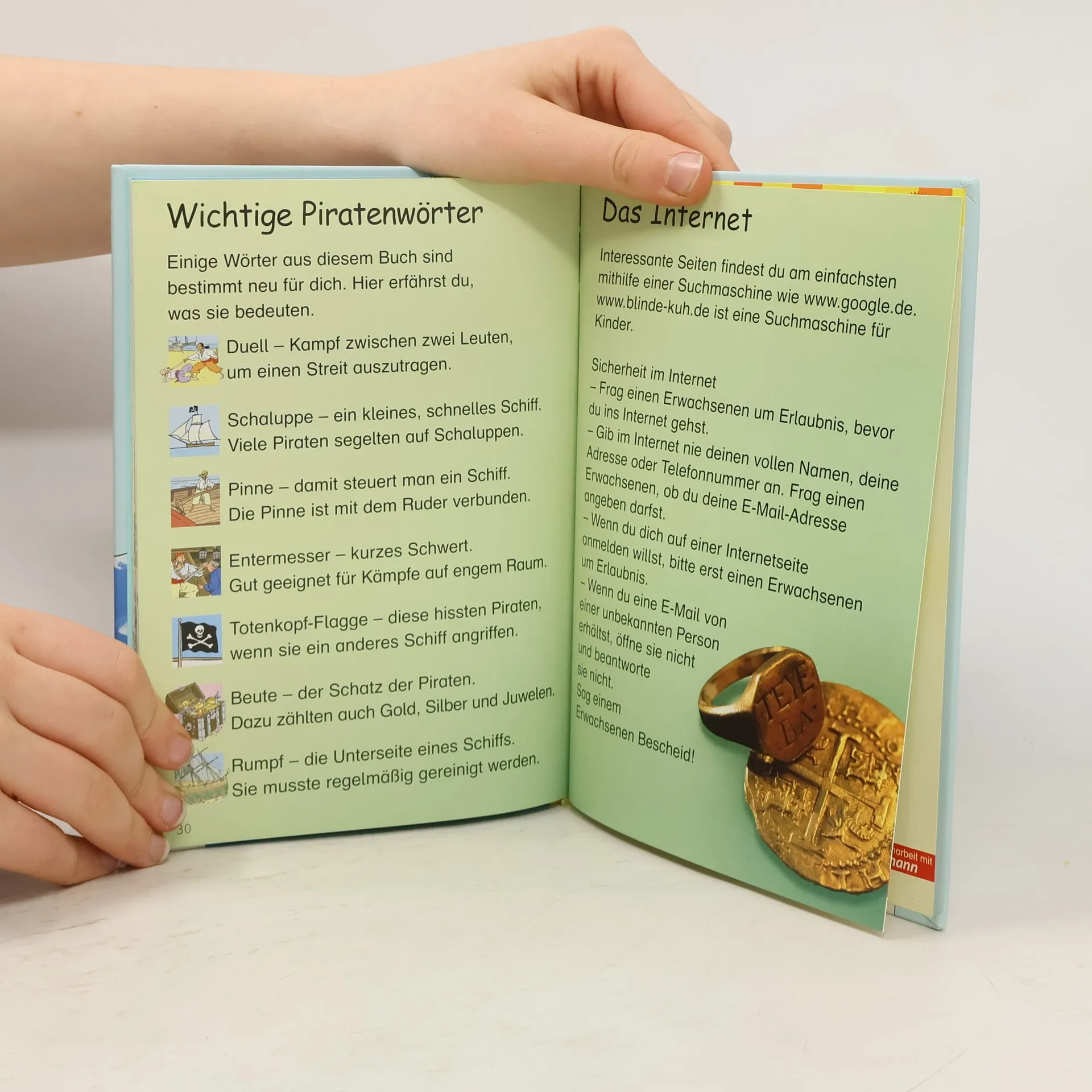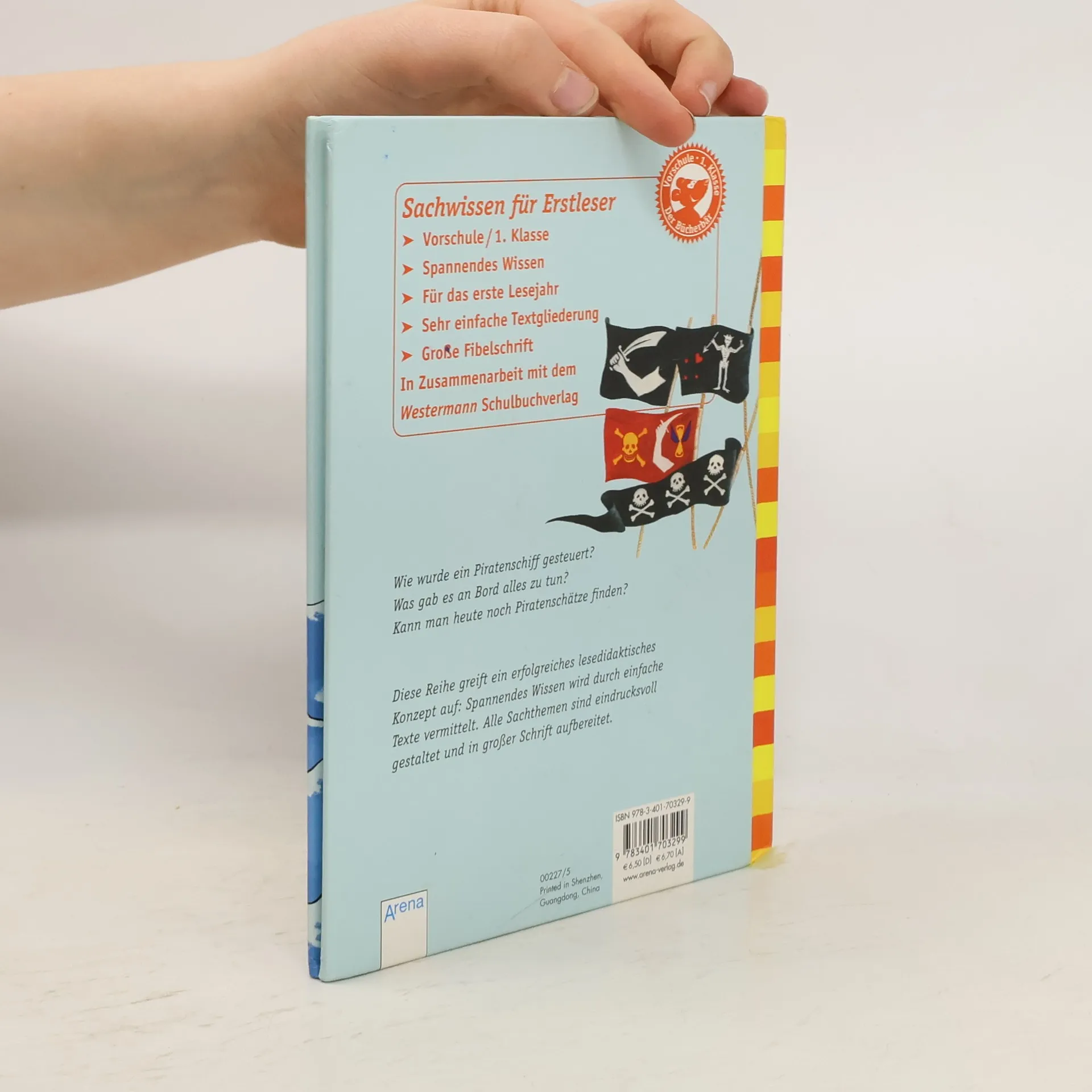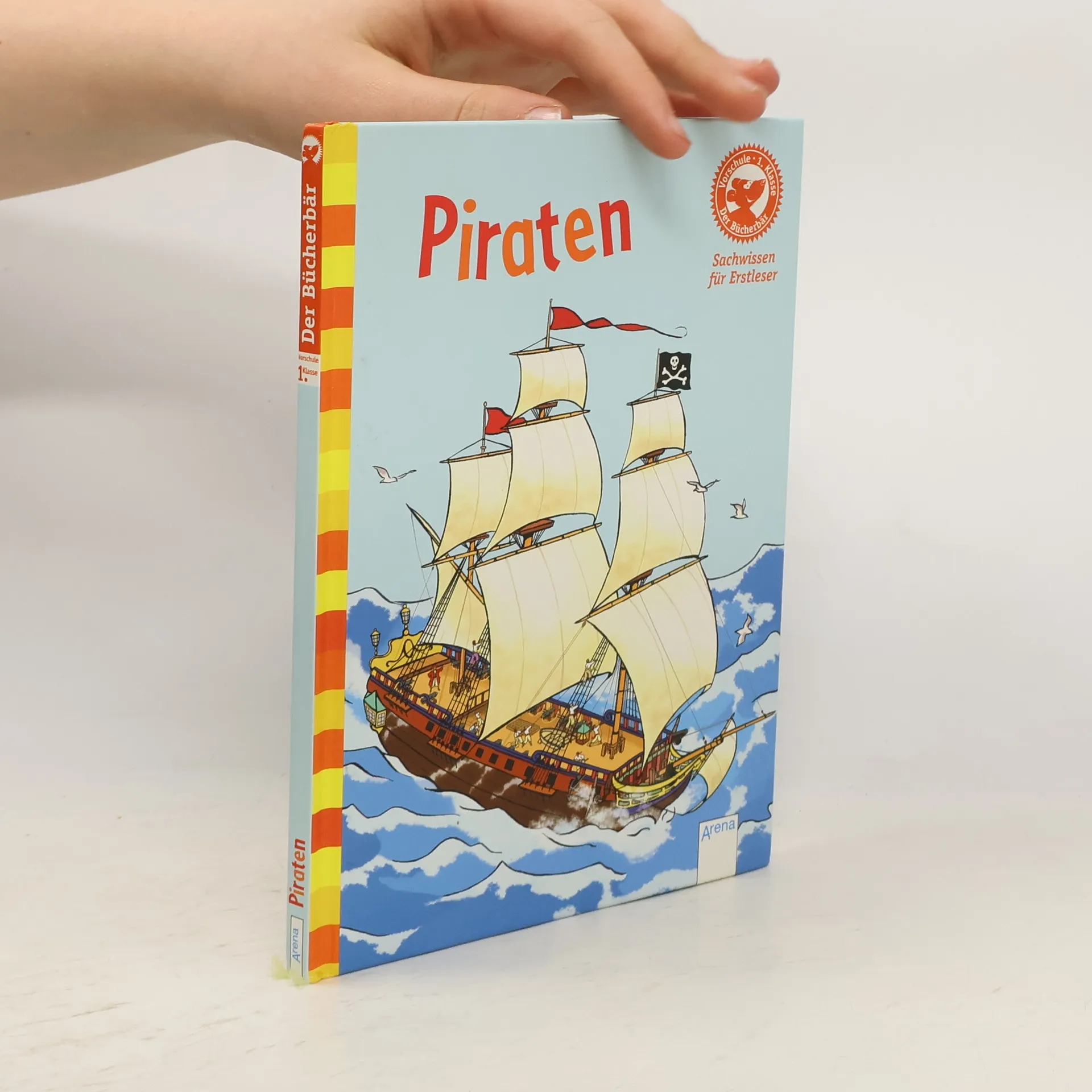 Piraten-Sachwissen für Erstleser. Neben Informationen zum Aussehen eines Piratenschiffs werden Mannschaft, Kleidung, Beute und weitere 10 Aspekte reihenüblich einfach und farbig dargestellt. Ab 6.