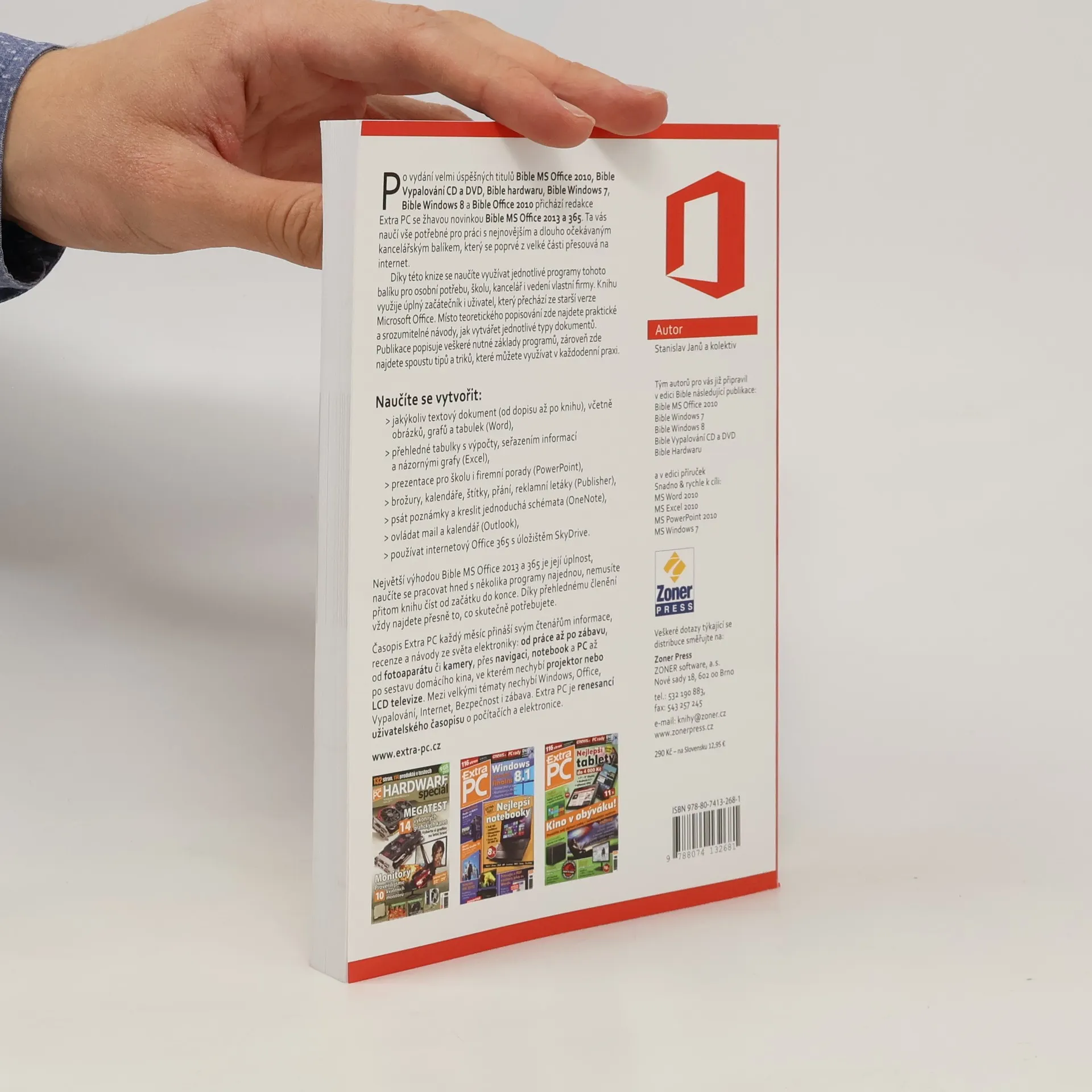 Redakce časopisu Extra PC vydala knihu Bible Office 2013 a 365. Ta vás naučí vše potřebné pro práci s nejnovějším a dlouho očekávaným kancelářským balíkem, který se poprvé z velké části přesouvá na internet. Díky této knize se naučíte využívat jednotlivé programy tohoto balíku pro osobní potřebu, školu, kancelář i vedení vlastní firmy. Knihu využije úplný začátečník i uživatel, který přechází ze starší verze Microsoft Office. Místo teoretického popisování zde najdete praktické a srozumitelné návody, jak vytvářet jednotlivé typy dokumentů. Publikace popisuje veškeré nutné základy programů, zároveň zde najdete spoustu tipů a triků, které můžete využívat v každodenní praxi. Naučíte se vytvořit: -jakýkoliv textový dokument (od dopisu až po knihu), včetně obrázků, grafů a tabulek (Word), -přehledné tabulky s výpočty, seřazením informací a názornými grafy (Excel), -prezentace pro školu i firemní porady (PowerPoint), -brožury, kalendáře, štítky, přání, reklamní letáky (Publisher), -psát poznámky a kreslit jednoduchá schémata (OneNote), -ovládat mail a kalendář (Outlook), -používat internetový Office 365 s úložištěm SkyDrive. Největší výhodou Bible Microsoft Office 2013 je její úplnost, naučíte se pracovat hned s několika programy najednou, nemusíte přitom knihu číst od začátku do konce. Díky přehlednému členění vždy najdete přesně to, co skutečně potřebujete.