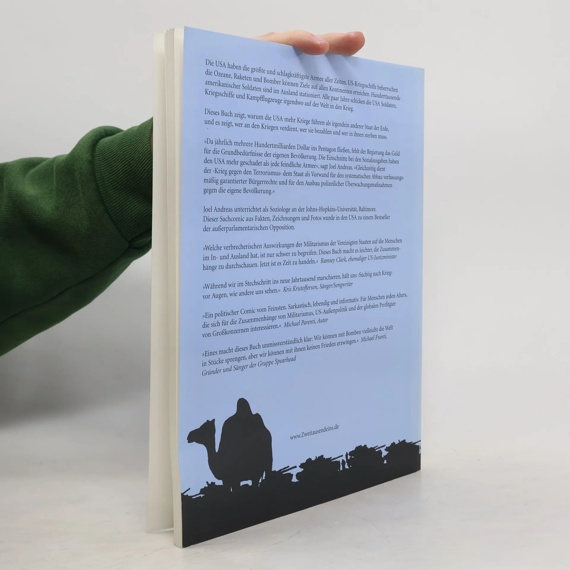 Schockiert über die Desinformationspolitik der US-Regierung und die Rolle der Mainstream-Medien, untersucht der amerikanische Soziologe Joel Andreas die Neigung der USA zum Krieg. Sein Sachcomic, der Fakten, Zeichnungen und Fotos kombiniert, wurde zum Bestseller der außerparlamentarischen Opposition und erreicht eine Auflage von 200.000 Exemplaren. Er wird von Friedensinitiativen und Lehrern als Unterrichtsmaterial verwendet. Der Erfolg in alternativen Buchhandlungen und großen Ketten zeigt eine kritische Unterströmung in der Bevölkerung, die von der US-Regierung oft geleugnet wird. Die USA verfügen über die größte Armee der Geschichte, und ihre militärischen Aktivitäten sind allgegenwärtig. Andreas thematisiert die Eroberermentalität, die die US-Geschichte prägt, und beleuchtet, wer an den Kriegen verdient und wer die Kosten trägt. Er kritisiert die hohen Ausgaben für das Militär, die zulasten sozialer Bedürfnisse der Bevölkerung gehen, und weist darauf hin, dass der „Krieg gegen den Terrorismus“ als Vorwand für den Abbau von Bürgerrechten dient. Der politische Comic soll die Debatte über das militärische Engagement anregen und zu kreativen Aktionen aufrufen. Er erleichtert das Verständnis für die verheerenden Auswirkungen des US-Militarismus und fordert zum Handeln auf.