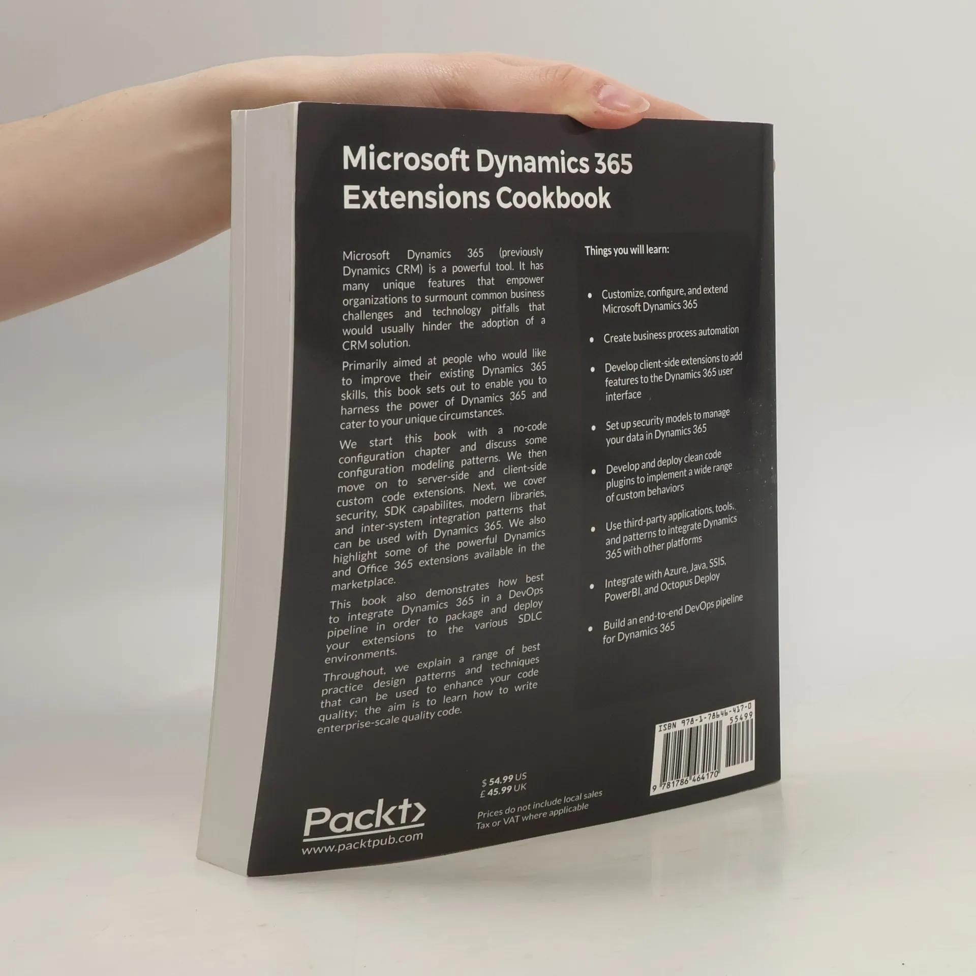 More than 80 recipes to help you leverage the various extensibility features available for Microsoft Dynamics and solve problems easilyAbout This Book* Customize, configure, and extend the vanilla features of Dynamics 365 to deliver bespoke CRM solutions fit for any organization* Implement business logic using point-and-click configuration, plugins, and client-side scripts with MS Dynamics 365* Built a DevOps pipeline as well as Integrate Dynamics 365 with Azure and other platformsWho This Book Is ForThis book is for developers, administrators, consultants, and power users who want to learn about best practices when extending Dynamics 365 for enterprises. You are expected to have a basic understand of the Dynamics CRM/365 platform.What You Will Learn* Customize, configure, and extend Microsoft Dynamics 365* Create business process automation* Develop client-side extensions to add features to the Dynamics 365 user interface* Set up a security model to securely manage data with Dynamics 365* Develop and deploy clean code plugins to implement a wide range of custom behaviors* Use third-party applications, tools, and patterns to integrate Dynamics 365 with other platforms* Integrate with Azure, Java, SSIS, PowerBI, and Octopus Deploy* Build an end-to-end DevOps pipeline for Dynamics 365In DetailMicrosoft Dynamics 365 is a powerful tool. It has many unique features that empower organisations to bridge common business challenges and technology pitfalls that would usually hinder the adoption of a CRM solution. This book sets out to enable you to harness the power of Dynamics 365 and cater to your unique circumstances.We start this book with a no-code configuration chapter and explain the schema, fields, and forms modeling techniques. We then move on to server-side and client-side custom code extensions. Next, you will see how best to integrate Dynamics 365 in a DevOps pipeline to package and deploy your extensions to the various SDLC environments. This book also covers modern libraries and integration patterns that can be used with Dynamics 365 (Angular, 3 tiers, and many others). Finally, we end by highlighting some of the powerful extensions available.Throughout we explain a range of design patterns and techniques that can be used to enhance your code quality; the aim is that you will learn to write enterprise-scale quality code.Style and approachThis book takes a recipe-based approach, delivering practical examples and use cases so that you can identify the best possible approach to extend your Dynamics 365 deployment and tackle your specific business problems.