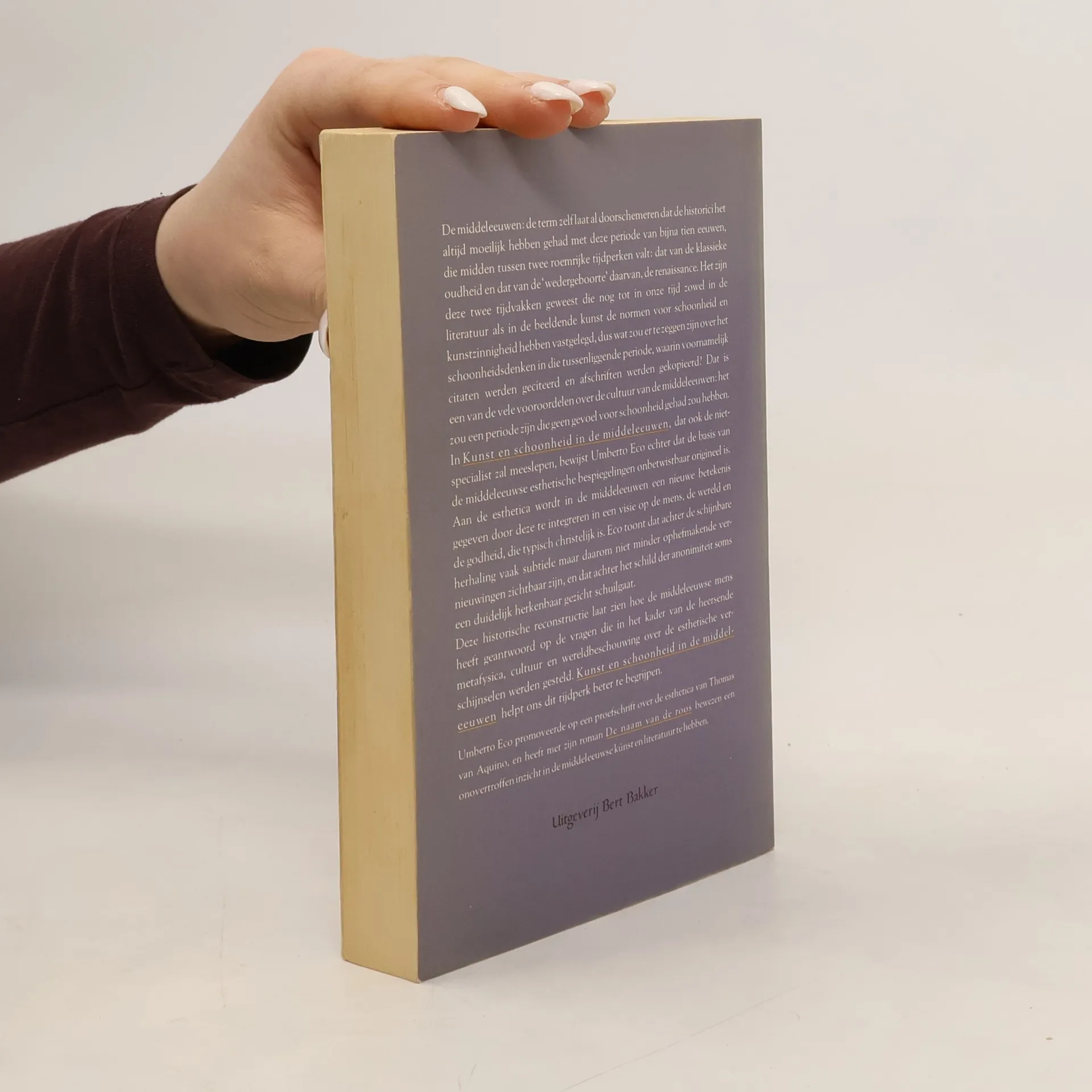Wat Eco met dit werk wil aantonen is, dat de middeleeuwer wel degelijk gevoel had voor zintuiglijk waarneembare schoonheid en dat hij daar vreugde aan beleefde. Hij had er zelfs hoogst originele theorieen over. Eco bewijst dat de veroordeling van schoonheid door sommigen juist impliceert dat zij het bestaan ervan erkenden. Zij billijkten alleen het genieten ervan niet, omdat dat afleidde van God. Voor anderen refereerde schoonheid juist direct aan God, in kleuren, proporties, glans of vorm. Eco citeert uitvoerig en veronderstelt een grote achtergrondkennis op allerlei terreinen bij de lezer aanwezig. Dat de niet-specialist door dit boek zal worden meegesleept (flaptekst) moet dan ook ten sterkste betwijfeld worden. Het is echter een must voor (kunst-)historici en geinteresseerden. Zeer uitvoerige bronvermelding en literatuurlijst. Voor de vakman is het taalgebruik helder.