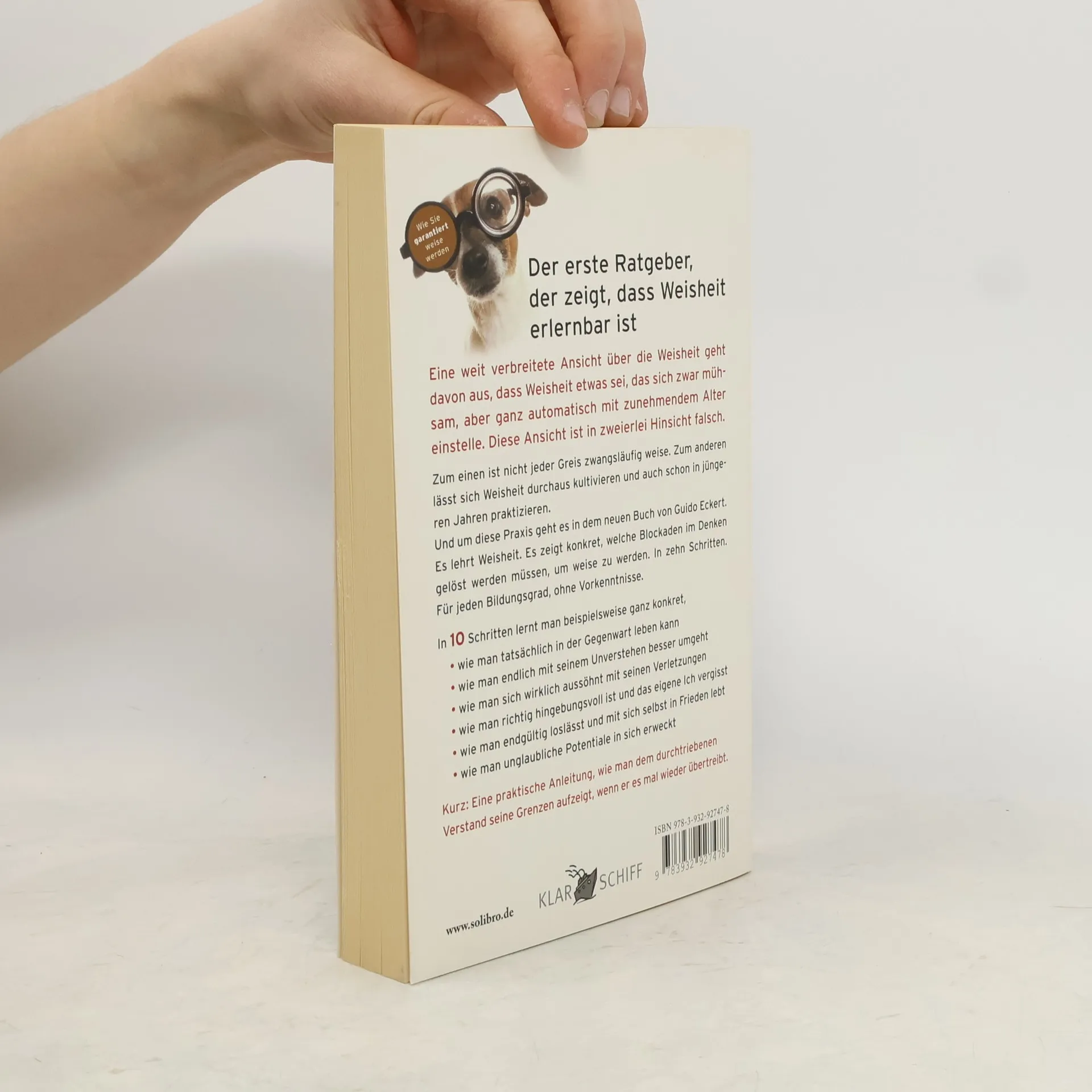 DER ERSTE RATGEBER DER ZEIGT, DASS WEISHEIT ERLERNBAR IST Eine weit verbreitete Ansicht über die Weisheit geht davon aus, dass Weisheit etwas sei, das sich zwar mühsam, aber ganz automatisch mit zunehmendem Alter einstelle. Diese Ansicht ist in zweierlei Hinsicht falsch. Zum einen ist nicht jeder Greis zwangsläufig weise. Zum anderen lässt sich Weisheit durchaus kultivieren und auch schon in jüngeren Jahren praktizieren. Und um diese Praxis geht es in dem neuen Buch von Guido Eckert. Es lehrt Weisheit. Es zeigt konkret, welche Blockaden im Denken gelöst werden müssen, um weise zu werden. In zehn Schritten. Für jeden Bildungsgrad, ohne Vorkenntnisse. In 10 Schritten lernt man beispielsweise ganz konkret, • wie man tatsächlich in der Gegenwart leben kann • wie man endlich mit seinem Unverstehen besser umgeht • wie man sich wirklich aussöhnt mit seinen Verletzungen • wie man richtig hingebungsvoll ist und das eigene Ich vergisst • wie man endgültig loslässt und mit sich selbst in Frieden lebt • wie man unglaubliche Potentiale in sich erweckt Kurz: Eine praktische Anleitung, wie man dem durchtriebenen Verstand seine Grenzen aufzeigt, wenn er es mal wieder übertreibt. Jedes Kapitel pustet das Hirn frei und dient dem Weg zur Weisheit. – Geht das? Und ob!