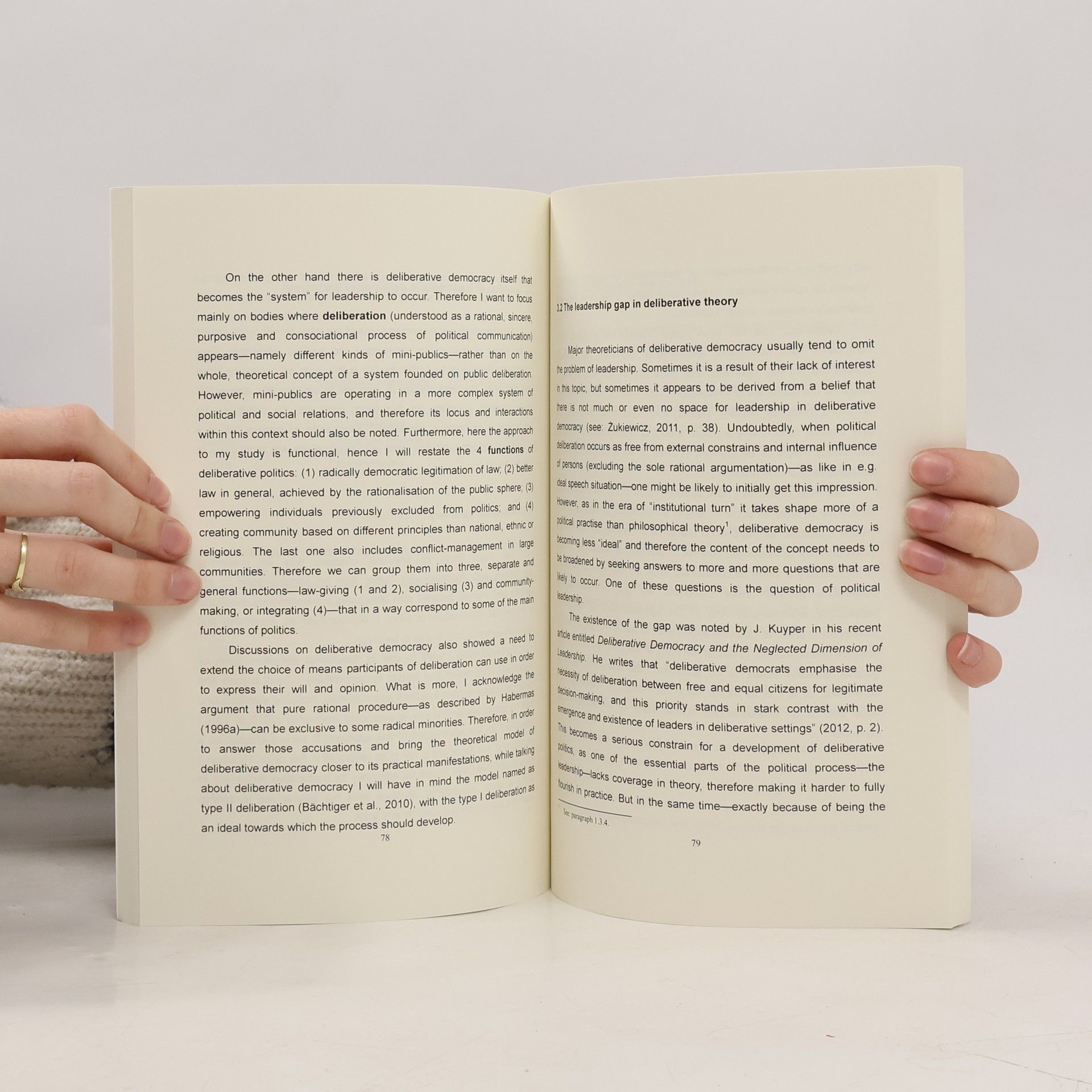 The theory of Deliberative Democracy has been present in political science for many years and since that has developed to one of the leading ideas for enhancing democratic systems. However, it still looks better in theory than in practice. One of the biggest gaps in it can be found when it comes to implement political leadership into it. What initially seems as two, mutually exclusive phenomena, becomes reconciled in this book as not only possible, but even necessary combination. Enclosing this theoretical gap with a suitable leadership model is a necessary step towards further implementation of deliberative politics in practice.