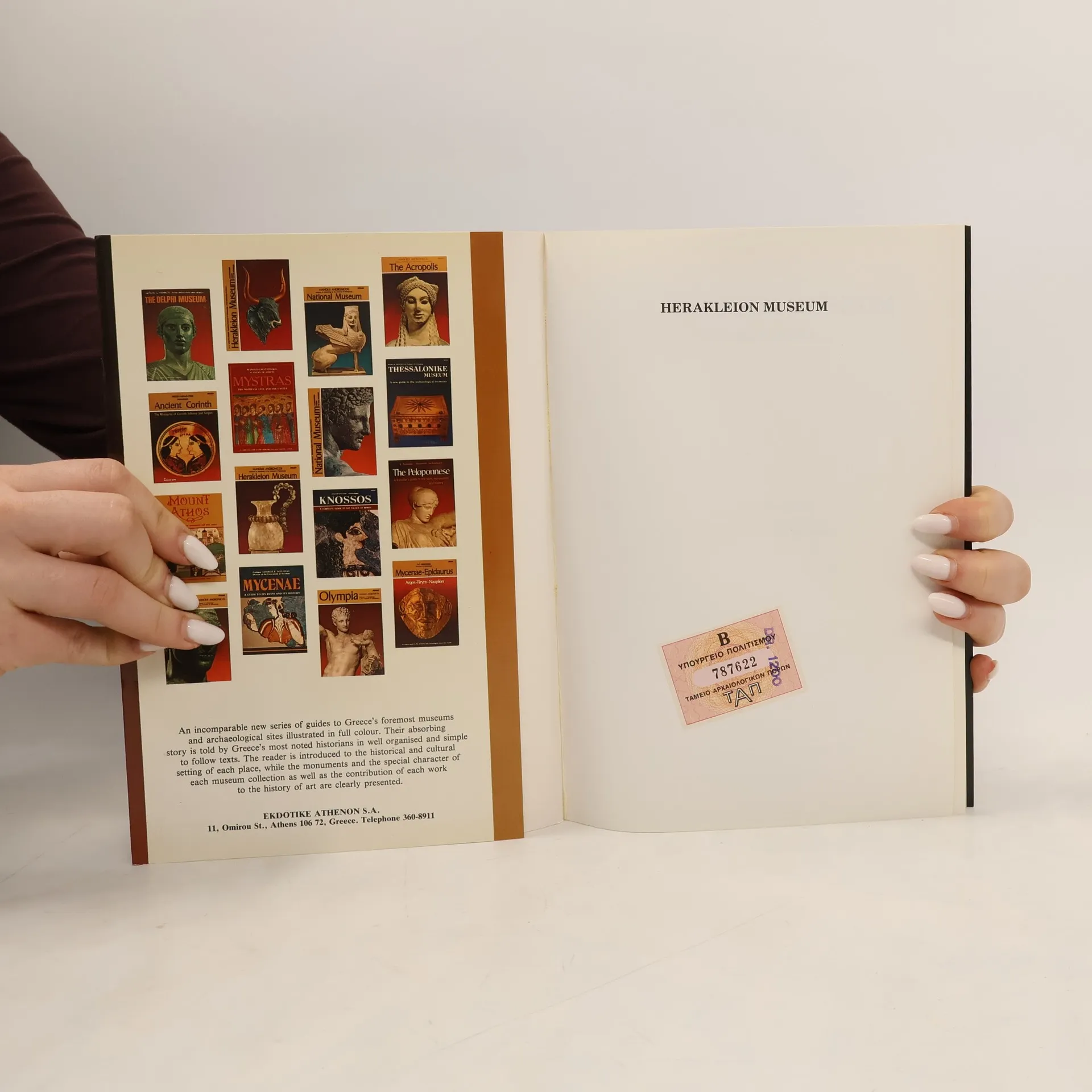 From the remote Neolithic period the soil of Crete has lovingly protected priceless treasures, which have been, and are continually being brought to light by archaeological excavations.These masterpieces of Cretan, and especially of Minoan civilization, are now displayed in the Herakleion Museum, and form a collection of unique value.The publication of the Guide to the Herakleion Museum by Ekdotike Athenon is intended to help the visitor to become acquainted with the treasures of Cretan art in a scientific and methodical way, and, through the exhibits, to trace the evolution of the civilization of the island throughout the many centuries of its history.The structure and composition of the book has been designed with these aims in mind, and the relevant photographs are set out alongside the text. The visitor thus has the opportunity to come into contact, room by room, with the great artistic achievements of Minoan civilization, and to form an idea of the character of its unique cultural heritage.