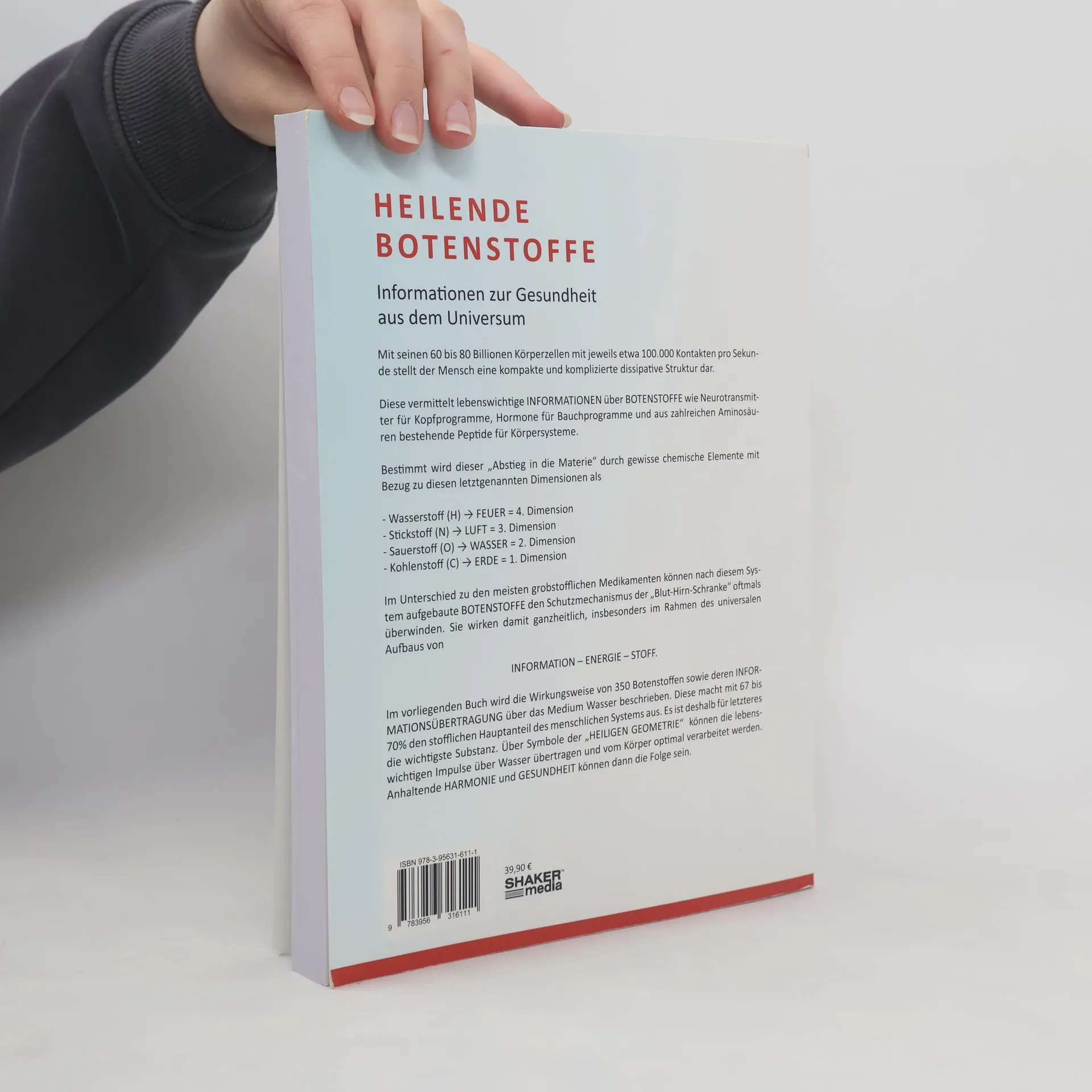 Der Mensch stellt ein hochkompliziertes System von 60 bis 80 Millionen Zellen dar, in welchem etwa 100.000 Impulse pro Sekunde aktiviert werden. Über den Wasseranteil von etwa 67% werden Informationen über Botenstoffe wie Neurotransmitter, Hormone und Peptide verbreitet, wobei der Körper selbst die Selbstheilungskräfte steuern und aktivieren kann. Das vorliegende Buch hilft Ihnen zu erfahren, welche von den 350 beschriebenen Botenstoffen zu welchen Wirkungen führen. Diese sind ausführlich beschrieben. Dieses Buch gibt Ihnen ebenso Auskunft darüber, für welche Krankheiten laut Erfahrung welche Botenstoffe geeignet sind. Es zeigt ebenfalls, wie Sie sie mit welchen Symbolen über das Wasser die entsprechenden Informationen über den Körper leiten können, wobei diese die Bluthirnschranke überwinden. Aufgrund der zur Verfügung gestellten Informationen können Sie selbst mit ihrem „inneren Arzt“ abklären, welche Maßnahmen als Wirkungsbehandlung vorzunehmen sind. Versuchen Sie es und Sie werden sehen – es funktioniert!