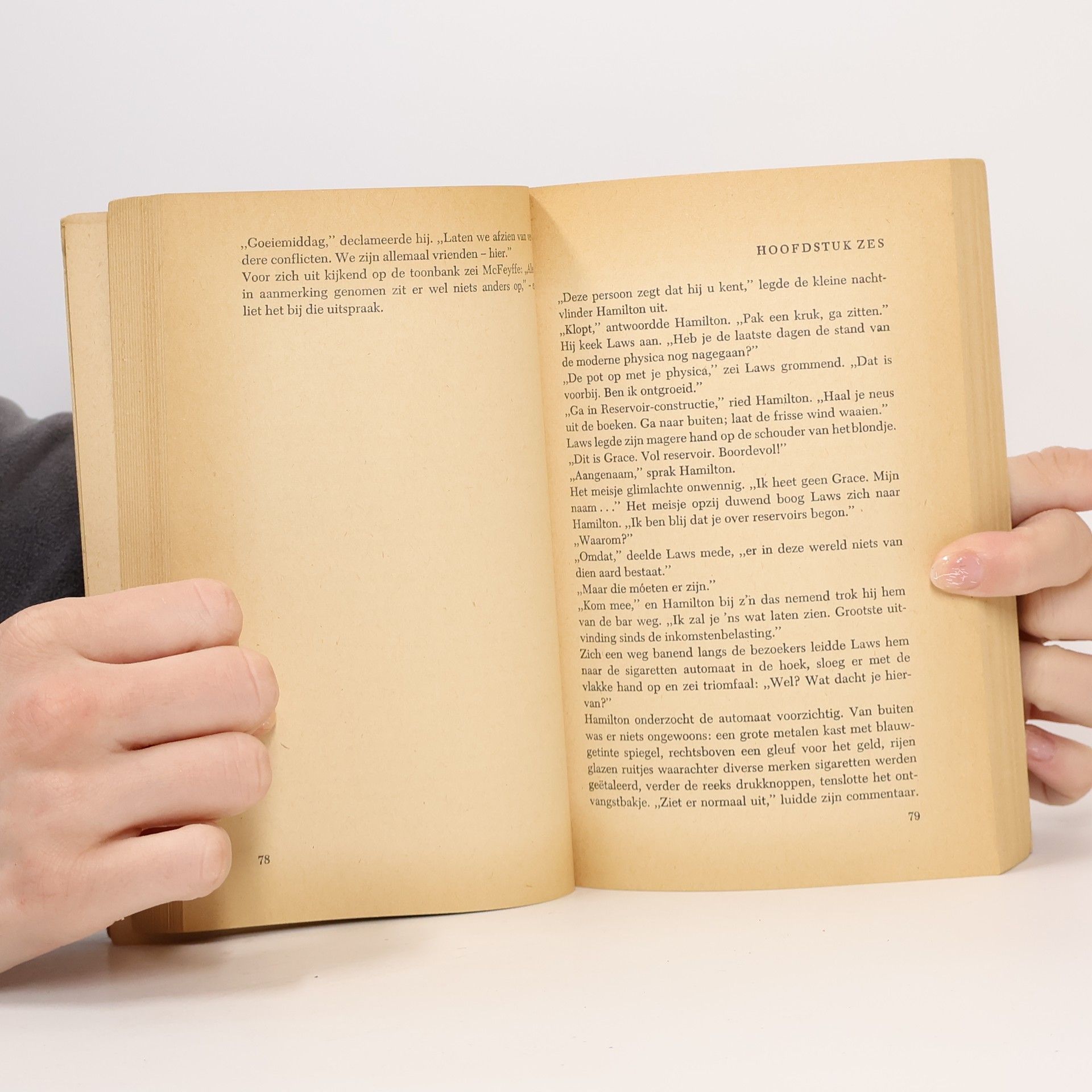 Hoger en hoger rees hij, tot ver boven de stratosfeer. Om hem heen was een grijs niemandsland. En daarin bevond zich een gigantisch meer. Een meer zo groot, dat de gehele aarde erin had kunnen verzinken zonder een rimpel achter te laten. Een meer dat verscheen en verdween, opnieuw en opnieuw, alsof het voortdurend door een sluier aan Hamiltons blik werd onttrokken. Een vreemd meer... En ineens realiseerde ir. Hamilton zich met een schok dat het in 't geheel geen meer was. Hij tuurde recht in een kolossaal oog, een oog aan de hemel.