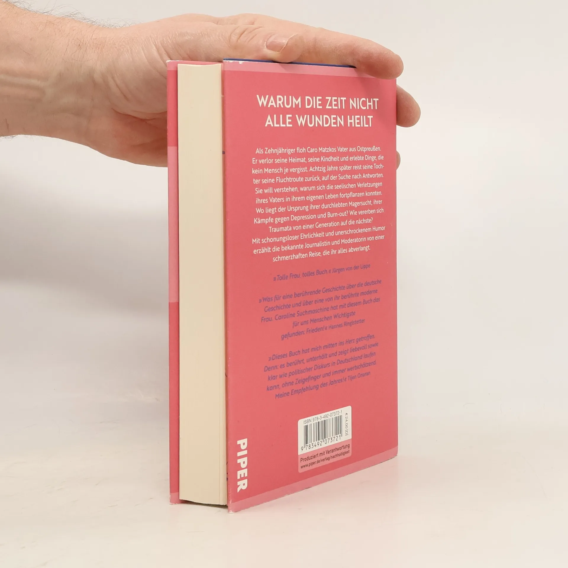 Warum die Zeit nicht alle Wunden heilt Als Zehnjähriger floh Caro Matzkos Vater aus Ostpreußen. Er verlor seine Heimat, seine Kindheit und erlebte Dinge, die kein Mensch je vergisst. Achtzig Jahre später reist seine Tochter seine Fluchtroute zurück, auf der Suche nach Antworten. Sie will verstehen, warum sich die seelischen Verletzungen ihres Vaters in ihrem eigenen Leben fortpflanzen konnten. Wo liegt der Ursprung ihrer durchlebten Magersucht, ihrer Kämpfe gegen Depression und Burn-out? Wie vererben sich Traumata von einer Generation auf die nächste? Mit schonungsloser Ehrlichkeit und unerschrockenem Humor erzählt die bekannte Journalistin und Moderatorin von einer schmerzhaften Reise, die ihr alles abverlangt. »Tolle Frau, tolles Buch.« Jürgen von der Lippe »Was für eine berührende Geschichte über die deutsche Geschichte und über eine von ihr berührte moderne Frau. Die darüber offen reden und schreiben will, und vor allem ihre damit verbundene eigene Geschichte brillant erzählen kann. Mit vollem Herzen. Caroline Suchmaschine hat mit diesem Buch das für uns Menschen Wichtigste gefunden: Frieden!« Hannes Ringlstetter „Dieses Buch hat mich mitten ins Herz getroffen. Denn: es berührt, unterhält und zeigt auf liebevolle sowie klare Weise wie politischer Diskurs in Deutschland laufen kann. Meine Empfehlung des Jahres!“ Tijen Onaran