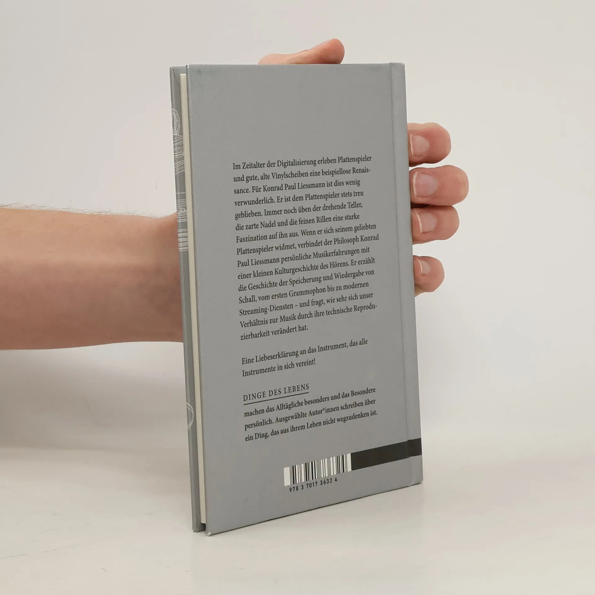 Im Zeitalter der Digitalisierung erleben Plattenspieler und gute, alte Vinylscheiben eine beispiellose Renaissance. Für Konrad Paul Liessmann ist dies wenig verwunderlich. Er ist dem Plattenspieler stets treu geblieben. Immer noch üben der drehende Teller, die zarte Nadel und die feinen Rillen eine starke Faszination auf ihn aus. Wenn er sich seinem geliebten Plattenspieler widmet, verbindet der Philosoph Konrad Paul Liessmann persönliche Musikerfahrungen mit einer kleinen Kulturgeschichte des Hörens. Er erzählt die Geschichte der Speicherung und Wiedergabe von Schall, vom ersten Grammophon bis zu modernen Streaming-Diensten und fragt, wie sehr sich unser Verhältnis zur Musik durch ihre technische Reproduzierbarkeit verändert hat.
