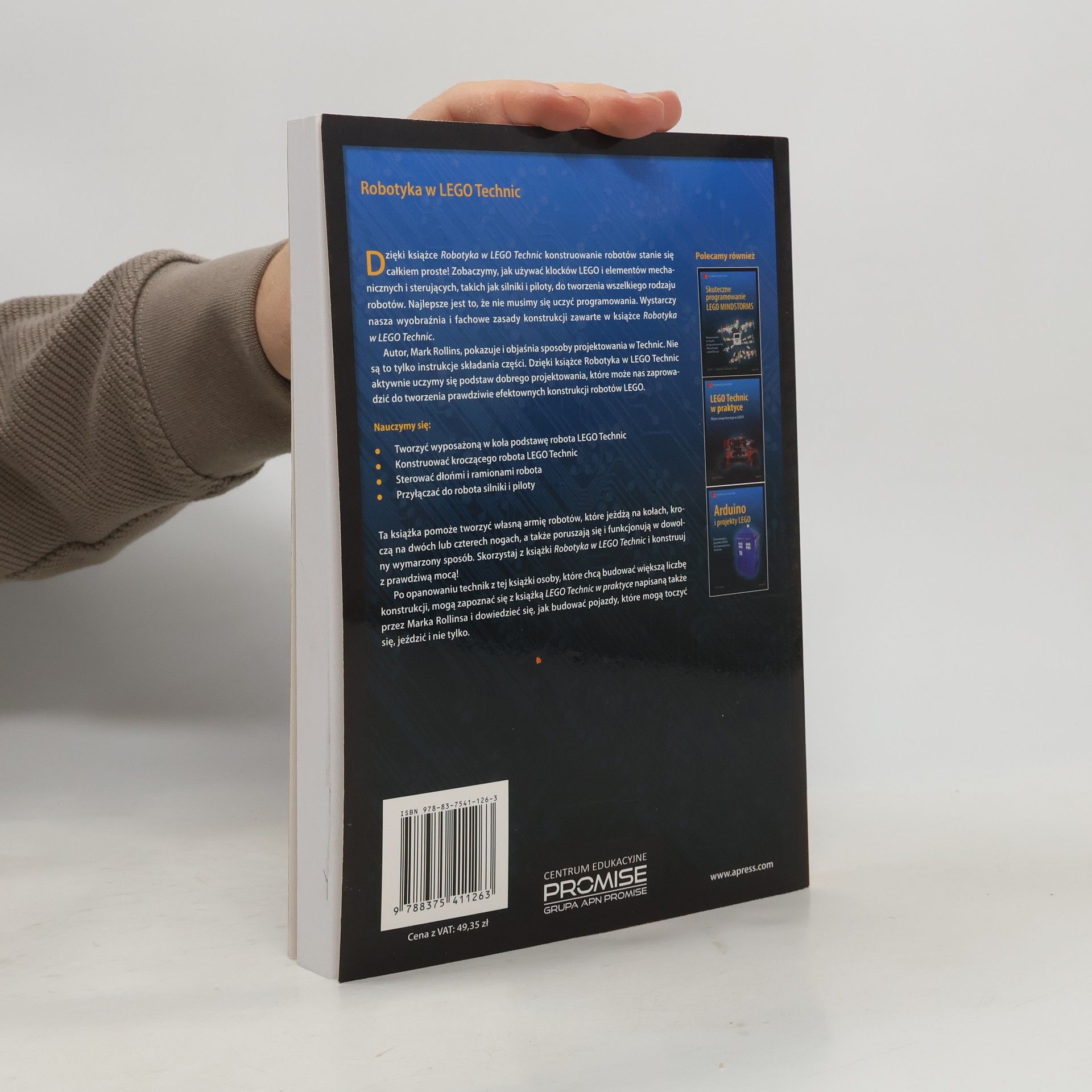 Dzięki książce Robotyka w LEGO Technic konstruowanie robotów stanie się całkiem proste! Zobaczymy, jak używać klocków LEGO i elementów mechanicznych i sterujących, takich jak silniki i piloty, do tworzenia wszelkiego rodzaju robotów. Najlepsze jest to, że nie musimy się uczyć programowania. Wystarczy nasza wyobraźnia i fachowe zasady konstrukcji zawarte w książce Robotyka w LEGO Technic.Autor, Mark Rollins, pokazuje i objaśnia sposoby projektowania w Technic. Nie są to tylko instrukcje składania części. Dzięki książce Robotyka w LEGO Technic aktywnie uczymy się podstaw dobrego projektowania, które może nas zaprowadzić do tworzenia prawdziwie efektownych konstrukcji robotów LEGO.Nauczymy się:• Tworzyć wyposażoną w koła podstawę robota LEGO Technic• Konstruować kroczącego robota LEGO Technic• Sterować dłońmi i ramionami robota• Przyłączać do robota silniki i pilotyTa książka pomoże tworzyć własną armię robotów, które jeżdżą na kołach, kroczą na dwóch lub czterech nogach, a także poruszają się i funkcjonują w dowolny wymarzony sposób. Skorzystaj z książki Robotyka w LEGO Technic i konstruuj z prawdziwą mocą!Po opanowaniu technik z tej książki osoby, które chcą budować większą liczbę konstrukcji, mogą zapoznać się z książką LEGO Technic w praktyce napisaną także przez Marka Rollinsa i dowiedzieć się, jak budować pojazdy, które mogą toczyć się, jeździć i nie tylko.