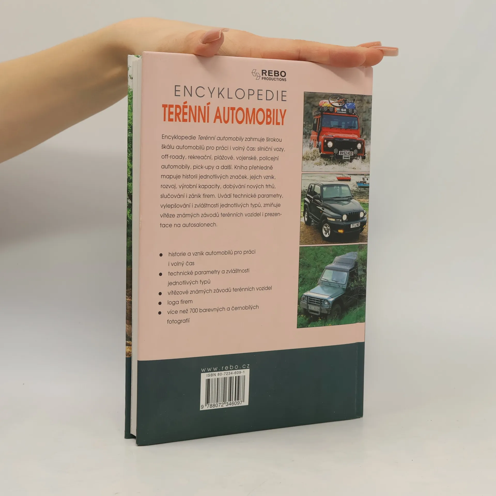 Encyklopedie Terénní automobily zahrnuje širokou škálu automobilů pro práci i volný čas: silniční vozy, off-roady, rekreační, plážové, vojenské, policejní automobily, pick-upy a další. Kniha přehledně mapuje historii jednotlivých značek, jejich vznik, rozvoj, výrobní kapacity, dobývání nových trhů, slučování i zánik firem. Uvádí technické parametry, vylepšování i zvláštnosti jednotlivých typů, zmiňuje vítěze známých závodů terénních vozidel i prezentace na autosalonech.