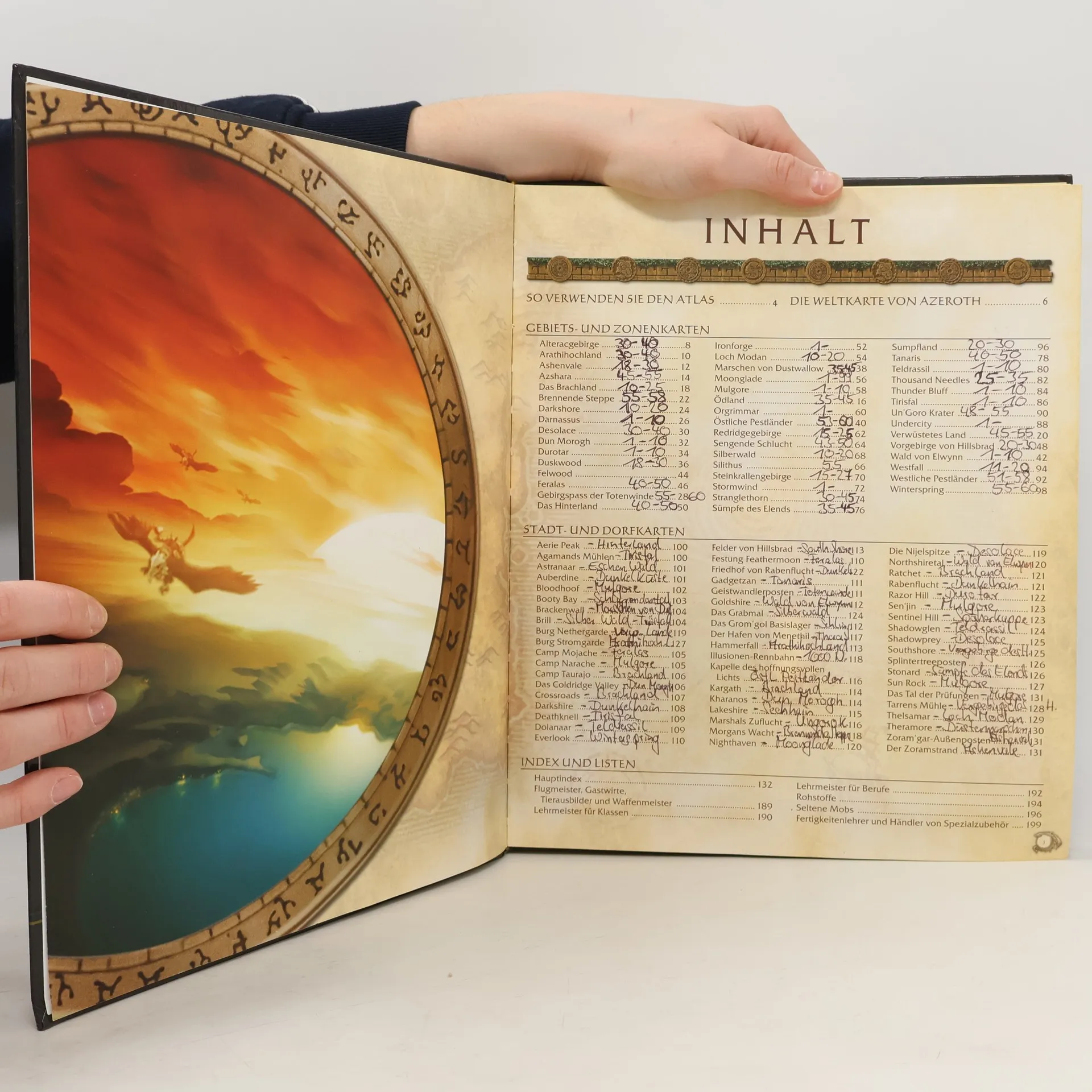 Dieser prächtige Atlas gehört zur Grundausstattung aller WoW-Spieler! Die großen detailreichen Karten zeigen nicht nur Oberflächen, sondern gehen auch in die Tiefe: Auf einen Blick sieht man, was man alles in einer Region oder Stadt meistern muss: alle wichtigen Orte, alle Charaktere, alle NPCs, alle Feinde, alle Mobs, Händler, Lehrer, Läden uvm. Verschiedenste Stichwortverzeichnisse mit unglaublich vielen Querverweisen bieten beste Orientierung: zu jeder Zeit, an jedem Ort, in jeder MMPORG -Lage.