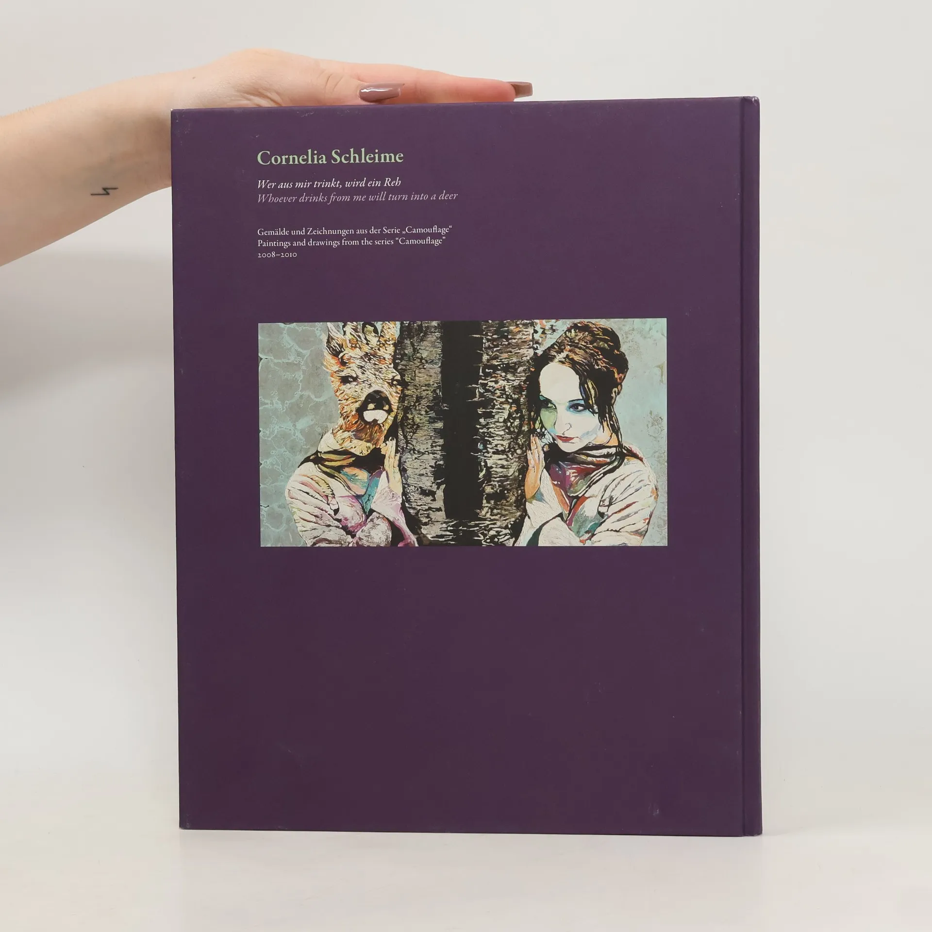 Die Bildnisse Cornelia Schleimes besitzen die erstaunliche Eigenschaft, den Blick des Betrachters intensiv zu erwidern. Die auf den ersten Blick befremdlichen Gemälde und Zeichnungen ihrer neusten Werkgruppe „Camouflage“ zeigen nun Bildnisse auf ganz neue, radikale Weise: Mensch und Tier verbinden sich zu fantastischen zoomorphen Mischwesen. Ohne Bezüge zu Mythologie, Religion oder der Kulturgeschichte zoomorpher Mischwesen kann Cornelia Schleimes neue Werkgruppe vielmehr als Versuchsreihe über die Möglichkeiten und Grenzen des Bildnisses betrachtet werden. Der Titel verweist auf Techniken der Tarnung und Verschleierung: Die Frauen in den „Camouflage“-Bildern verbergen sich in ihren animalischen Metamorphosen. Wovor sie Schutz suchen, bleibt offen. Sicher ist nur, sie betreiben kein kokettes Versteckspiel, dessen Ziel im Entdecktwerden liegt.