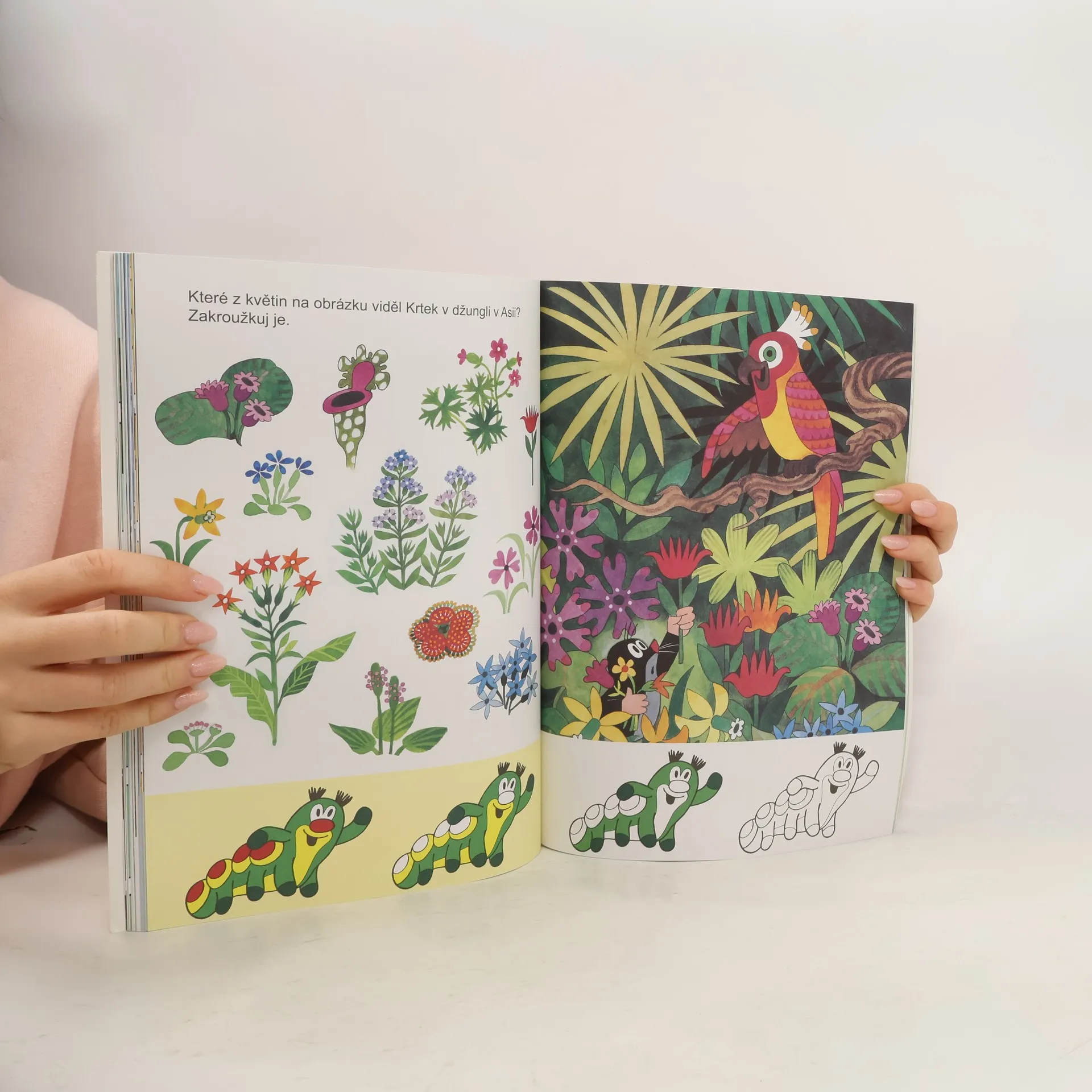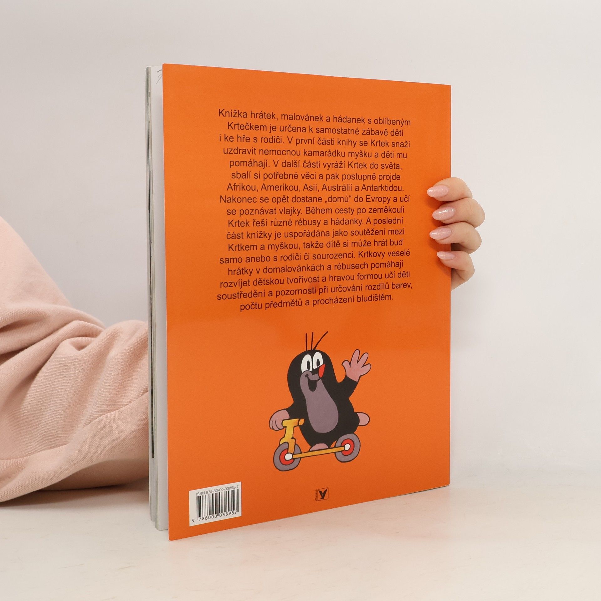 Knížka hrátek, malovánek a hádanek s oblíbeným Krtečkem je určena k samostatné zábavě dětí i ke hře s rodiči. V první části knihy se Krtek snaží uzdravit nemocnou kamarádku myšku a děti mu pomáhají, v další části vyráží Krtek do světa, sbalí si potřebné věci a pak postupně projde Afrikou, Amerikou, Asií, Austrálií a Antarktidou. Nakonec se opět dostane '''domů''' do Evropy a učí se poznávat vlajky. Během cesty po zeměkouli Krtek řeší různé rébusy a hádanky. A poslední část knížky je uspořádána jako soutěžení mezi Krtkem a myškou, takže dítě si může hrát buď samo anebo s rodiči či sourozenci. Krtkovy veselé hrátky v domalovánkách a rébusech pomáhají rozvíjet dětskou tvořivost a hravou formou učí děti soustředění a pozornosti při určování rozdílů barev, počtu předmětů a procházení bludištěm.