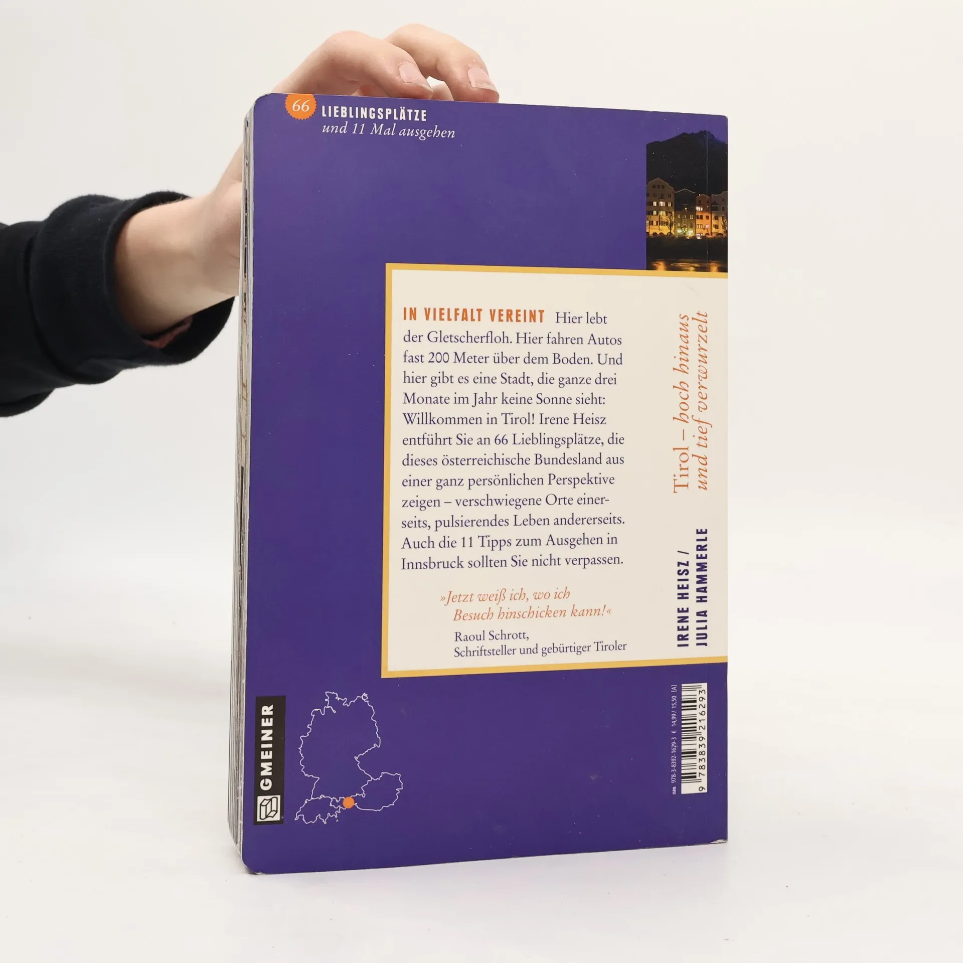 Hier lebt der Gletscherfloh. Hier fahren Autos fast 200 Meter über dem Boden. Und hier gibt es eine Stadt, die ganze drei Monate im Jahr keine Sonne Willkommen in Tirol! Irene Heisz entführt Sie an 66 Lieblingsplätze, die dieses österreichische Bundesland aus einer ganz persönlichen Perspektive zeigen - verschwiegene Orte einerseits, pulsierendes Leben andererseits. Folgen Sie der Autorin „in“ die Fasnacht, zur Badewanne der Philippine Welser und in das kopfstehende Haus. Wenn Sie dabei Hunger bekommen, sollten Sie die 11 Tipps zum Ausgehen in Innsbruck nicht verpassen.
