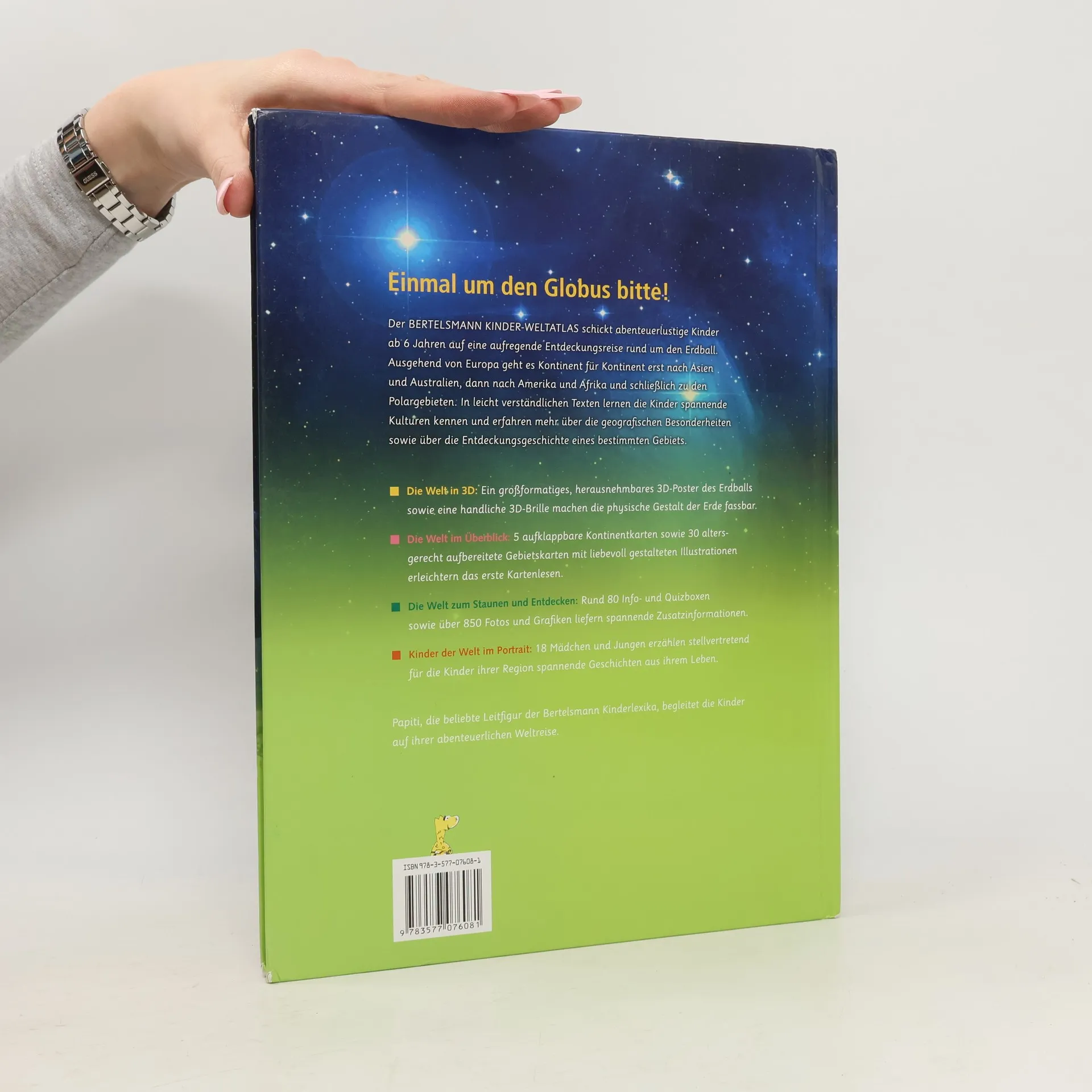 Der Bertelsmann Kinder Weltatlas schickt wissbegierige Kinder ab 6 Jahren auf eine aufregende Entdeckungsreise rund um den Globus. Die Reise startet in Europa und geht dann Kontinent für Kontinent erst nach Asien und Australien, dann Amerika und Afrika und schließlich zu den Polargebieten der Erde. Altersgerechte Texte begleiten die Reise und stellen die Kulturen, geographische Gegebenheiten sowie spannende Entdeckungsgeschichten einzelner Länder und Gebiete vor.