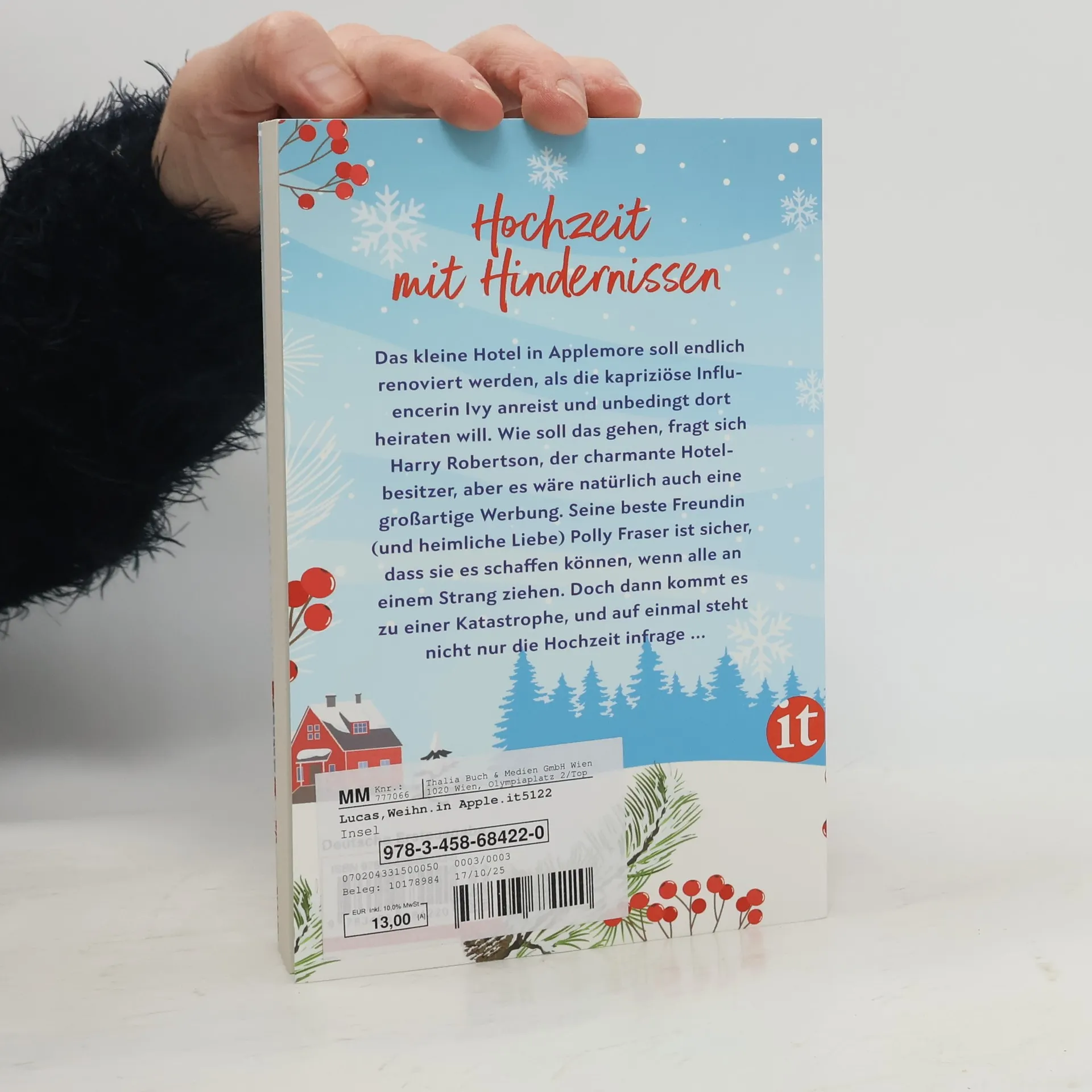 Eine Hochzeit mit Hindernissen Harry Robertson, charmant und gutaussehend, ist fest entschlossen, sein kleines Hotel in Applemore zu einem Erfolg zu machen. Er will es groß umbauen, wenn die Hauptsaison zu Ende geht – das Hotel wird über den Winter geschlossen bleiben. Doch dann reist die kapriziöse, erfolgreiche Influencerin Ivy mit ihrem Verlobten Ben an und wünscht sich nichts sehnlicher, als in dem Hotel zu heiraten, das ihre Großeltern so geliebt haben. Harry ist hocherfreut, aber es gibt ein kleines Problem: Ivy hat sich eine Hochzeit an Weihnachten in den Kopf gesetzt – und was Ivy will, bekommt sie auch, Umbau hin oder her. Und natürlich wäre es auch eine grandiose Werbung für das Hotel. Harrys beste Freundin (und heimlich verliebt in ihn) ist Polly Fraser. Sie versichert ihm, dass sie es schaffen können, ein unvergessliches Fest zu bereiten, wenn alle an einem Strang ziehen – mit dem Hofladen, der Gärtnerei, der Bäckerei für die Hochzeitstorte. Doch dann kommt es zu einer Katastrophe, und auf einmal steht nicht nur die Hochzeit in Frage …