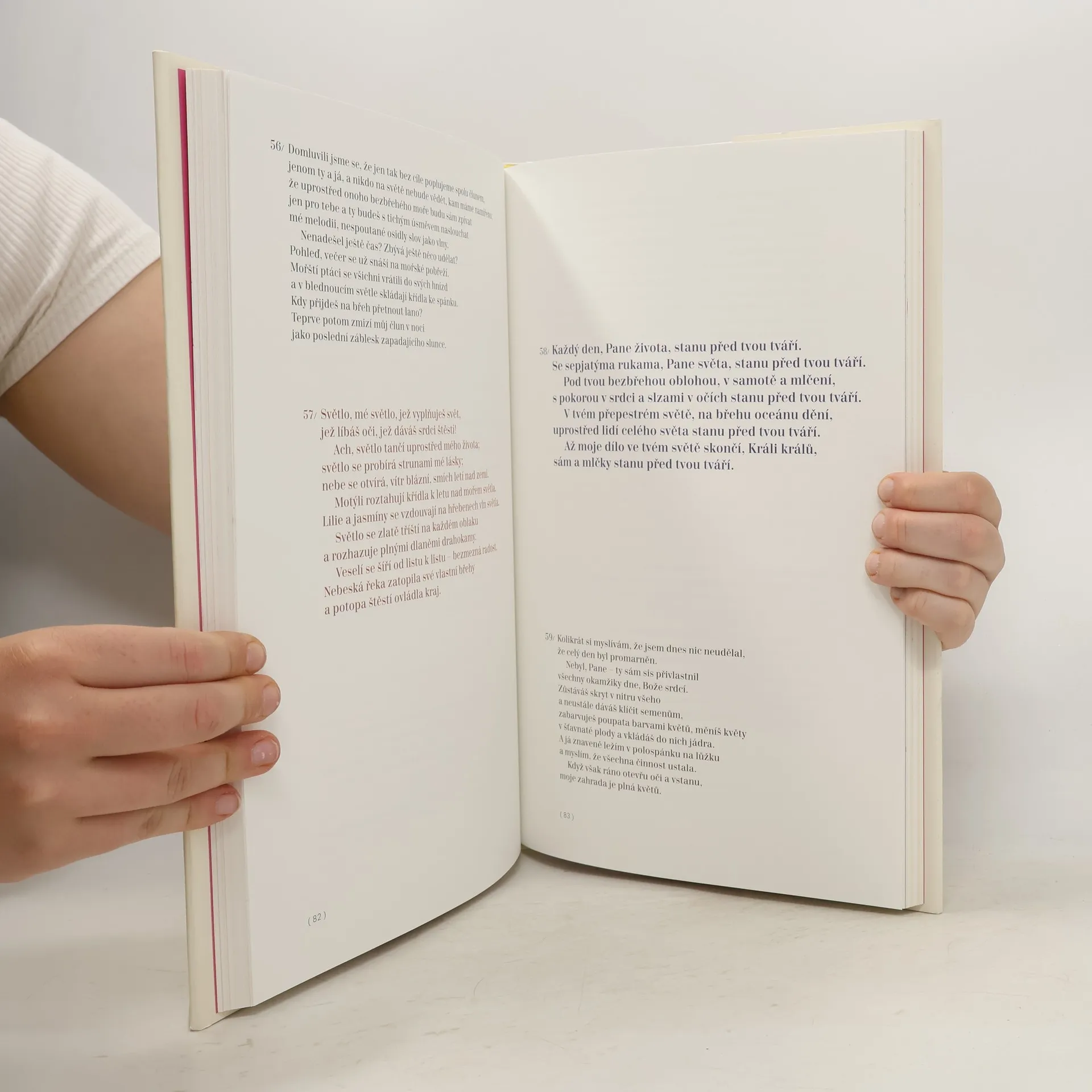 Výbor z bengálské duchovní lyriky, původně autorem přeložený do angličtiny a r. 1913 poctěný Nobelovou cenou. Nový český překlad se proti prvnímu překladu F. Baleje přidržuje po formální stránce Thákurova anglického převodu, v němž bengálský básník, povídkář, romanopisec a dramatik nahradil písňovou, rýmovanou a rytmicky sevřenou formu originálu prózou, ale obsahově se obrací k původním bengálským předlohám ze sbírek Gítáňdžali, Naibedja,Gítimálja, Khejá, Sišu, Čaitáli a Kalpaná. pozn.: Pevná, kožená vazba s kartonovým přebalem.