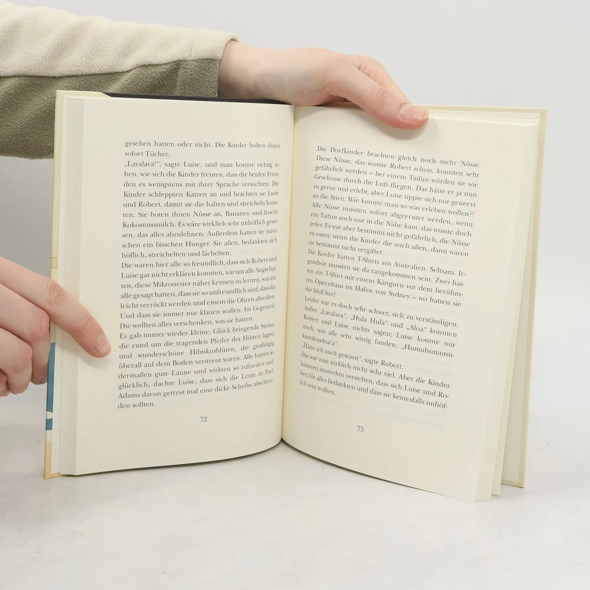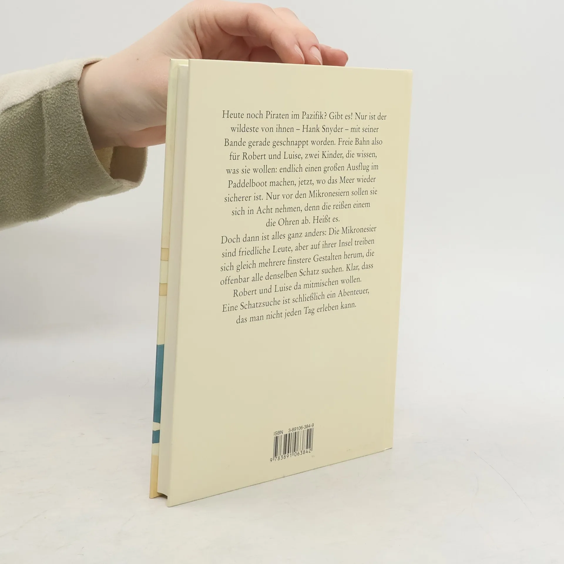 Eine Piratengeschichte aus der Gegend, in der auch die berühmte „Schatzinsel“ spielt. Vom Autor der Käpt'n Blaubär-Geschichten erzählt, ist darin natürlich nicht alles ganz ernst zu nehmen. Heute noch Piraten im Pazifik? Gibt es! Nur ist der wildeste von ihnen - Hank Snyder - mit seiner Bande gerade geschnappt worden. Freie Bahn also für Robert und Luise, zwei Kinder, die wissen, was sie wollen: endlich einen großen Ausflug im Paddelboot machen, jetzt, wo das Meer wieder sicherer ist. Die Eltern geben nach, weil ihnen auch gar nichts anderes übrig bleibt bei Robert und Luise. Nur vor den Mikronesiern sollen sie sich in Acht nehmen, denn die reißen einem die Ohren ab. Heißt es. Robert und Luise paddeln trotzdem zu der nächsten mikronesischen Insel. Und da sich dort mehrere finstere Gestalten herumtreiben, die offenbar alle denselben Schatz suchen, ist klar, dass Robert und Luise nicht gleich wieder nach Hause fahren können. Selbst wenn eine dieser Gestalten doch der berüchtigte Hank Snyder sein sollte. Das ist, wie nicht anders zu erwarten, alles sehr gefährlich, aber auch ziemlich komisch. Und weil das bei Piratengeschichten so sein muss, gibt es ein Happyend.