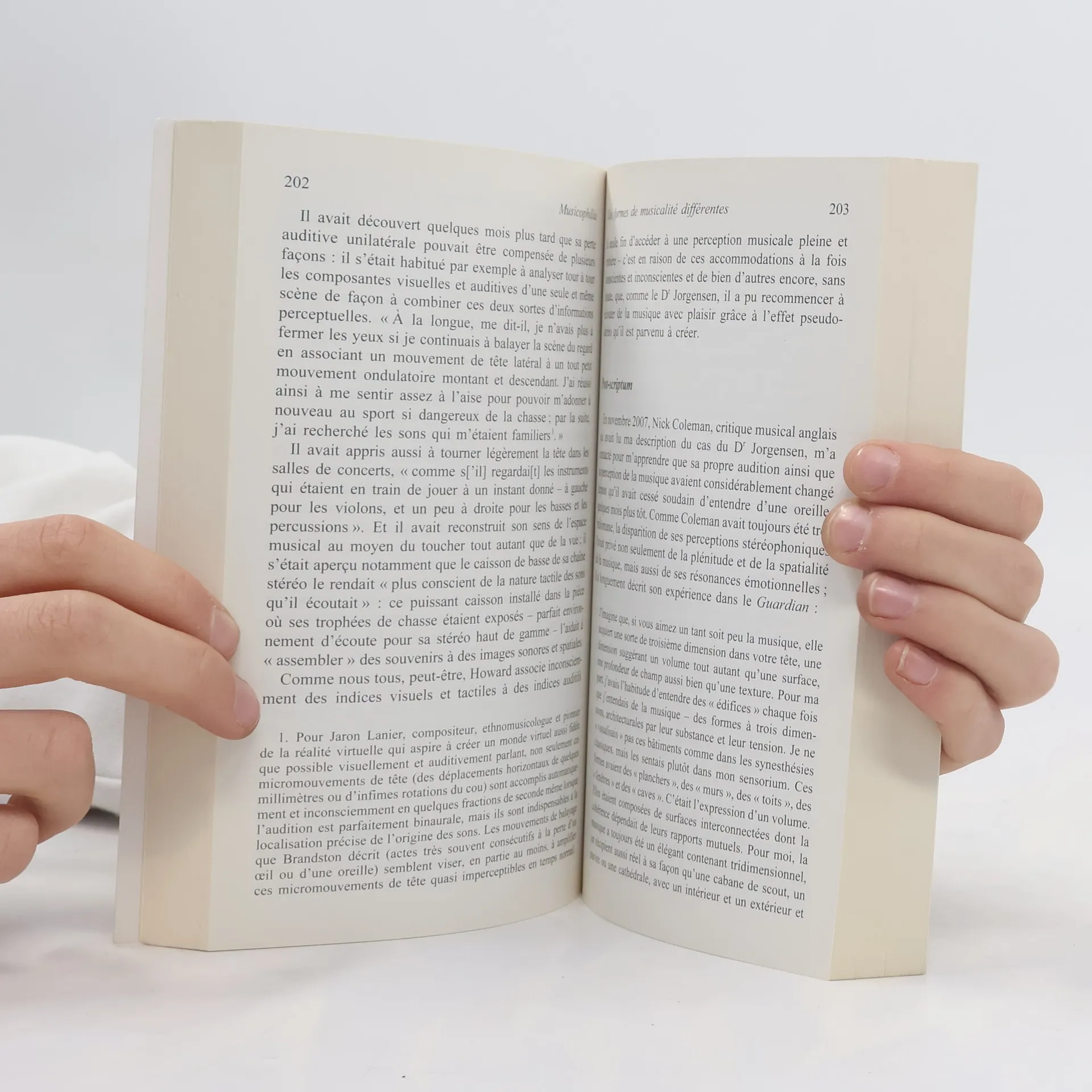 La musique peut nous émouvoir, nous inciter à danser, ou nous rendre tristes et nostalgiques. Quand on est un neurologue aussi compétent qu'Oliver Sacks, et surtout mélomane de longue date, comment peut-on comprendre et décrire ce pouvoir ? Plus d'aires cérébrales sont affectées au traitement de la musique qu'à celui du langage : l'homme est donc véritablement une espèce musicale. Et c'est en déployant une galerie de portraits - du chirurgien devenu pianiste après avoir été frappé par la foudre au frère manchot de Wittgenstein, en passant par les handicapés mentaux mélomanes - que l'auteur questionne les rapports du cerveau et de la musique. Notre dimension musicale est ici décrite dans son étendue et sa profondeur, d'un point de vue scientifique, philosophique et spirituel.