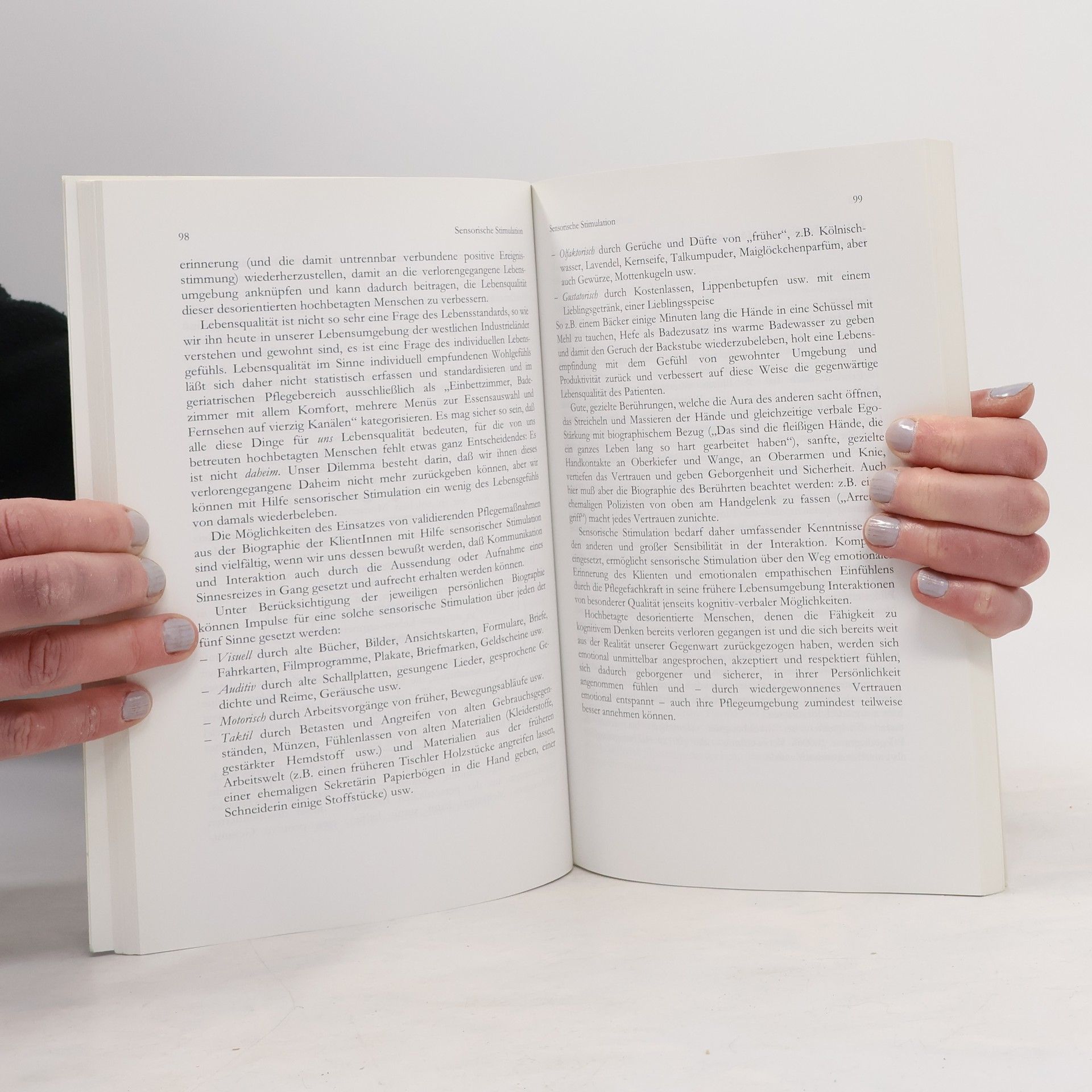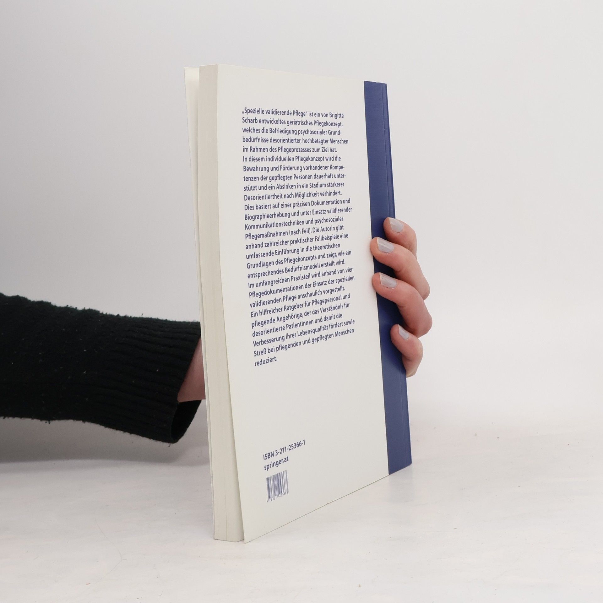 Die „Spezielle validierende Pflege“ ist ein von Brigitte Scharb entwickeltes geriatrisches Pflegemodell zur Befriedigung psychosozialer Grundbedürfnisse desorientierter, hochbetagter Personen. In diesem individuellen Pflegekonzept wird die Bewahrung und Förderung vorhandener Kompetenzen der Klienten dauerhaft unterstützt und ein Absinken in ein Stadium stärkerer Desorientiertheit nach Möglichkeit verhindert. Dies basiert auf einer präzisen Dokumentation und Biographieerhebung und unter Einsatz validierender Techniken bzw. Pflegemaßnahmen (nach Naomi Feil). Die Autorin gibt anhand zahlreicher praktischer Fallbeispiele eine umfassende Einführung in die theoretischen Grundlagen des Pflegemodells und zeigt, wie ein entsprechendes Bedürfnismodell erstellt wird. Für den neu gestalteten Praxisteil wurden vier ausführliche Dokumentationsbeispiele herangezogen, die in Aufbau, Methodik und fachlicher Umsetzung den gegenwärtigen Stand praktischer Anwendung Spezieller validierender Pflege anschaulich darlegen.