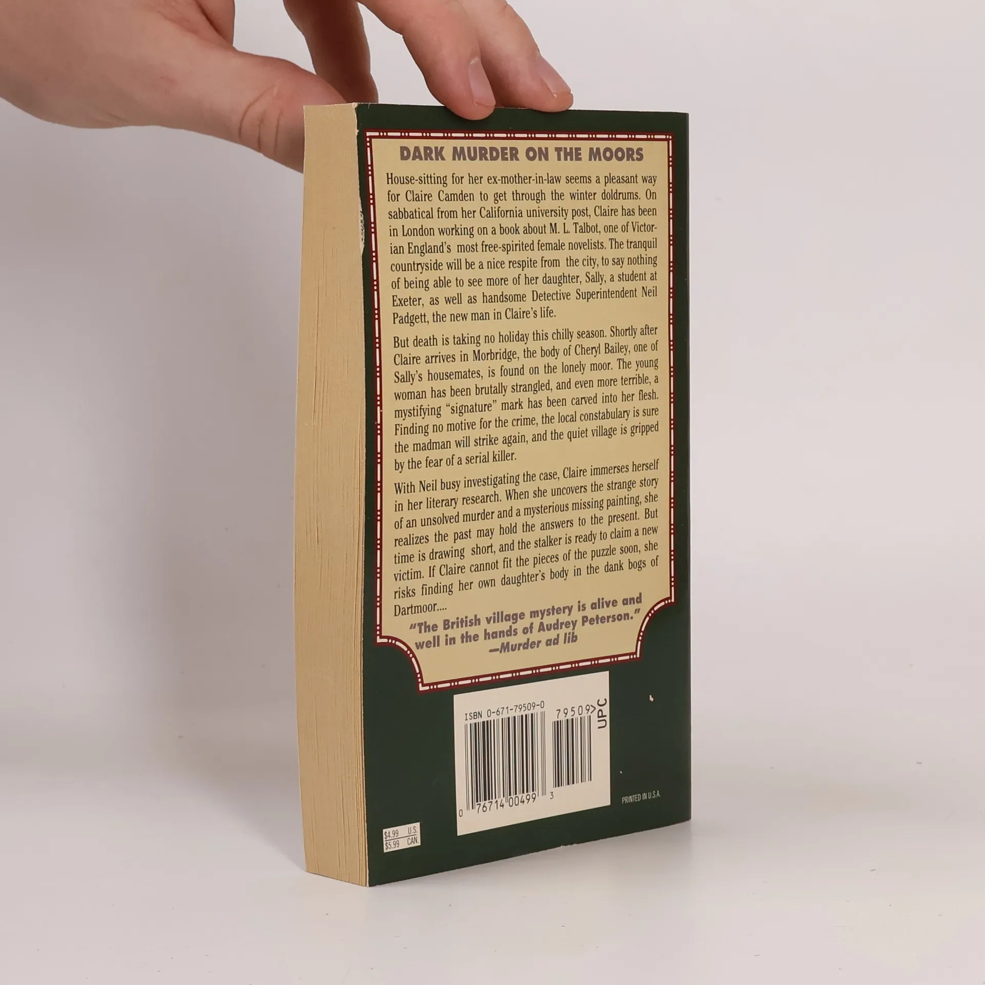 House-sitting for her ex-mother-in-law seems like a pleasant way for Claire Camden to spend the winter while on sabbatical from her California university. Working on a book about Victorian novelist M. L. Talbot, Claire looks forward to the peaceful countryside and spending time with her daughter, Sally, a student at Exeter, and handsome Detective Superintendent Neil Padgett. However, tranquility is shattered when Cheryl Bailey, one of Sally's housemates, is found brutally strangled on the moor, with a disturbing "signature" mark carved into her flesh. The local police, unable to find a motive, fear a serial killer is on the loose, casting a shadow over the quiet village. While Neil investigates, Claire delves into her literary research and uncovers a strange tale of an unsolved murder and a missing painting, suggesting that the past might hold clues to the current horror. As time runs out and the stalker threatens to claim another victim, Claire must piece together the puzzle quickly to prevent a tragedy that could hit too close to home, risking her own daughter's life in the process.