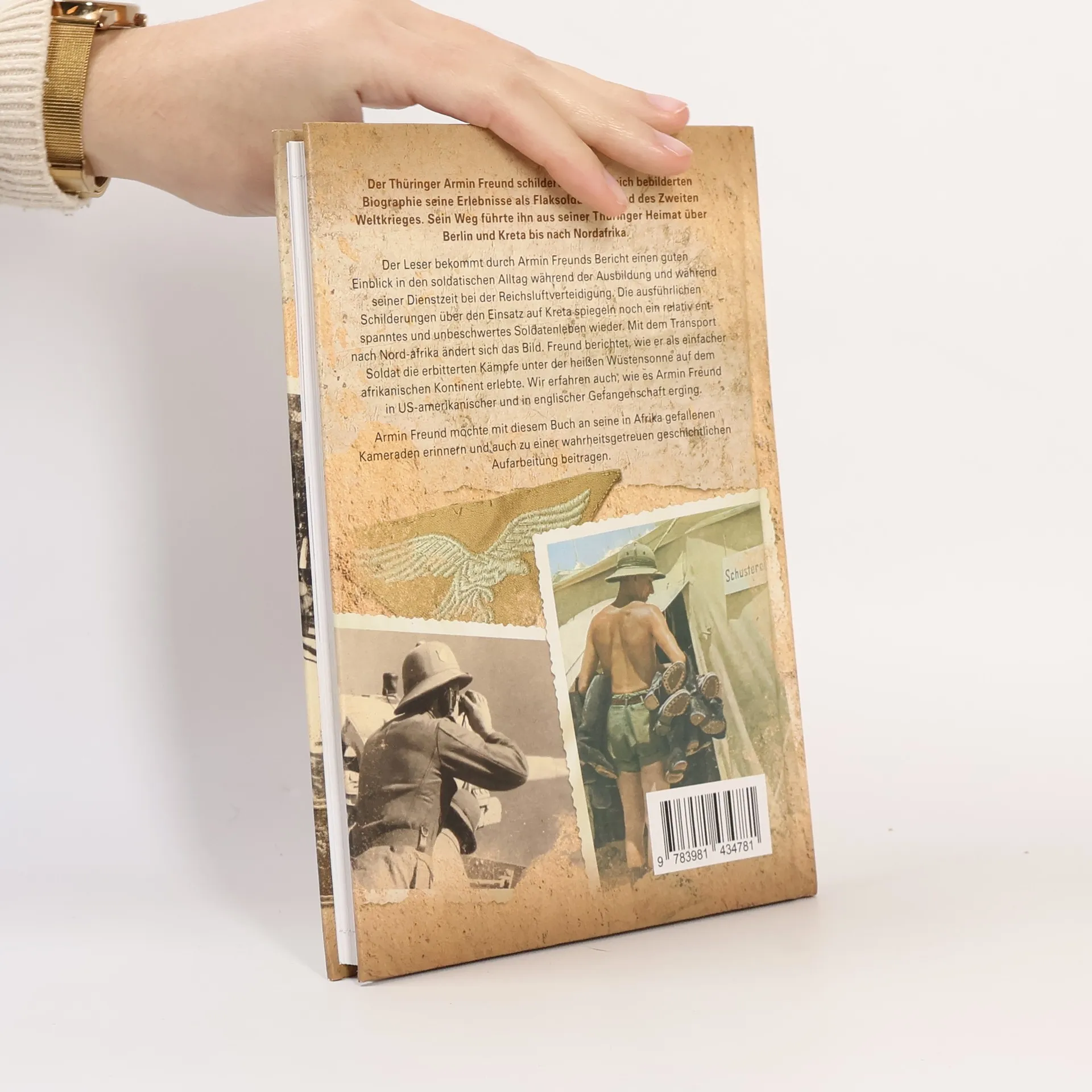 Armin Freund, ein Thüringer, beschreibt in seiner reich bebilderten Biographie seine Erlebnisse als Flaksoldat im Zweiten Weltkrieg. Sein Weg führt ihn von Thüringen über Berlin und Kreta bis nach Nordafrika. Freund gewährt Einblicke in den soldatischen Alltag während seiner Ausbildung und Dienstzeit bei der Reichsluftverteidigung. Die Schilderungen des Einsatzes auf Kreta zeigen ein relativ entspanntes Soldatenleben, das sich mit dem Transport nach Nordafrika drastisch ändert. Er berichtet von den erbitterten Kämpfen unter der heißen Wüstensonne und seinen Einsätzen in Tobruk, Derna und Bengasi. Der Afrikafeldzug endet für ihn in Gefangenschaft und Internierung in den USA, über die er ebenfalls ausführlich berichtet und Einblicke in den Alltag von Kriegsgefangenen gibt. Freund möchte mit diesem Buch seinen gefallenen Kameraden in Afrika gedenken und zur wahrheitsgetreuen geschichtlichen Aufarbeitung beitragen. Ein Geleitwort von Rudolf Schneider, dem persönlichen Fahrer von Erwin Rommel, ergänzt die Erzählung. Die Biographie umfasst 128 Seiten mit zahlreichen unveröffentlichten s/w-Abbildungen, Dokumenten und Faksimiles, gedruckt auf hochwertigem Bilderdruckpapier, in einem festen Einband mit Fadenheftung und Spotlackveredelung. € 17,80.