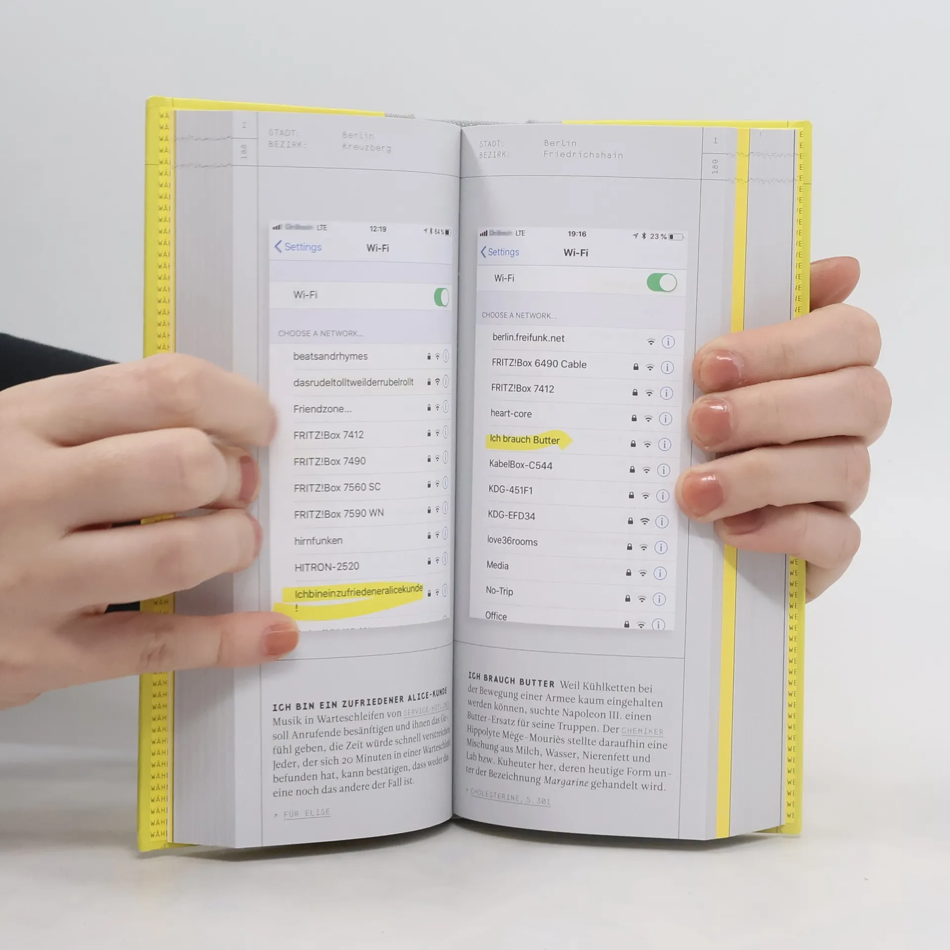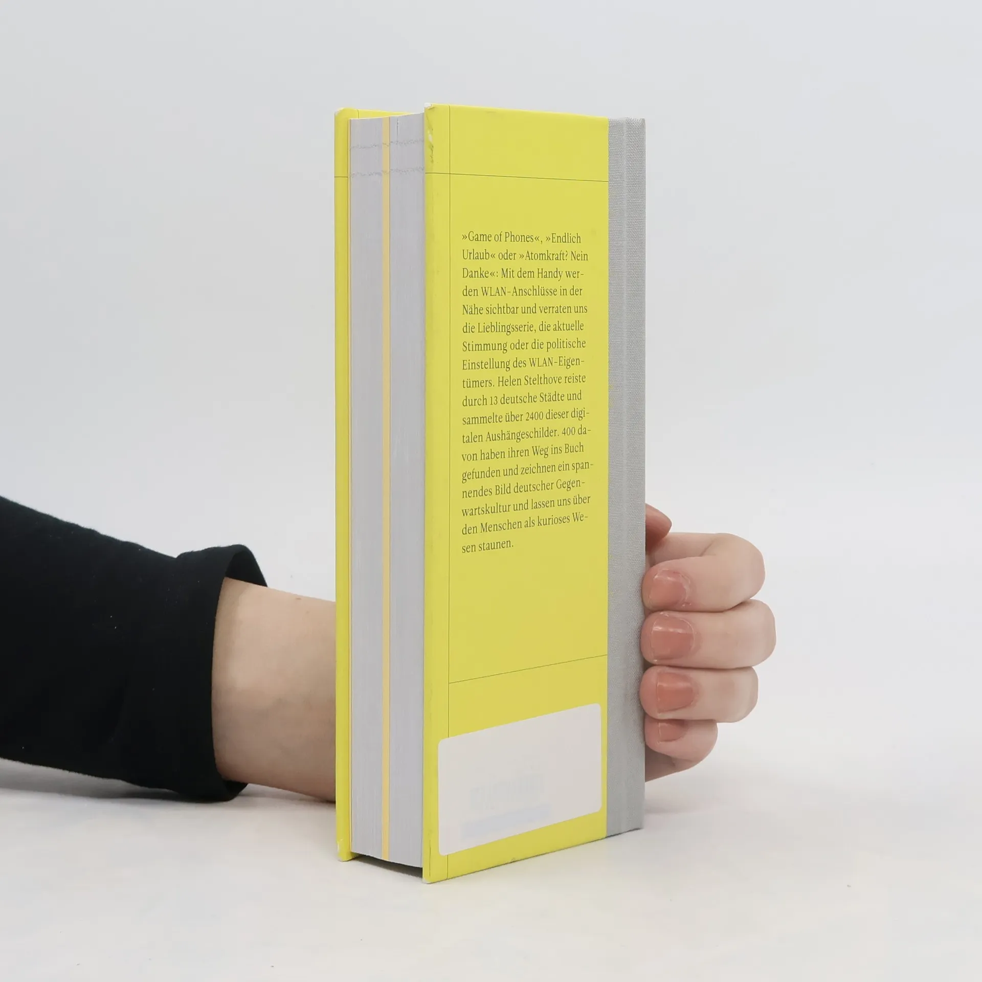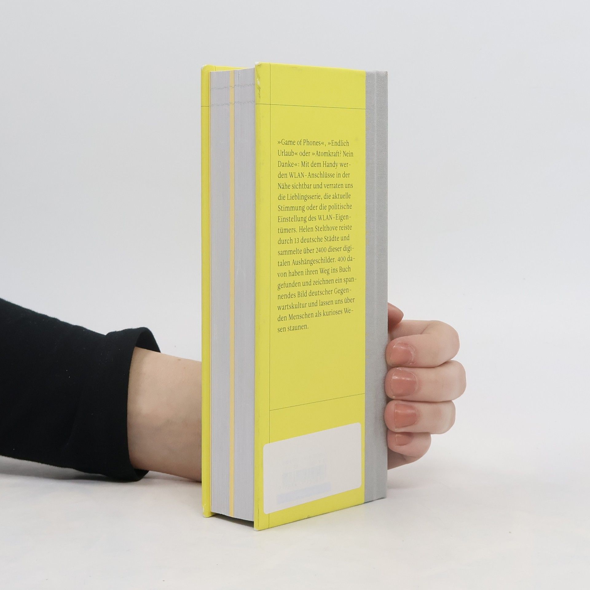 »Game of Phones«, »Endlich Urlaub« oder »Atomkraft? Nein Danke«: Mit dem Handy werden WLAN-Anschlüsse in der Nähe sichtbar und verraten uns die Lieblingsserie, die aktuelle Stimmung oder die politische Einstellung des WLAN-Eigentümers. Helen Stelthove reiste durch 13 deutsche Städte und sammelte über 2400 dieser digitalen Aushängeschilder. 400 davon haben ihren Weg ins Buch gefunden und zeichnen ein spannendes Bild deutscher Gegenwartskultur und lassen uns über den Menschen als kurioses Wesen staunen.
