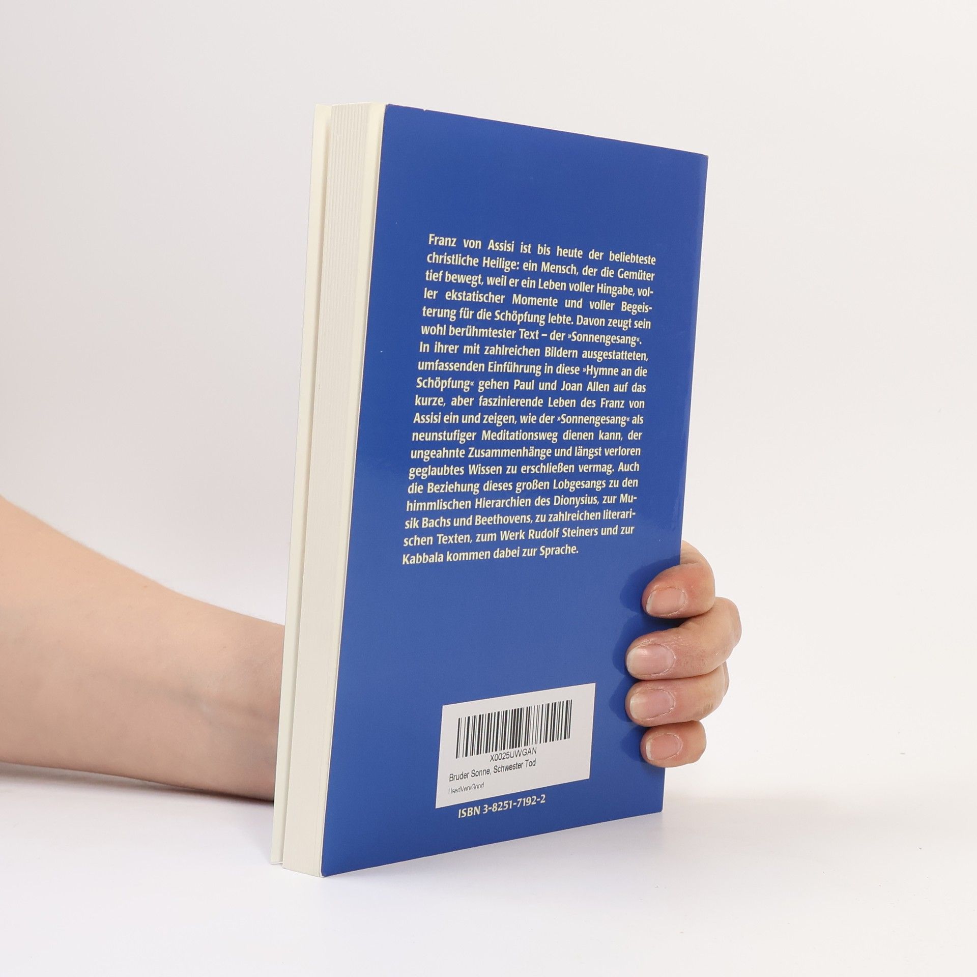Aus dem Inhalt: Franz von Assisi; die frühen Jahre / Der spirituelle und geschichtliche Hintergrund / Rittertum des Mitleidens: Das Damaskus-Erlebnis / Franz von Assisi und die Geschöpfe der Erde / Der Berg in Flammen / Die Geburt des Sonnengesangs / Die Welt der himmlischen Hierarchien / Der Sonnengesang: ein lebendiger Organismus / Der neunstufige Weg des Sonnengesangs heute: 1. Bruder Sonne - Seraphim, 2. Schwester Mond - Cherubim, 3. Schwester Sterne - Throne, 4. Brüder Wind und Luft - Herrschaften, 5. Bruder Feuer - Gewalt, 7. Schwester Erde - Fürstentümer, 8. Alle, welche verzeihen und ertragen - Erzengel, 9. Schwester Tod - Engel