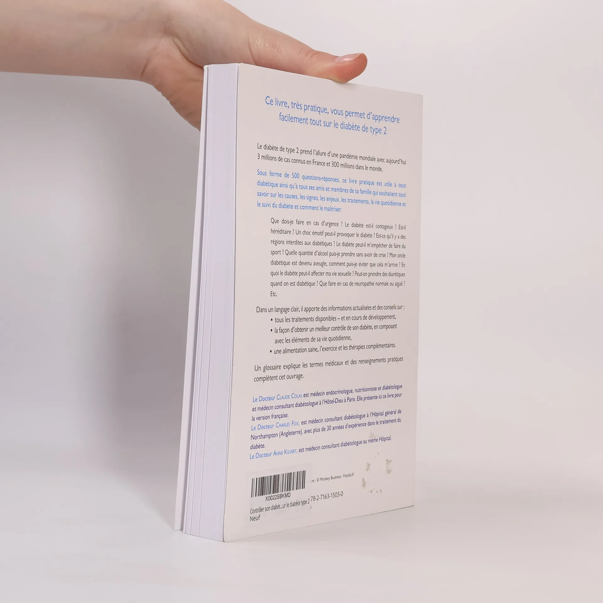 Le diabète est classifié en deux types : le type 1, touchant généralement des jeunes ayant un poids insuffisant et nécessitant un traitement immédiat à l'insuline, et le type 2, concerné par des personnes souvent en surpoids, généralement plus de 30 ans, qui peuvent être traitées par un régime et des comprimés, sans nécessité d'insuline dans les premières années. Ce guide, destiné aux diabétiques de type 2, est une référence mise à jour par des diabétologues expérimentés. Présenté sous forme de 500 questions-réponses, il aborde en termes simples tout ce qu'un diabétique, sa famille et les professionnels de santé doivent savoir sur les causes, les symptômes, les traitements et la gestion quotidienne du diabète. Il répond à des questions pratiques telles que les gestes à adopter en cas d'urgence, la contagiosité du diabète, les restrictions géographiques, l'impact sur le sport et la consommation d'alcool, ainsi que les préoccupations liées à la santé visuelle et à la vie sexuelle. Un glossaire des termes médicaux et des informations pratiques complètent cet ouvrage, permettant aux lecteurs de maîtriser leur condition et de vivre pleinement.