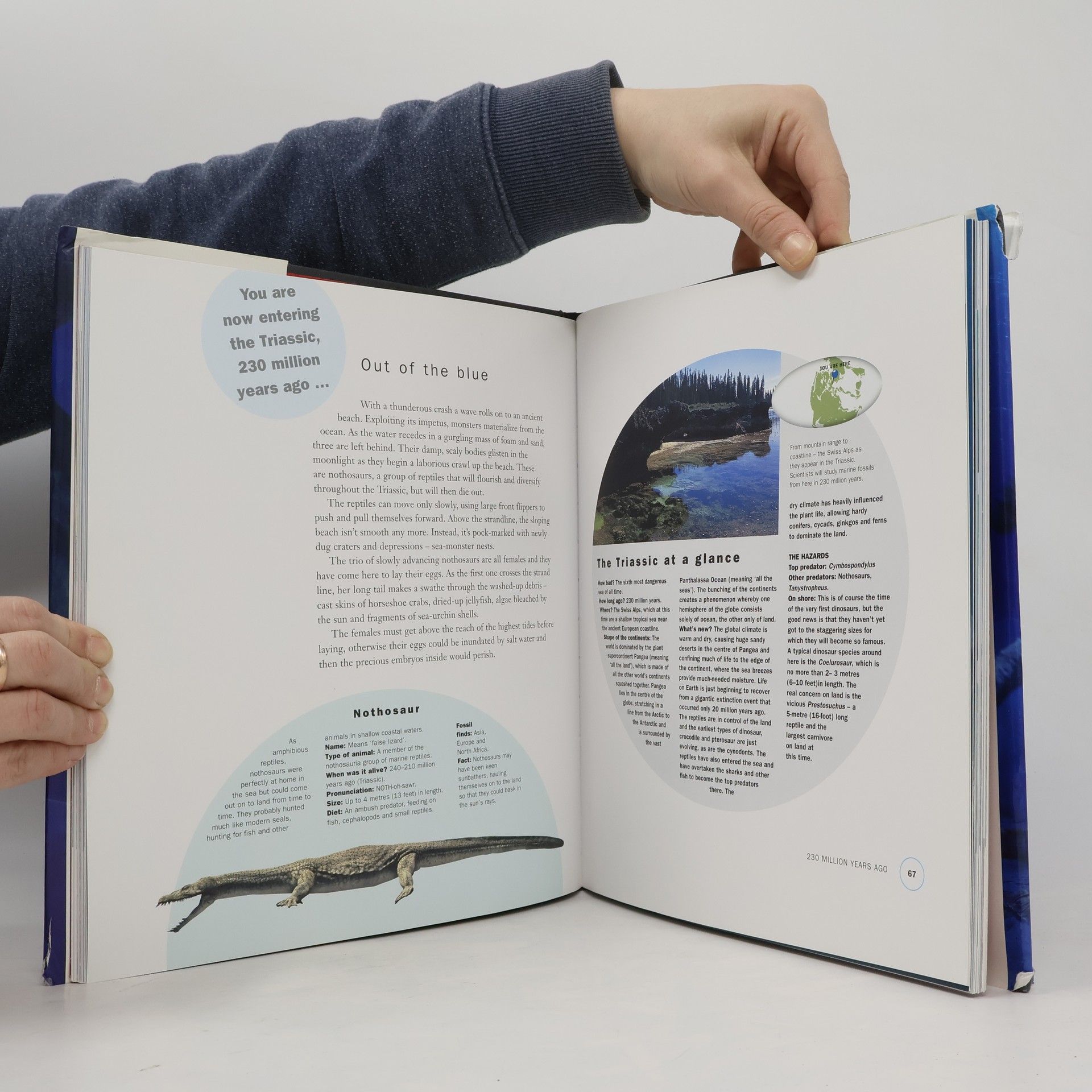 Sea Monsters is the book version of the latest offering from the BBC TV "Walking With" series, except that this one is really "Diving with Sea Monsters". It has all the ingredients we have come to expect, especially the superb computer graphics that really bring these extinct beasts to life and the numerous gobsmacking colour plates. The sleek bodies of these sea creatures lend themselves particularly well to the technique. They look extraordinarily convincing as they have a go at presenter Nigel Marven in his armoured diving suit and metal cage. Written by the well-known TV presenter Nigel Marven and producer/director Jasper James, Sea Monsters tells the story of a huge range of extinct beasts from Ordovician times, through some 450 million years of geological time and the evolution of marine life. Although the first life on Earth was aquatic, for the first four billion and more years it was all microscopic. About 600 million years ago sea creatures began to get bigger but none of them was anything much more than a metre in length until Ordovician and Silurian times when the marine arms race began with both predators and prey increasing significantly in size. Things got really interesting in Devonian times when some bizarre fish evolved as active predators including the spectacularly ferocious nine-metre long Dunkleosteus.