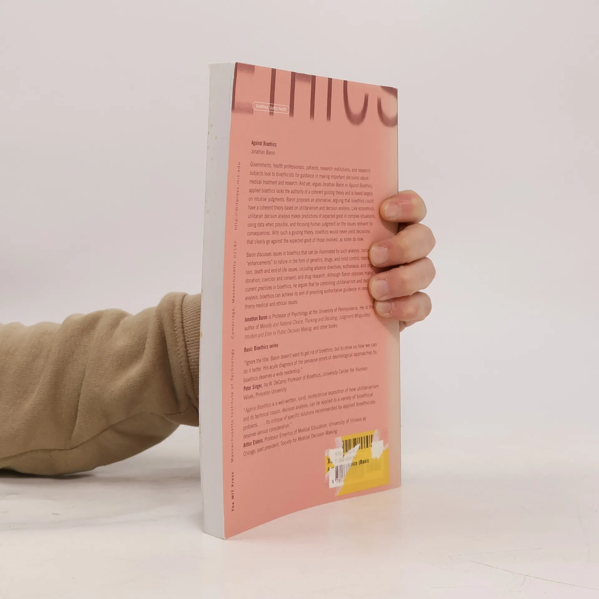 Governments, health professionals, patients, research institutions, and researchsubjects look to bioethicists for guidance in making important decisions about medical treatment andresearch. And yet, argues Jonathan Baron in Against Bioethics, applied bioethics lacks the authorityof a coherent guiding theory and is based largely on intuitive judgments. Baron proposes analternative, arguing that bioethics could have a coherent theory based on utilitarianism anddecision analysis. Utilitarianism holds that the best option is the one that does the most expectedgood. Decision analysis provides a way of thinking about the risks and trade-offs of specificoptions. Like economics, utilitarian decision analysis makes predictions of expected good in complexsituations, using data when possible, and focusing human judgment on the issues relevant toconsequences. With such a guiding theory, bioethics would never yield decisions that clearly goagainst the expected good of those involved, as some do now.Baron discusses issues in bioethics thatcan be illuminated by such analysis, including "enhancements" to nature in the form of genetics,drugs, and mind control; reproduction; death and end-of-life issues, including advance directives,euthanasia, and organ donation; coercion and consent; conflict of interest and the reform ofinternal review boards; and drug research. Although Baron opposes current practice in bioethics, heargues that by combining utilitarianism and decision analysis, bioethics can achieve its aims ofproviding authoritative guidance in resolving thorny medical and ethical issues.