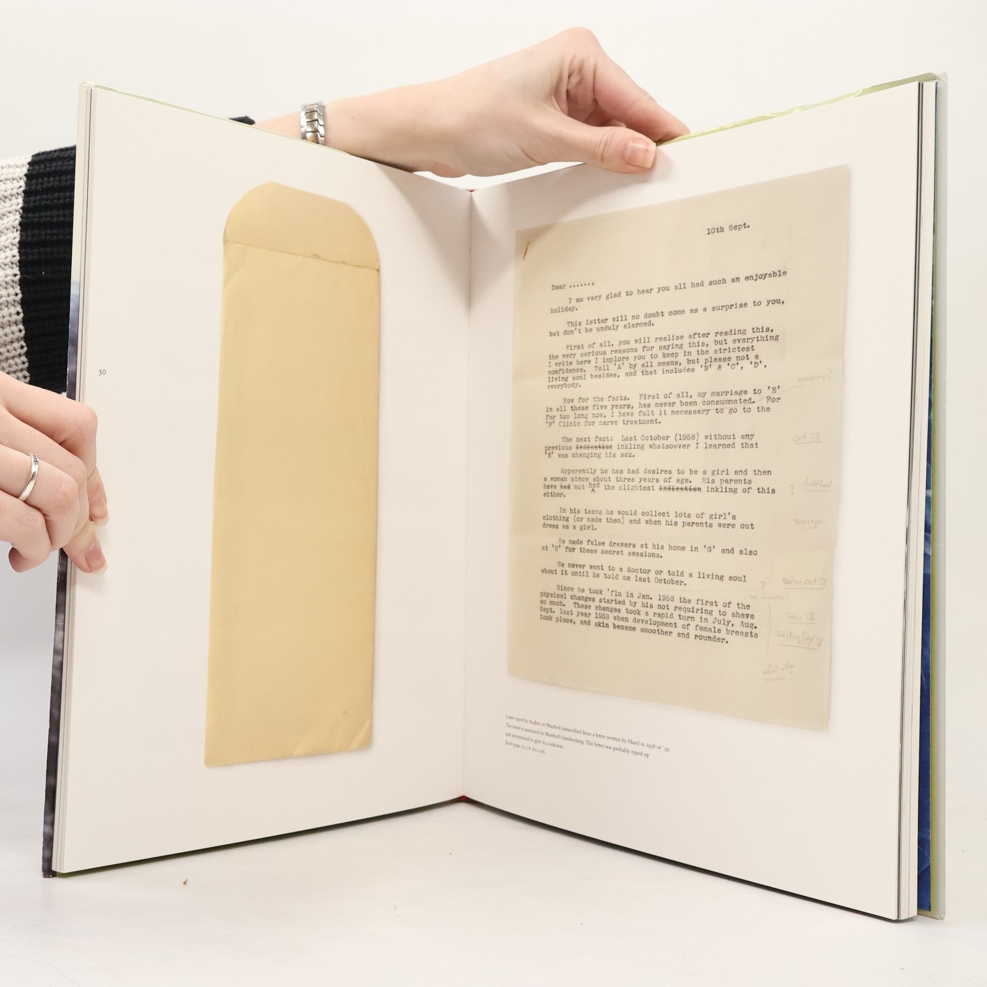 This project began with an archive and a discovery. Sara Davidmann and her siblings inherited letters and photographs from their uncle and aunt, Ken and Hazel Houston, through their mother, Audrey Davidmann. The letters detail Ken and Hazel's relationship, revealing that Ken, an optician in Edinburgh, was transgender, a fact that profoundly impacted their marriage and social interactions in 1950s Britain. Despite this, they remained together from 1954 until Ken’s death and had no children. The archive includes correspondence between Hazel and Audrey in the late 1950s and early 60s, documenting their private lives. While Ken publicly identified as a man, he lived as a woman at home. In response to the letters and family photographs, Sara Davidmann created a new series of photographs using various techniques, including analogue and digital processes. Reflecting on the vintage photographs, she noted the significance of their surfaces, where time and damage had left marks. This realization inspired her to alter the surfaces of her new photographs with ink, chalks, hand coloring, and other materials. Through series such as ‘The Dress’, ‘Closer’, ‘Dealt with in Scotland’, and ‘Looking for K/Finding K’, Davidmann explores the intersection of art practice and archival investigation.
