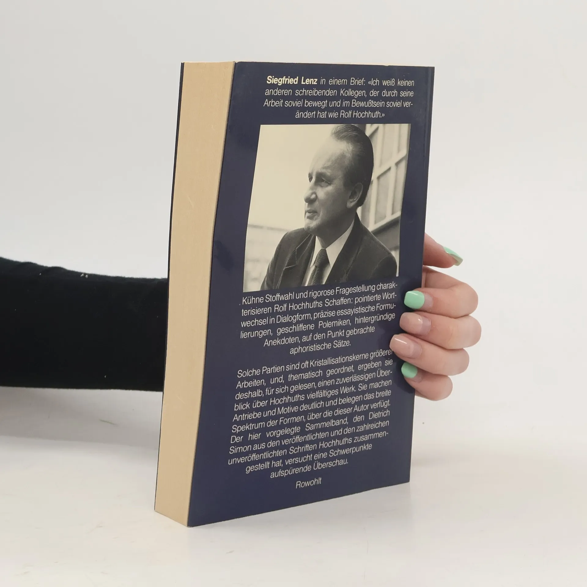 Kühne Stoffwahl und rigorose Fragestellung chrakterisieren Rolf Hochhuths Schaffen: pointierte Wortwechsel in Dialogform, präzise essayistische Formulierungen, hintergründige Anekdoten, auf den Punkt gebrachte aphoristische Sätze.