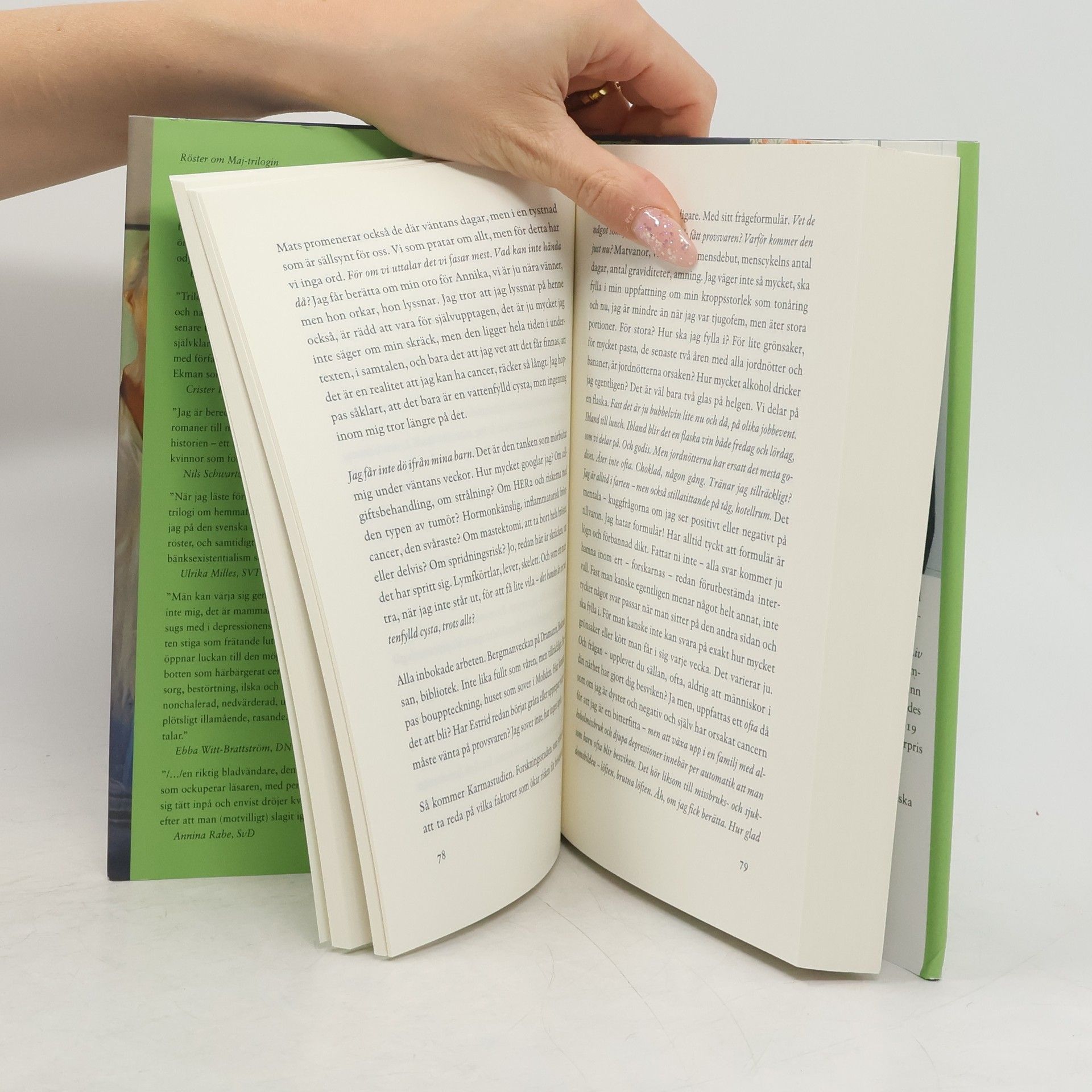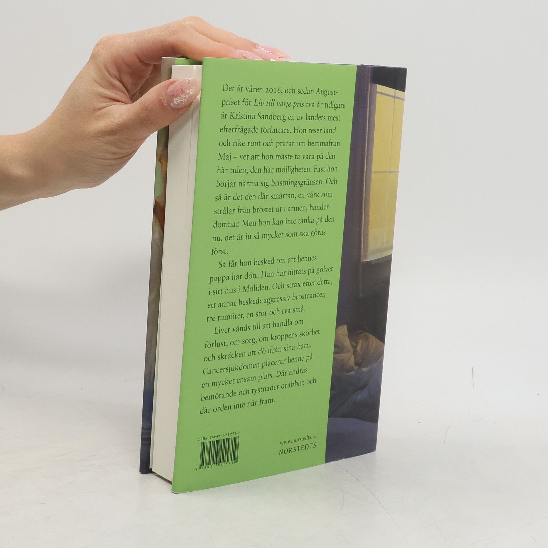 Det är våren 2016 och efter Augustpriset till romanen Liv till varje pris två år tidigare har Kristina Sandberg blivit en av landets mest efterfrågade författare. Hon vet att hon måste ta vara på den här tiden fast hon börjar känna sig på bristningsgränsen. Och så är det den där smärtan, en värk som strålar från bröstet ut i armen, handen domnar. Men hon skjuter upp mammografitiden, det är ju så mycket som ska göras först, texter som ska skrivas, resan med familjen till Cornwall, och så är hon inbjuden till Bergmanveckan på Fårö. Hon befinner sig i ett slags utmattningens frenesi, men vet att hon snart ska få vara ledig. Så kommer ett samtal. Hennes pappa har dött. Han har hittats på golvet i sitt hus i Moliden. Och strax efter detta kommer hennes egen dom: aggressiv bröstcancer, tre tumörer, en stor och två små. Livet vänds till att handla om förlust, om sorg, om kroppens skörhet och skräcken att dö från sina barn. Kristina Sandbergs självbiografiska skildring av denna tid är en stark, djupt gripande och inträngande text. Den blickar också tillbaka på uppväxten i 1970-talets Sundsvall. På trådarna bakåt i släkten och allt som går förlorat när hon tillsammans med sin syster måste sälja det som också varit faderns föräldrahem. Men framför allt handlar det om hur cancersjukdomen placerar henne på en mycket ensam plats. Där andras bemötande och tystnader drabbar, där orden inte når fram.